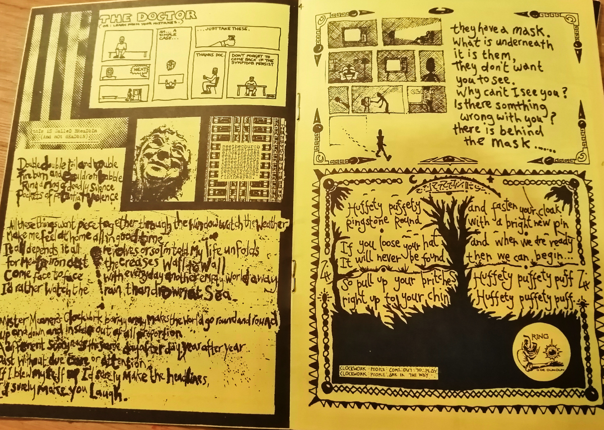 The classic Ring album, Nervous Recreation, a piece of treasure from way back there, back from when releasing your album on cassette tape was the only real option rather than the fashion statement it is now, has just been re-issued. Originally released back in 1989 (and available back in those early days as one of the very early first moves of what would become Organ’s offshoot record label ORG Records). Ring were excellent, they were a slightly rougher, slightly punkier, slighty more little brother clown infested version of Cardiacs, they came from the same Southern English suburbia as Cardiacs, they knew the little man with his whole world window but they were far far more than jsut a clone. The two bands played some excellent shows together, worked with each other, Ring would often be seen on the free festival or the squat gig scenes, brilliants adventures in all kinds of places. Actually Ring were probably somewhere in that gap between Here And Now and Cardiacs, maybe a touch of Gong and with just that little bit of magic dust, sprinkled by the twisted Crowman, that was something all of their own.