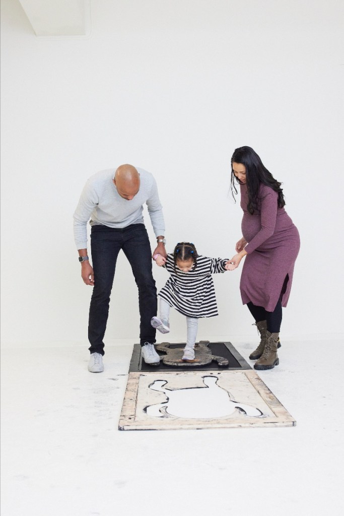 “Every workshop participant (age 2 – 11) will lift one of the inked rubber stamps featuring STIK’s minimalist ‘stick man’ figures onto 100% wove hemp paper jumping, stomping and stamping to create their own unique version of the monochrome print to take home. The artworks are produced using raw, industrial materials in a human scale in reference to Brutalist principles. Each print will also be photographed to become part of an extended version of the animation currently on screens throughout the Southbank Centre. The rubber stamps will be destroyed at the end of the nine-day workshop making this a one-off opportunity for children to have fun, learn and take home their own collaborative STIK artwork.
