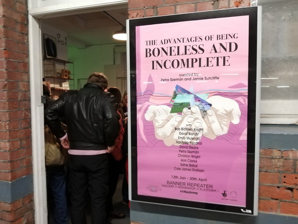 And There was the show at the very rarely open Banner Repeater art space – is it a gallery? Is it a shop? It could be so exciting, an art space right there on the busy platform at Hackney Downs railway station and an opening on the same Friday night as the Guts Gallery opening. Banner Repeater was, well shall we just be polite about it and say it was frustrating? That place could be so much more exciting, engaging (surely art should want to engage? Surely that is it?), Banner Repeater could be so much more exciting and engaging than it actually is, but then it does feel like art really doesn’t want to engage that much this days over here in East London. Lot of talking it more than walking it at the moment, all wordy press releases and very little in terms of substance to back it all up. There was one or two interesting films at the Banner Repeater thing – there is art happening right there as the trains are stopping and starting, as passengers are busy changing platforms, it could be so much more! We’re trying to cram into small room on the platform, a small room with a bottleneck of an entrance, it isn’t easy to get in, it isn’t comfortable once you do, pretty much impossible actually and although this show of seven films is on at the space for ages, the place is, frustratingly, besides this opening night on a cold Friday in early January, only open by appointment and not to the passing passengers. The show is called The Advantages Of Being Boneless And Incomplete and it goes on in the space until April 30th and well if only is was open and you could just drop in as you were changing trains? How brilliantly engaging would that be? But art doesn’t really want to engage, it just wants exist in those often aloof bubbles, that art school bubble, that Art Council academic bubble. It feels elite, unfriendly, aloof and as good as what we could see of a couple of those films were, we really didn’t get to see that much. Banner Repeater has been on that platform for as long as I can remember, passed it a million times, first time I’ve ever seen an open door and a sign of life. And as interesting as Banner Repeater might have been andas strong as that show at Guts Gallery was on that same Friday night, we’re left thinking about how unfriendly and unengaged it all was. No communication, no information, apparently according to Guts, telling people who the paintings on the wall have been painted by is an “old fashioned” idea. Dare we say that it kind of feels like there’s rather a lot of art school bulshit flowing through the much hyped new breed of curators and galleries as well as some who’ve, ah hell, you see why I couldn’t be bothered to post this when I first wrote it, who needs it?