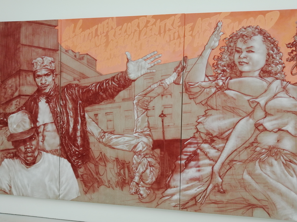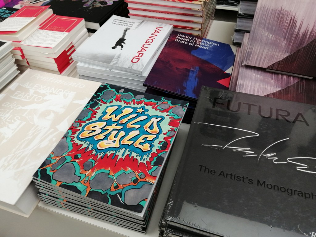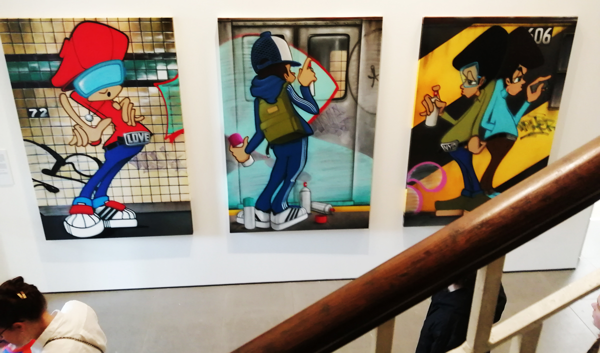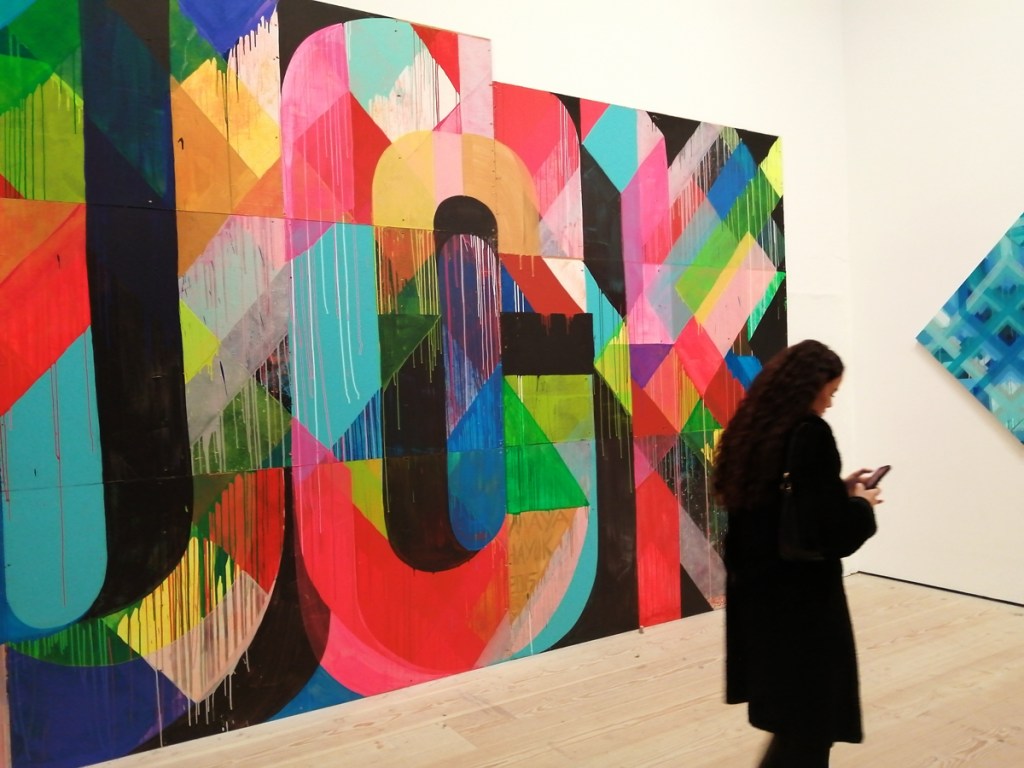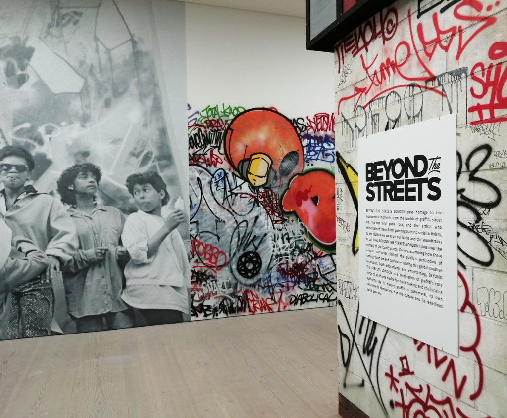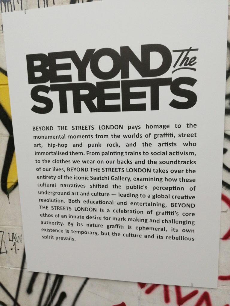 “Following successful exhibitions in Los Angeles & New York, Beyond The Streets London features new works, large-scale installations, original ephemera and extraordinary fashion that capture the powerful impact of graffiti & street art across the world”. The big sign outside on the Kings Road talks of Graffiti, street art, hip hop, punk rock and such – “Curated by graffiti historian Roger Gastman, Beyond The Streets London examines the fundamental human need for public self-expression, highlighting artists with roots in graffiti and street art whose work has evolved into highly disciplined studio practices, alongside important cultural figures inspired by this art scene”.