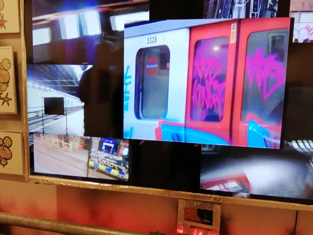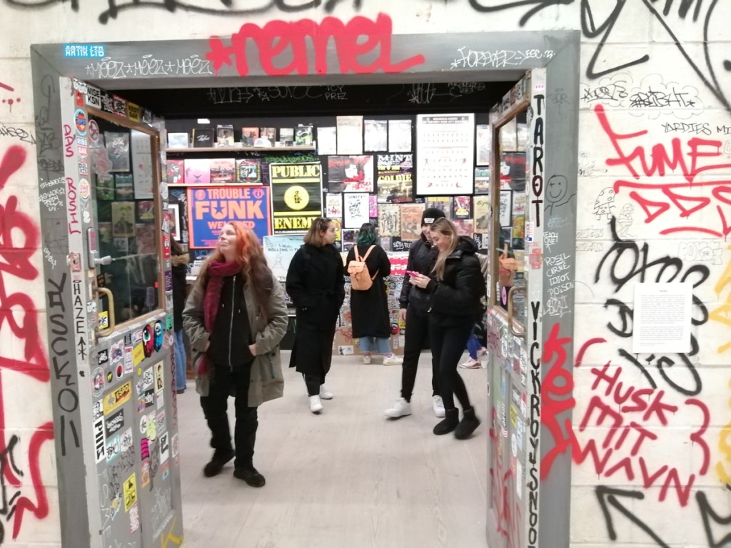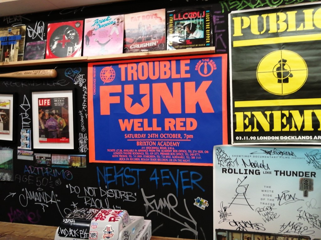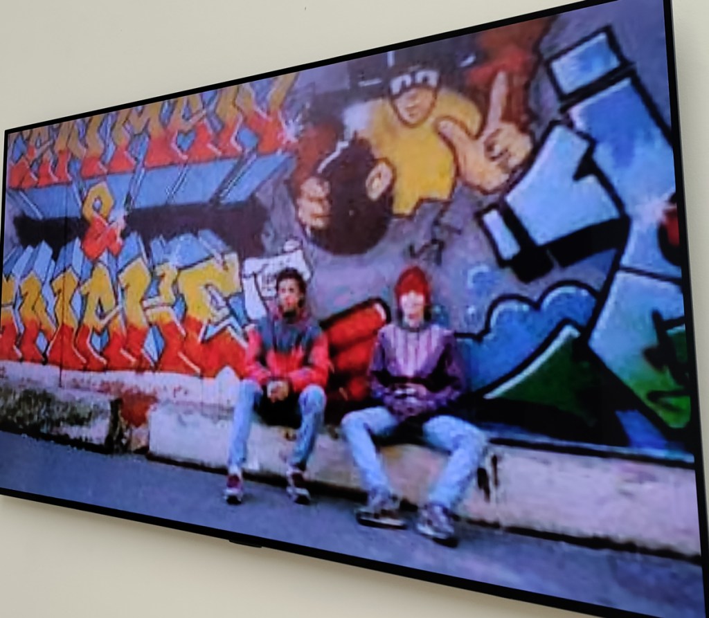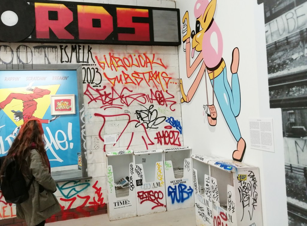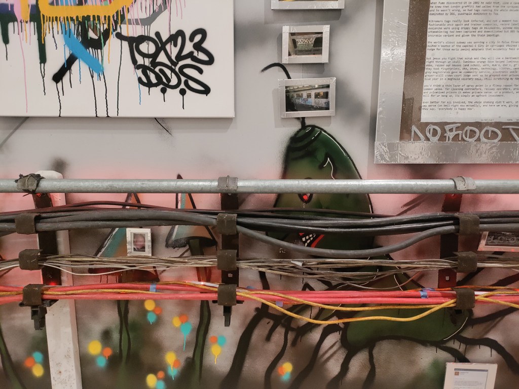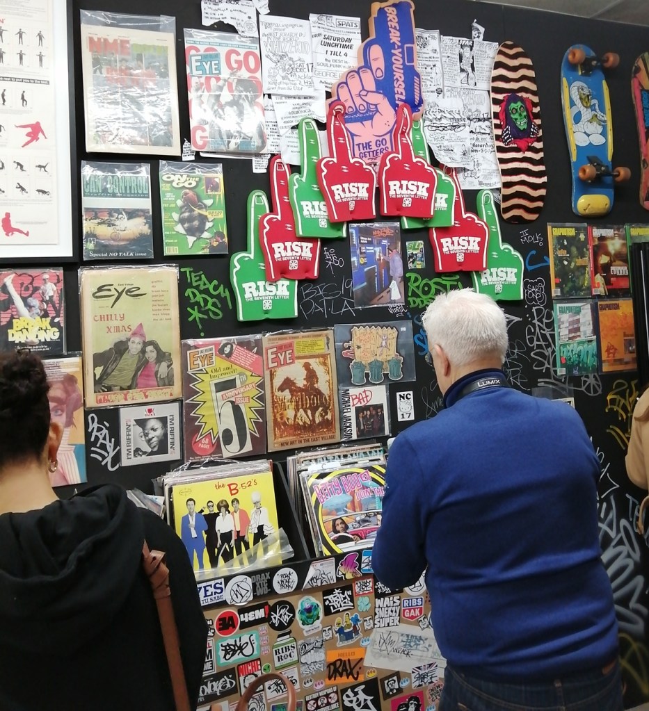 There’s a lot of history here, “the history of self-expression” is a good way of putting it, lots of good stuff, lots of good art, lots of good pieces and posters and cassette tapes, ephemera, bits of cultural treasure, damn good to see early 80’s Covent Garden up there. Covent Garden was important, Alternative Arts and getting there early enough to sign on the list of dancers, crews, or in the case of half of us Organgrinders, Robot teams. Yep, we’re old bastards now, long in the broken tooth, good to see a screen up there showing videos of the dance and writing culture of early 80’s Covent Garden, it was a big big part of the London scene at the time, as was the Capital Hip Hop Jam that the GLC put on down on the Southbank back there (was it raining? Don’t think it was? The trees were certainly full of people trying to find a vantage point), good to see a small poster for the jam on the wall of that record shop installation (should have asked us, we’ve still got the ghetto blaster with all the stickers on it from that day). That record shop installation piece is rather good as well, damn pleased to see a Gunshot record in there, not sure about Skid Row though? Was mid 80’s hair metal ever part of it? And that’s the thing you see, you can go through this and for every “good to see that in here”, there’s a bit of “why is that there?” or a “but where is so and so or thingy?” There’s a Taki 183 tag reproduced, didn’t see a Samo anywhere though… Good to see that Newtrament 12″, last time we saw him he was homeless and living in a tent on a Hackney street, not that long ago actually, hope he’s okay, disappeared when Covid hit us all…