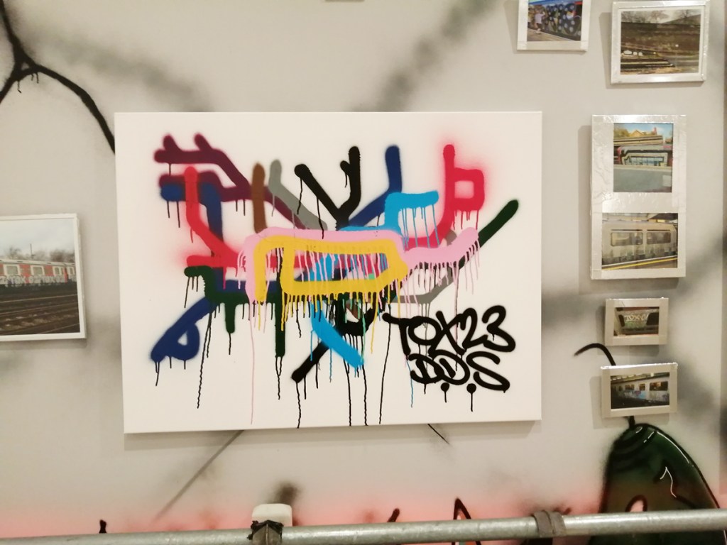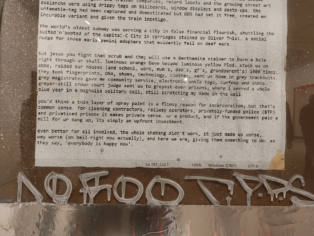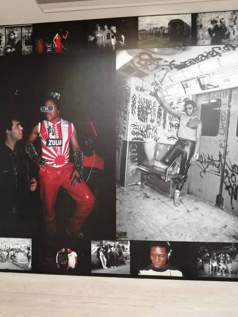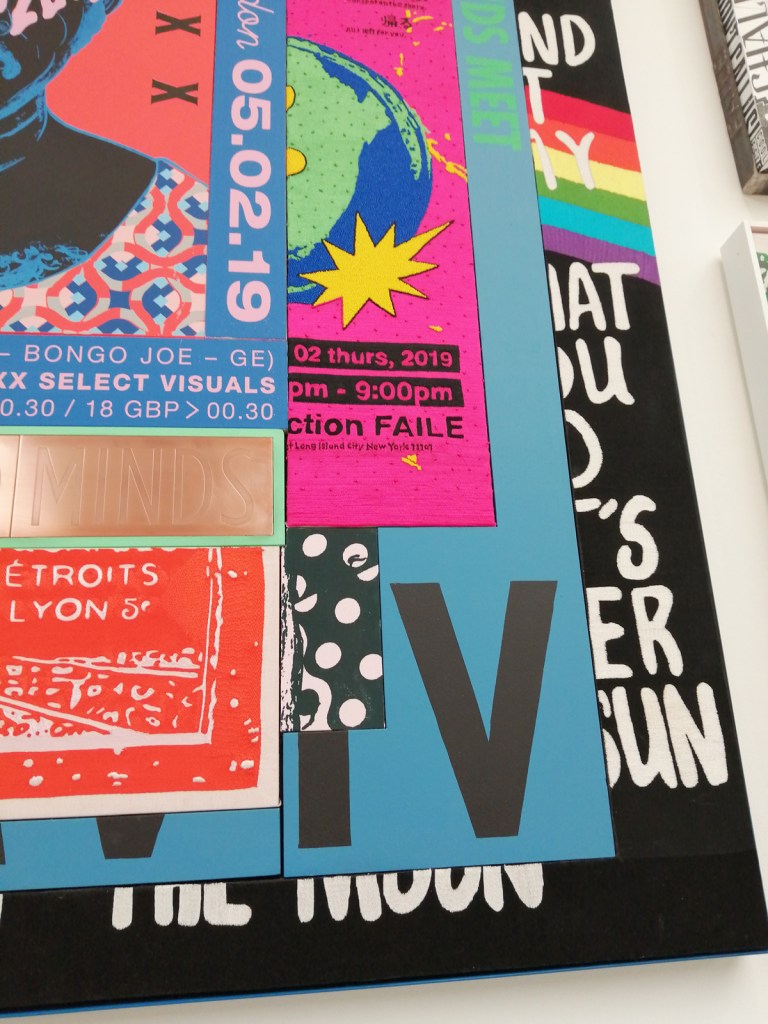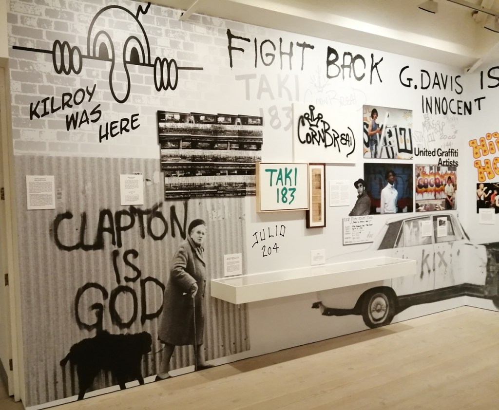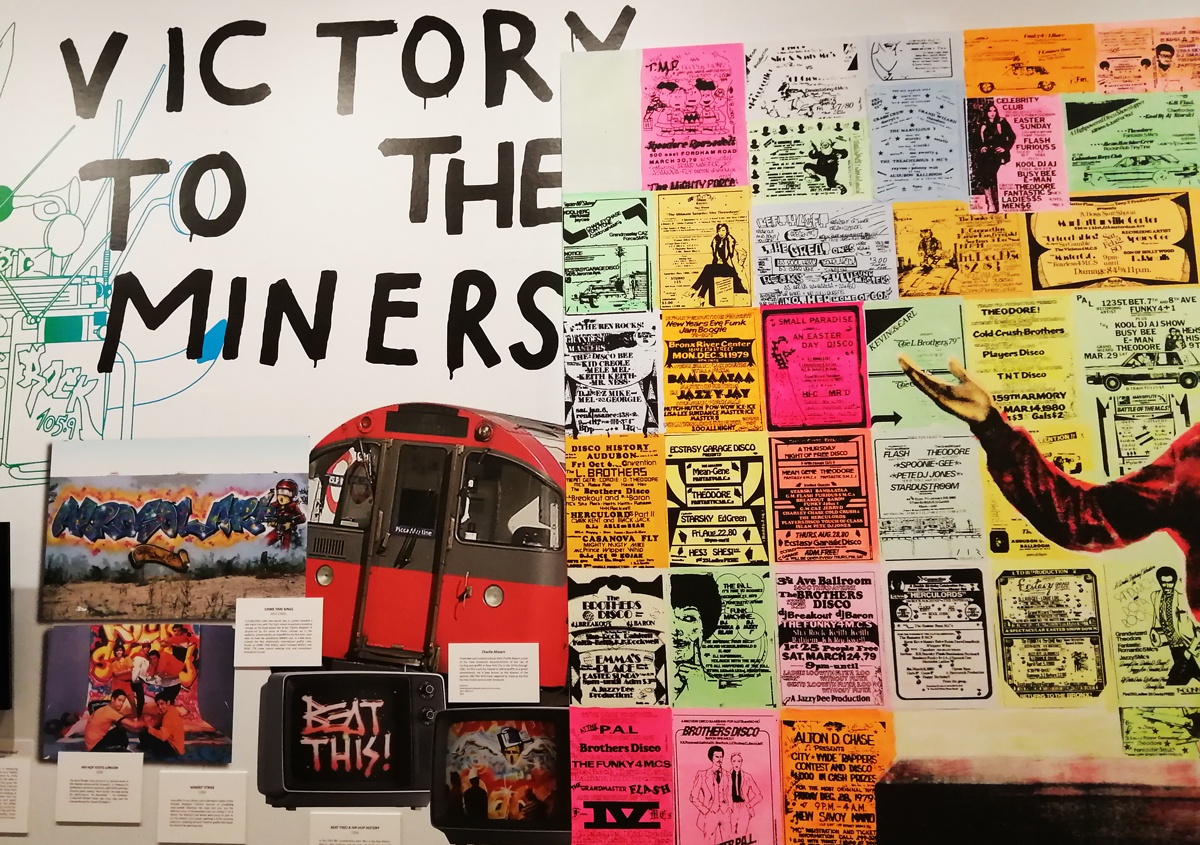There’s a lot of history here, “the history of self-expression” is a good way of putting it, lots of good stuff, lots of good art, lots of good pieces and posters and cassette tapes, ephemera, bits of cultural treasure, damn good to see early 80’s Covent Garden up there. Covent Garden was important, Alternative Arts and getting there early enough to sign on the list of dancers, crews, or in the case of half of us Organgrinders, Robot teams. Yep, we’re old bastards now, long in the broken tooth, good to see a screen up there showing videos of the dance and writing culture of early 80’s Covent Garden, it was a big big part of the London scene at the time, as was the Capital Hip Hop Jam that the GLC put on down on the Southbank back there (was it raining? Don’t think it was? The trees were certainly full of people trying to find a vantage point), good to see a small poster for the jam on the wall of that record shop installation (should have asked us, we’ve still got the ghetto blaster with all the stickers on it from that day). That record shop installation piece is rather good as well, damn pleased to see a Gunshot record in there, not sure about Skid Row though? Was mid 80’s hair metal ever part of it? And that’s the thing you see, you can go through this and for every “good to see that in here”, there’s a bit of “why is that there?” or a “but where is so and so or thingy?” There’s a Taki 183 tag reproduced, didn’t see a Samo anywhere though… Good to see that Newtrament 12″, last time we saw him he was homeless and living in a tent on a Hackney street, not that long ago actually, hope he’s okay, disappeared when Covid hit us all…