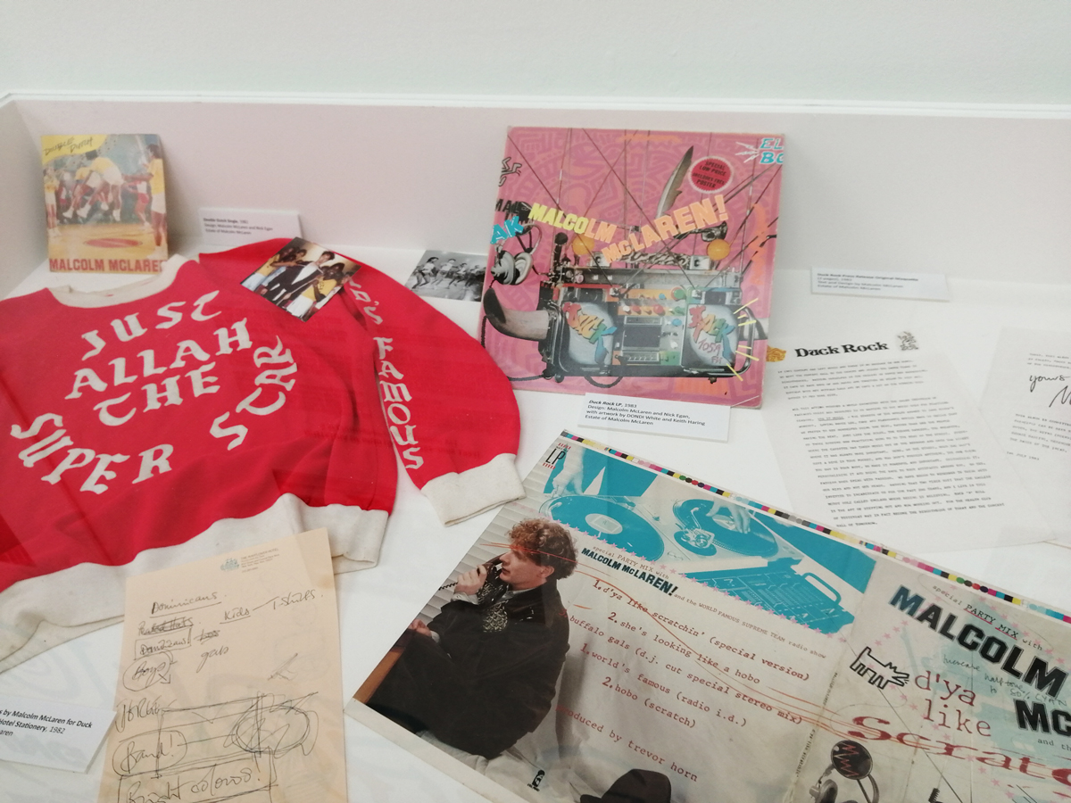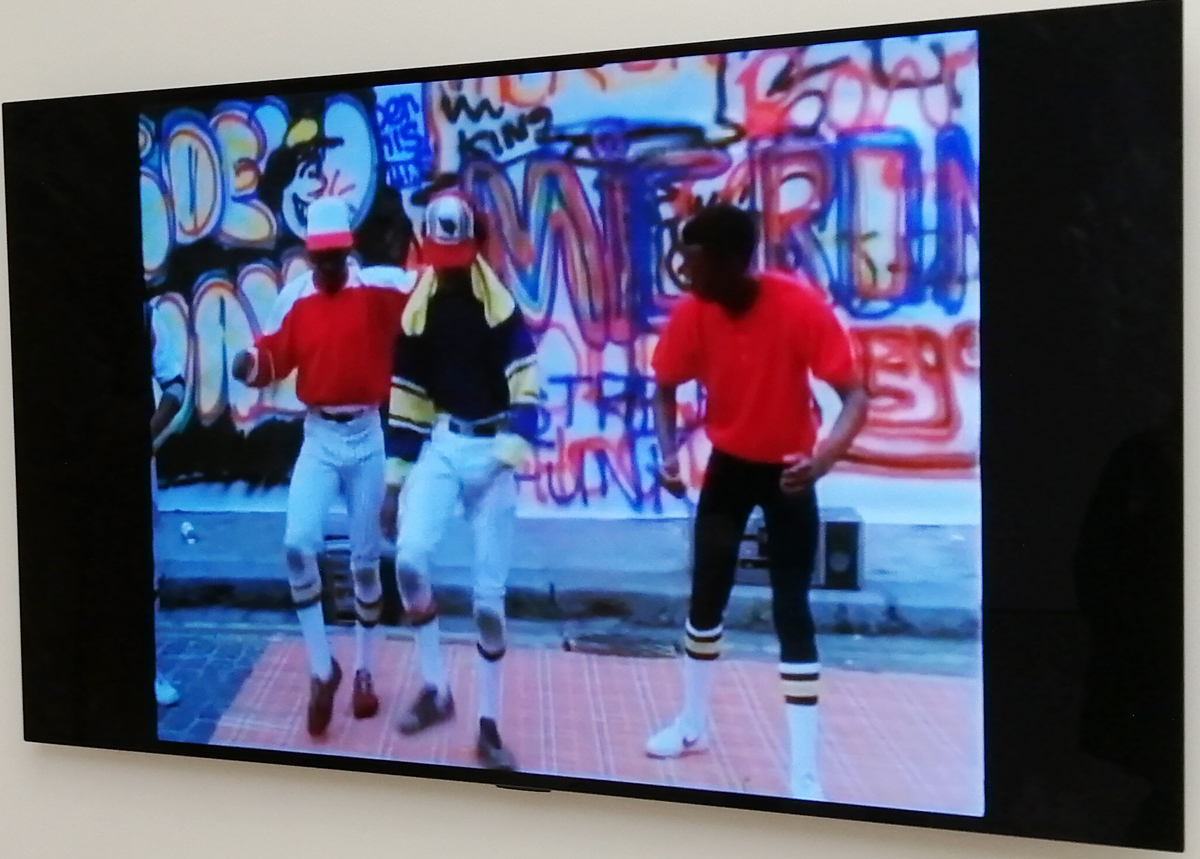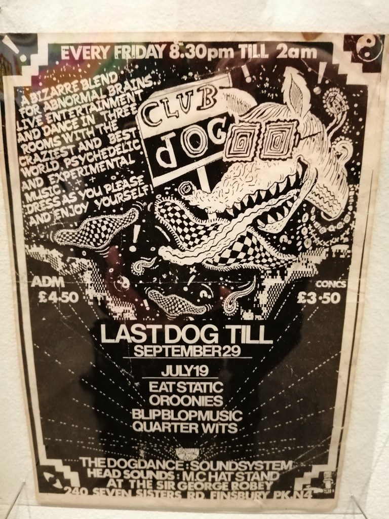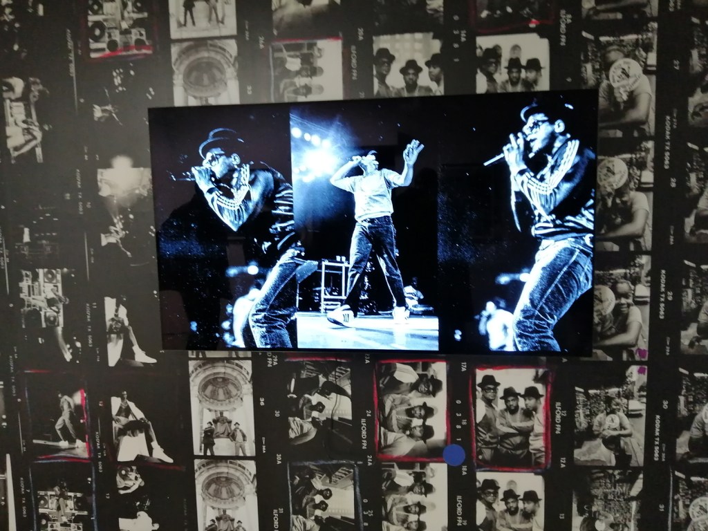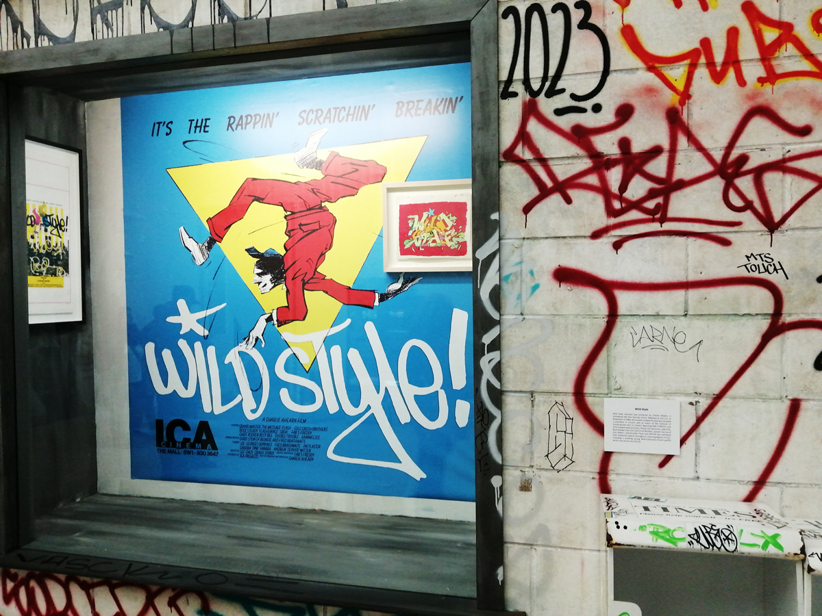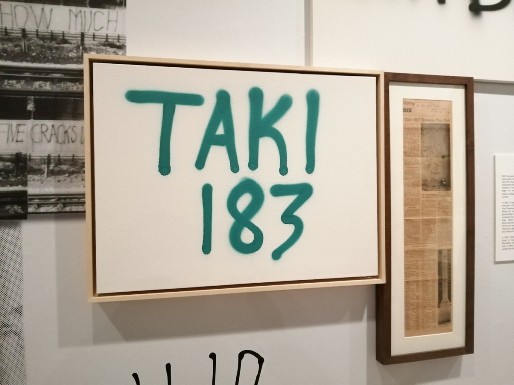 There’s a lot of history here, “the history of self-expression” is a good way of putting it, lots of good stuff, lots of good art, lots of good pieces and posters and cassette tapes, ephemera, bits of cultural treasure, damn good to see early 80’s Covent Garden up there. Covent Garden was important, Alternative Arts and getting there early enough to sign on the list of dancers, crews, or in the case of half of us Organgrinders, Robot teams. Yep, we’re old bastards now, long in the broken tooth, good to see a screen up there showing videos of the dance and writing culture of early 80’s Covent Garden, it was a big big part of the London scene at the time, as was the Capital Hip Hop Jam that the GLC put on down on the Southbank back there (was it raining? Don’t think it was? The trees were certainly full of people trying to find a vantage point), good to see a small poster for the jam on the wall of that record shop installation (should have asked us, we’ve still got the ghetto blaster with all the stickers on it from that day). That record shop installation piece is rather good as well, damn pleased to see a Gunshot record in there, not sure about Skid Row though? Was mid 80’s hair metal ever part of it? And that’s the thing you see, you can go through this and for every “good to see that in here”, there’s a bit of “why is that there?” or a “but where is so and so or thingy?” There’s a Taki 183 tag reproduced, didn’t see a Samo anywhere though… Good to see that Newtrament 12″, last time we saw him he was homeless and living in a tent on a Hackney street, not that long ago actually, hope he’s okay, disappeared when Covid hit us all…