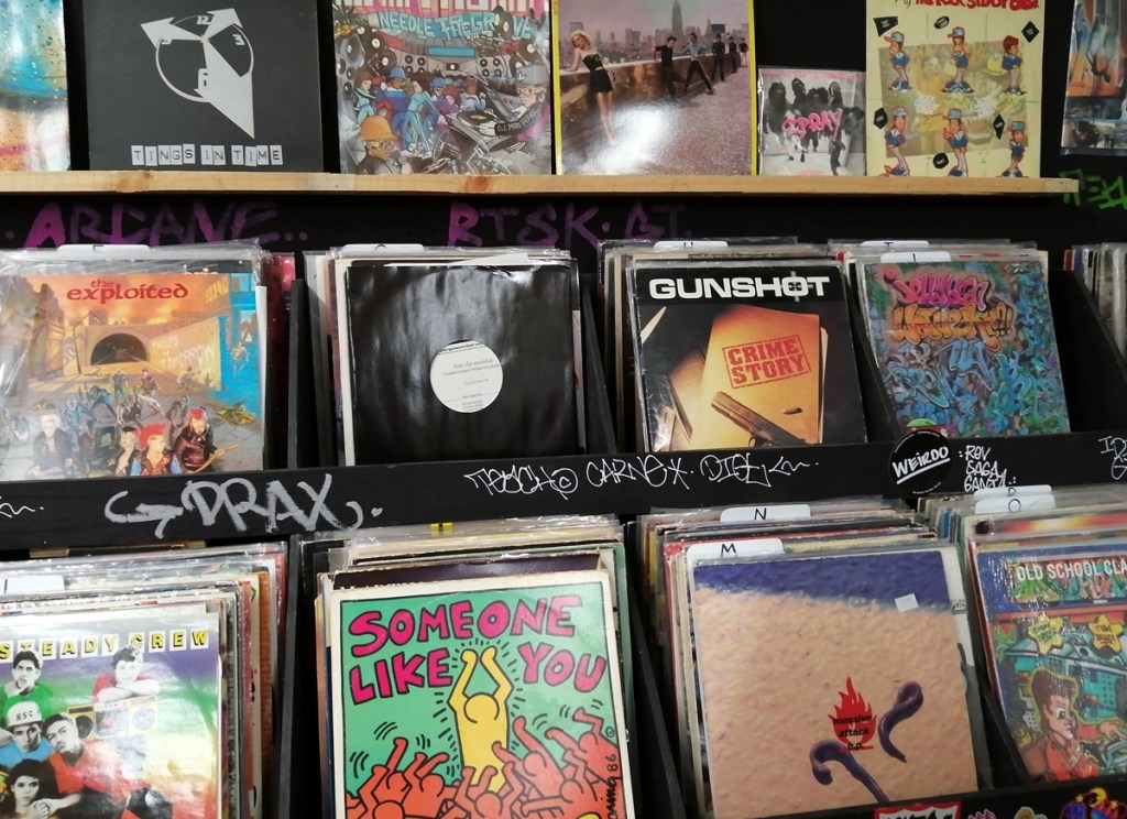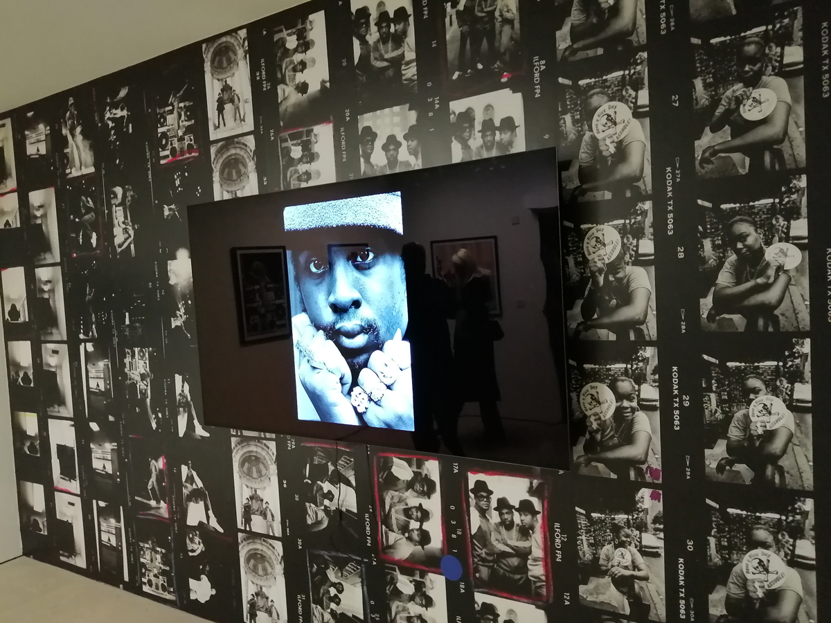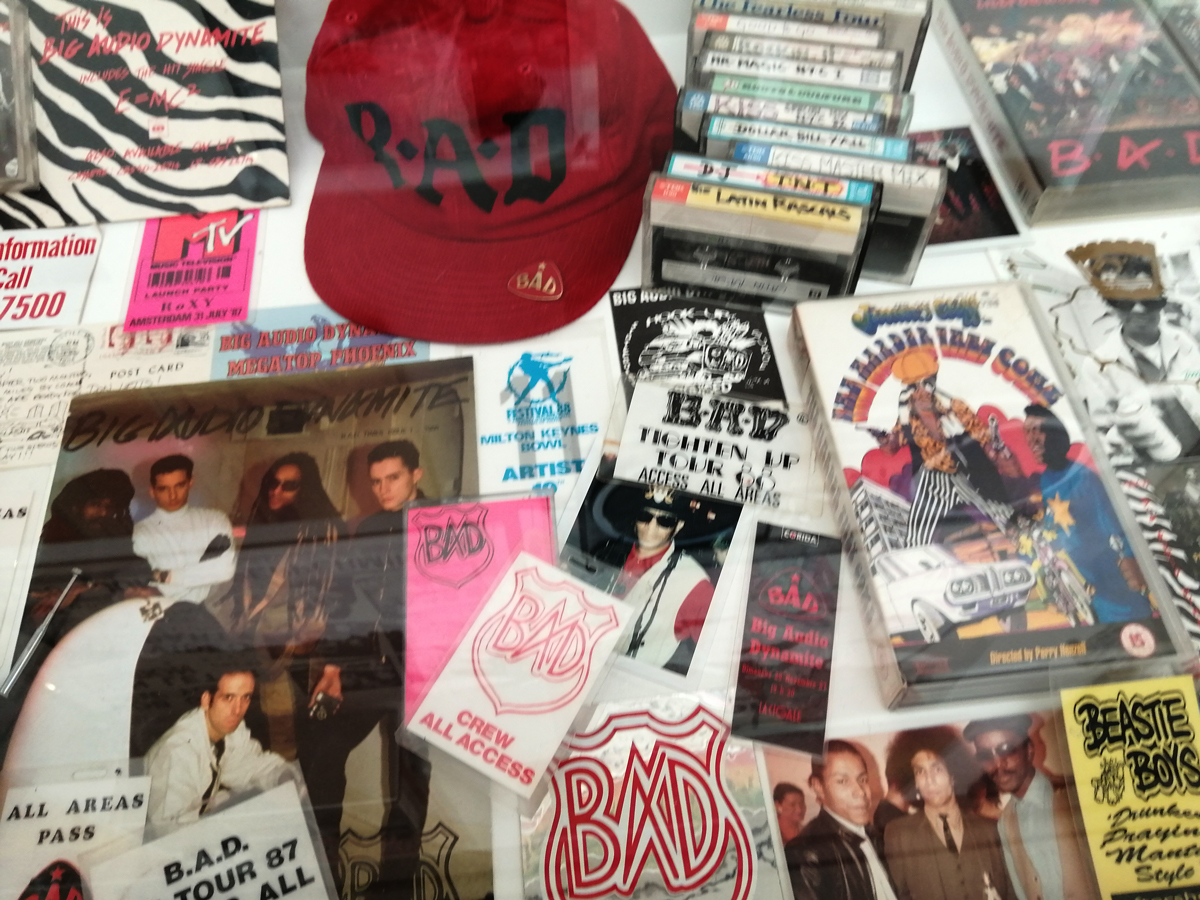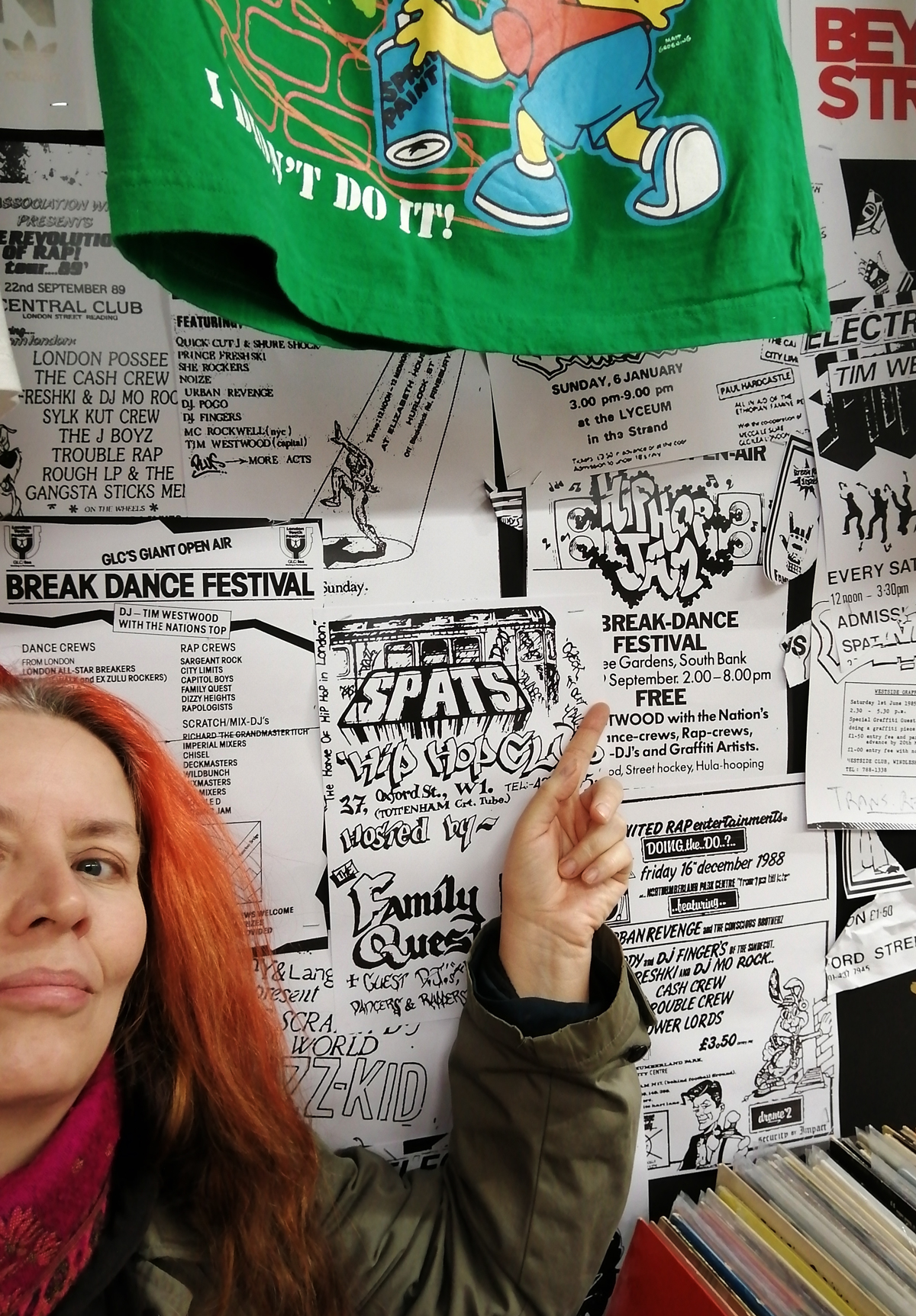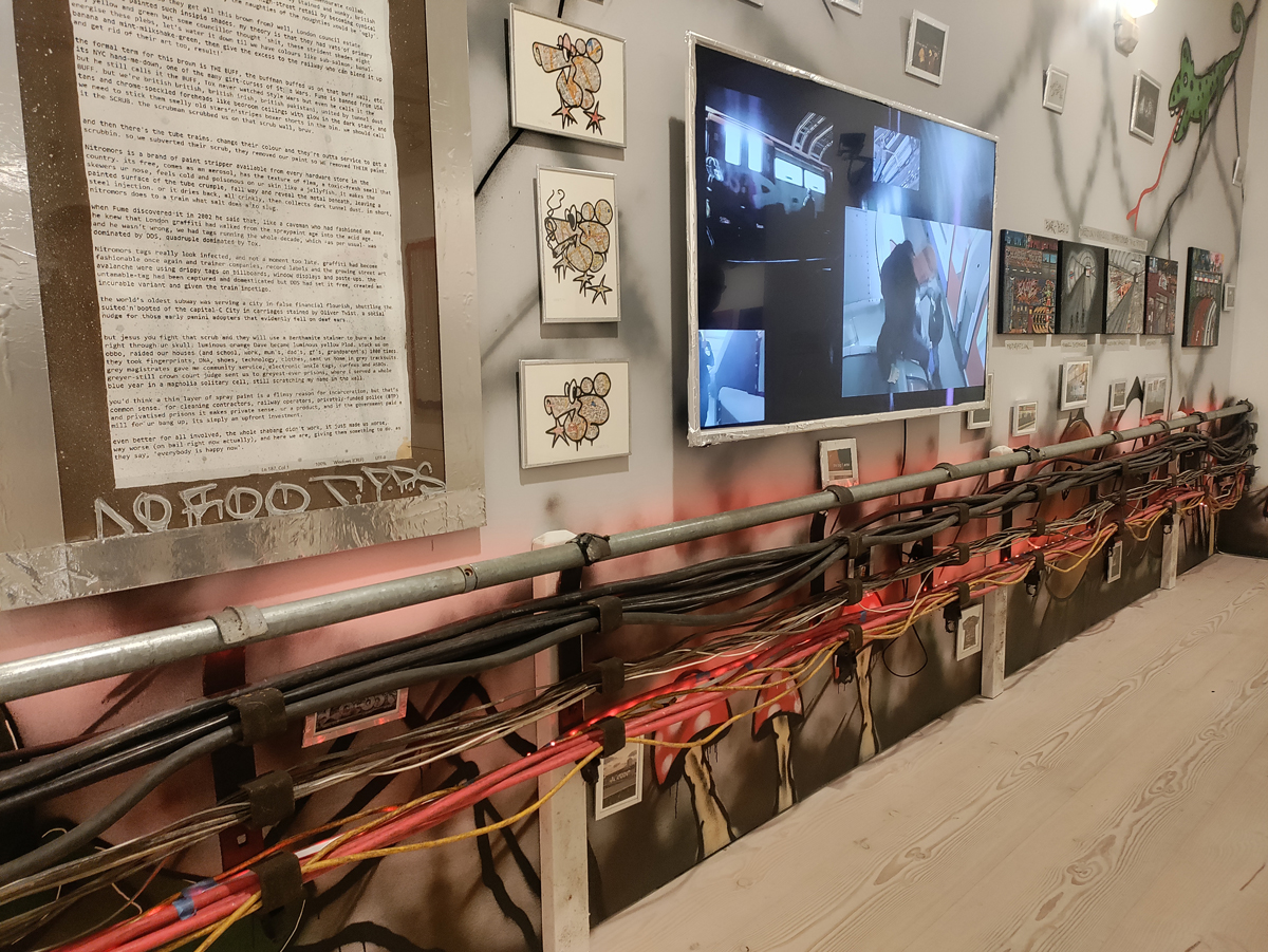 There’s a lot of history here, “the history of self-expression” is a good way of putting it, lots of good stuff, lots of good art, lots of good pieces and posters and cassette tapes, ephemera, bits of cultural treasure, damn good to see early 80’s Covent Garden up there. Covent Garden was important, Alternative Arts and getting there early enough to sign on the list of dancers, crews, or in the case of half of us Organgrinders, Robot teams. Yep, we’re old bastards now, long in the broken tooth, good to see a screen up there showing videos of the dance and writing culture of early 80’s Covent Garden, it was a big big part of the London scene at the time, as was the Capital Hip Hop Jam that the GLC put on down on the Southbank back there (was it raining? Don’t think it was? The trees were certainly full of people trying to find a vantage point), good to see a small poster for the jam on the wall of that record shop installation (should have asked us, we’ve still got the ghetto blaster with all the stickers on it from that day). That record shop installation piece is rather good as well, damn pleased to see a Gunshot record in there, not sure about Skid Row though? Was mid 80’s hair metal ever part of it? And that’s the thing you see, you can go through this and for every “good to see that in here”, there’s a bit of “why is that there?” or a “but where is so and so or thingy?” There’s a Taki 183 tag reproduced, didn’t see a Samo anywhere though… Good to see that Newtrament 12″, last time we saw him he was homeless and living in a tent on a Hackney street, not that long ago actually, hope he’s okay, disappeared when Covid hit us all…