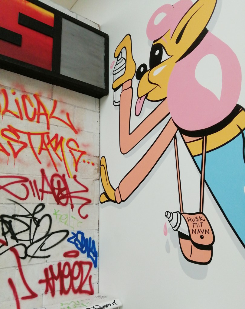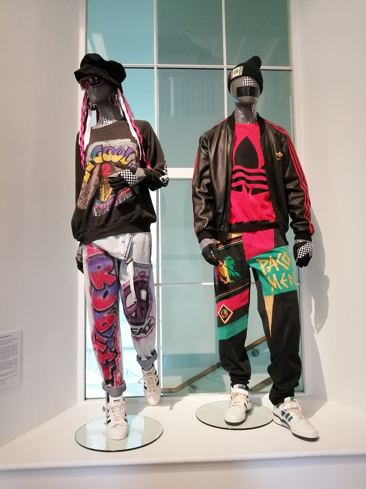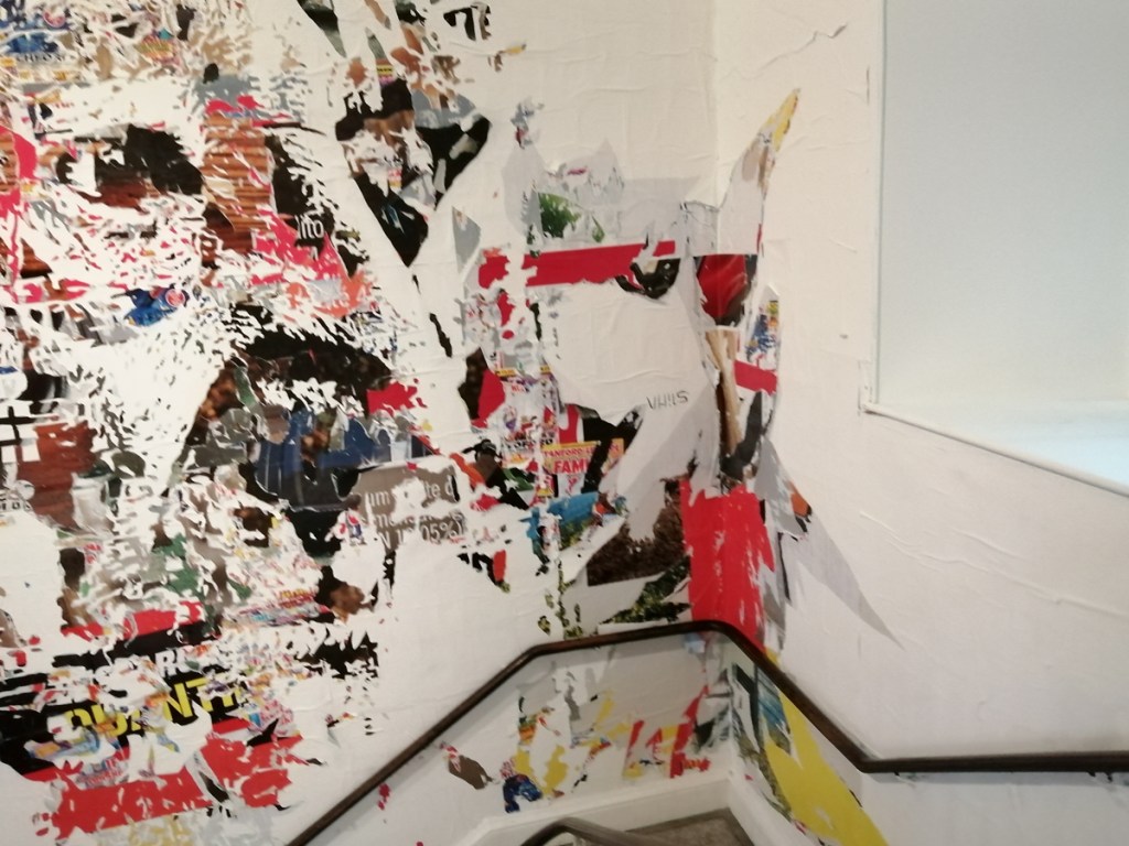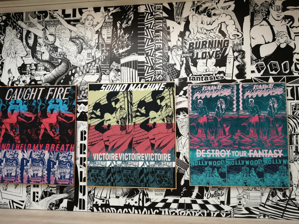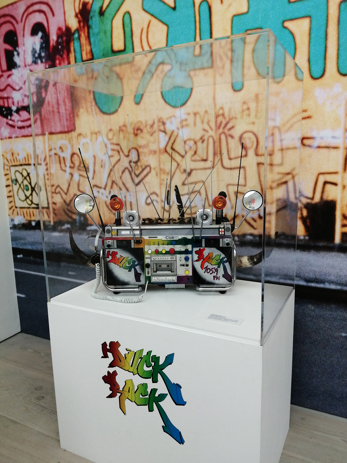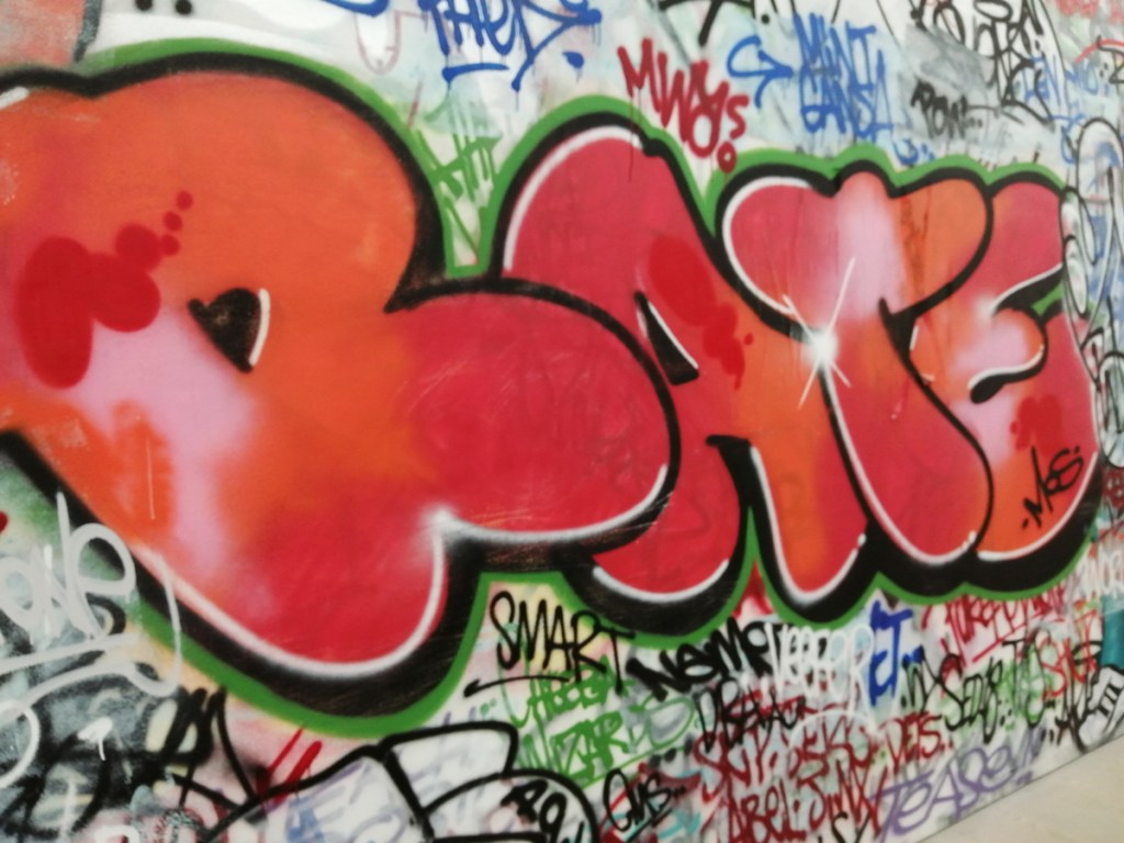 There’s a lot of history here, “the history of self-expression” is a good way of putting it, lots of good stuff, lots of good art, lots of good pieces and posters and cassette tapes, ephemera, bits of cultural treasure, damn good to see early 80’s Covent Garden up there. Covent Garden was important, Alternative Arts and getting there early enough to sign on the list of dancers, crews, or in the case of half of us Organgrinders, Robot teams. Yep, we’re old bastards now, long in the broken tooth, good to see a screen up there showing videos of the dance and writing culture of early 80’s Covent Garden, it was a big big part of the London scene at the time, as was the Capital Hip Hop Jam that the GLC put on down on the Southbank back there (was it raining? Don’t think it was? The trees were certainly full of people trying to find a vantage point), good to see a small poster for the jam on the wall of that record shop installation (should have asked us, we’ve still got the ghetto blaster with all the stickers on it from that day). That record shop installation piece is rather good as well, damn pleased to see a Gunshot record in there, not sure about Skid Row though? Was mid 80’s hair metal ever part of it? And that’s the thing you see, you can go through this and for every “good to see that in here”, there’s a bit of “why is that there?” or a “but where is so and so or thingy?” There’s a Taki 183 tag reproduced, didn’t see a Samo anywhere though… Good to see that Newtrament 12″, last time we saw him he was homeless and living in a tent on a Hackney street, not that long ago actually, hope he’s okay, disappeared when Covid hit us all…