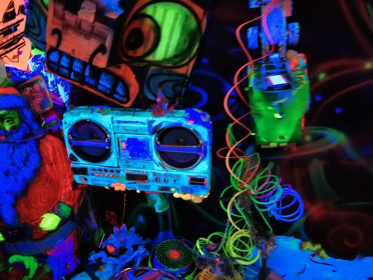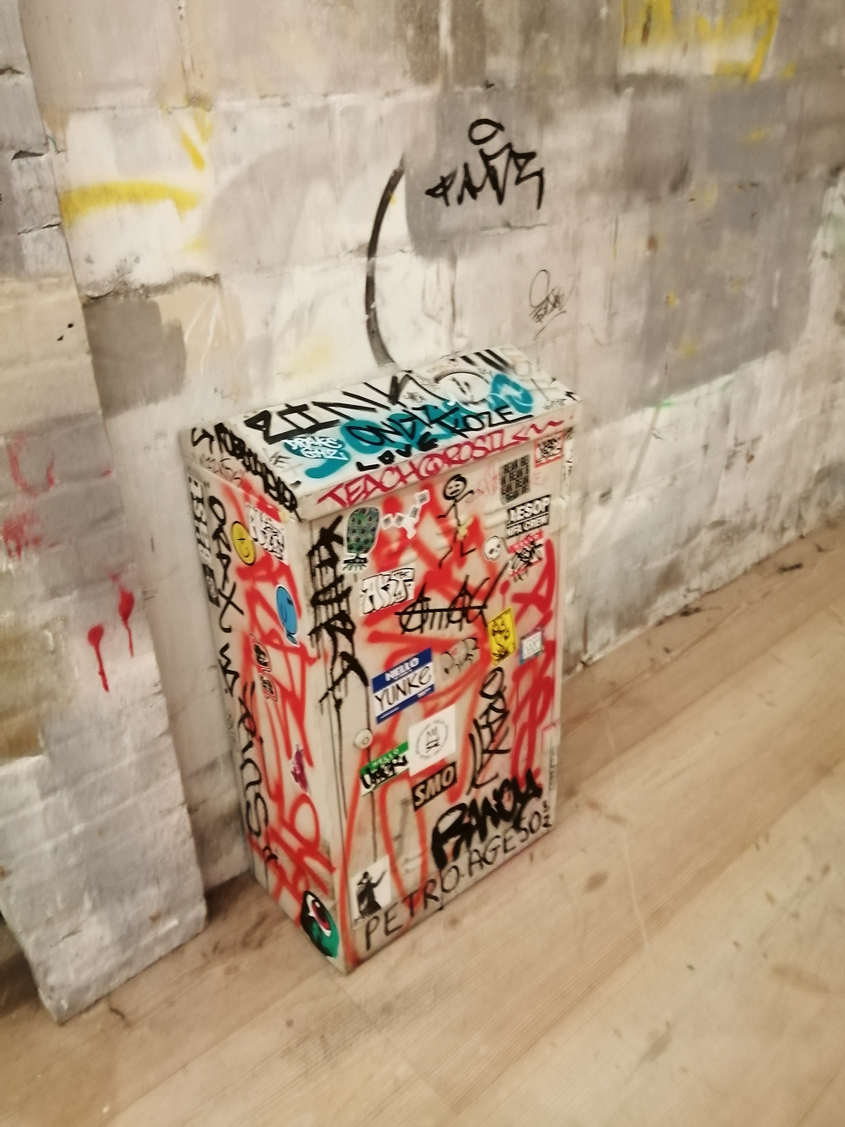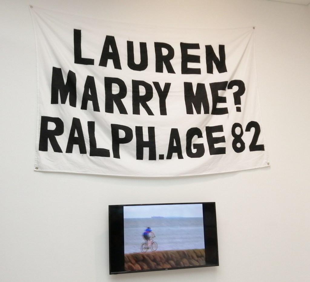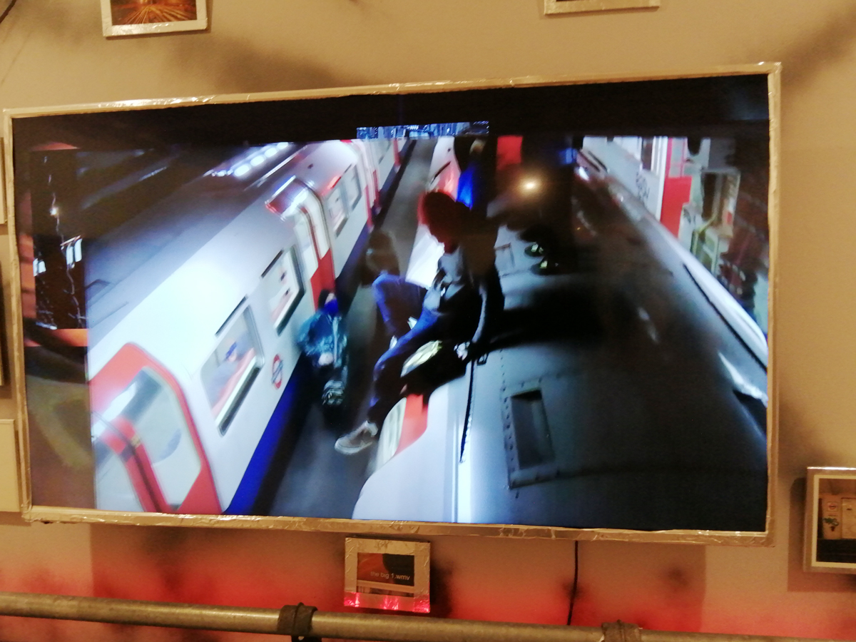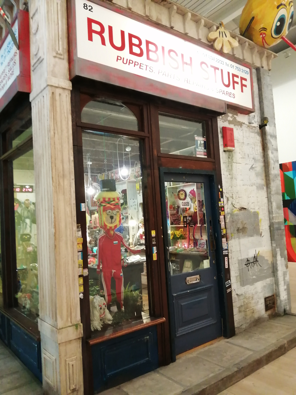 There’s a lot of history here, “the history of self-expression” is a good way of putting it, lots of good stuff, lots of good art, lots of good pieces and posters and cassette tapes, ephemera, bits of cultural treasure, damn good to see early 80’s Covent Garden up there. Covent Garden was important, Alternative Arts and getting there early enough to sign on the list of dancers, crews, or in the case of half of us Organgrinders, Robot teams. Yep, we’re old bastards now, long in the broken tooth, good to see a screen up there showing videos of the dance and writing culture of early 80’s Covent Garden, it was a big big part of the London scene at the time, as was the Capital Hip Hop Jam that the GLC put on down on the Southbank back there (was it raining? Don’t think it was? The trees were certainly full of people trying to find a vantage point), good to see a small poster for the jam on the wall of that record shop installation (should have asked us, we’ve still got the ghetto blaster with all the stickers on it from that day). That record shop installation piece is rather good as well, damn pleased to see a Gunshot record in there, not sure about Skid Row though? Was mid 80’s hair metal ever part of it? And that’s the thing you see, you can go through this and for every “good to see that in here”, there’s a bit of “why is that there?” or a “but where is so and so or thingy?” There’s a Taki 183 tag reproduced, didn’t see a Samo anywhere though… Good to see that Newtrament 12″, last time we saw him he was homeless and living in a tent on a Hackney street, not that long ago actually, hope he’s okay, disappeared when Covid hit us all…