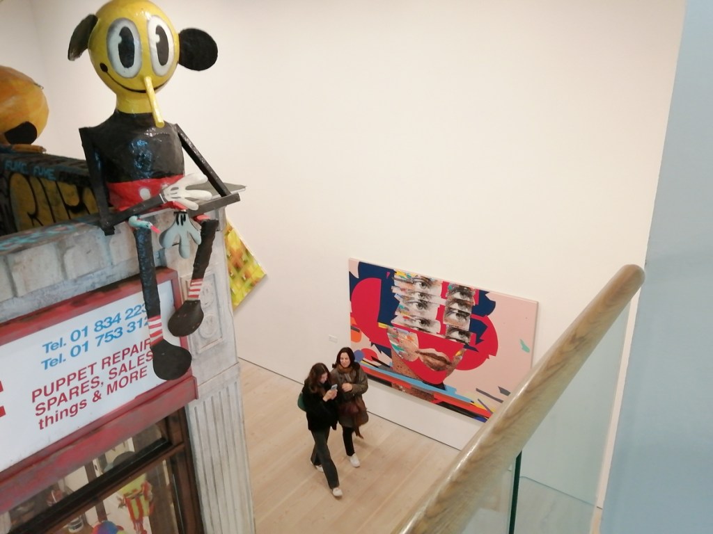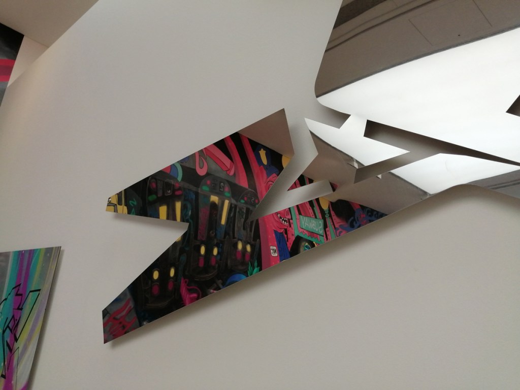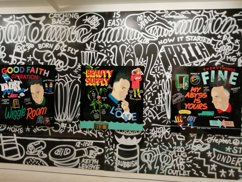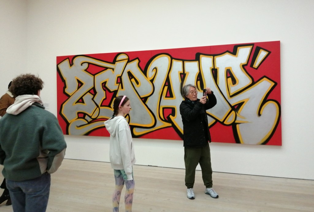 Yes indeed, note to self, don’t be moaning, don’t be point-scoring, don’t be a grumpy old bastard, this is a damn good show, this is a big show, an important show, this is excellent – to see that big Swoon over there is brilliant! And great to see that group of relatively big Connor Harrington paintings in here, and the recent Paul Insect pieces are rather strong. The whole exhibition works in so many ways, it works partly because of the shape(s) of the building as much as anything, the following of the trail around the 12 numbered rooms, around the corners, up the stairs, love that wall of New York train cars on one of the stair cases and hey, it is rather busy in here for a Monday morning. But then there are big holes and there are bit that you question and where was this and that, and if we’re going to put punk and graffiti together and blah blah blah and the zines, the glue? And yes as excellent as it is, and there are far more positives than negatives, and as great as it is, the whole show does go badly badly astray around about room ten, that new kind of pop art stuff really is blandly underwhelming and what the hell is that Ralph Lauren bit doing there? Another of the sponsors? What was that leopard about, and well it did all kind of badly lose the plot at the end as it ushered us towards exiting via the gift shop. Let’s not dwell on that though, lets ignore the last three rooms and celebrate the Trouble Funk poster and things still smoking on the go-go scene, let’s focus on that fine 2022 Goldie piece, on the set of thrilling Crash canvases from the same year, let’s on the beauty of that Chaz Bojorquez piece and the detail within it if you really take the time to look at it rather than just walk past it – this is an exhibition that demands a good handful of hours, don’t let yourself rush it now, take your time and feast on the lines of that gloriously good Pride piece on the wall just there, on those really exciting Maya Hayuk pieces, adore her four letter word, her beautiful use of colour, brilliant!