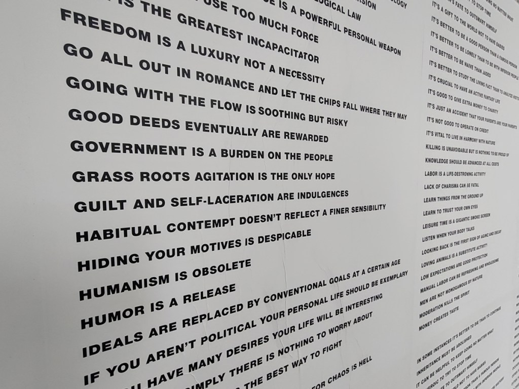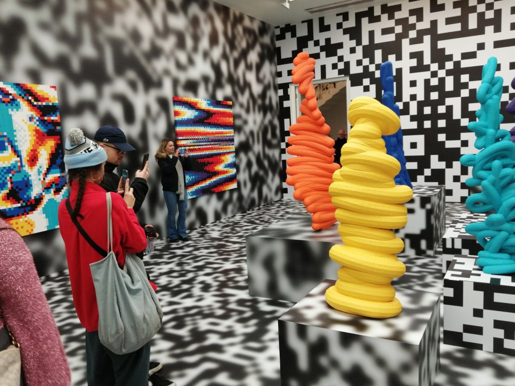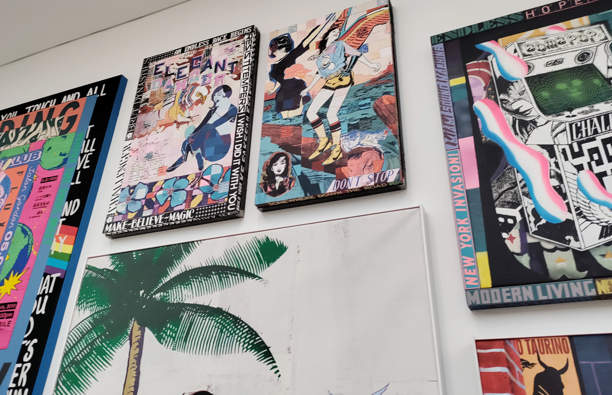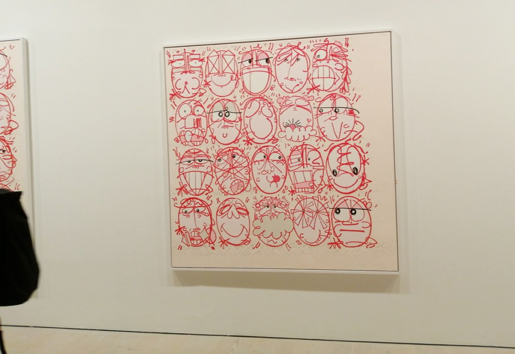 Yes indeed, note to self, don’t be moaning, don’t be point-scoring, don’t be a grumpy old bastard, this is a damn good show, this is a big show, an important show, this is excellent – to see that big Swoon over there is brilliant! And great to see that group of relatively big Connor Harrington paintings in here, and the recent Paul Insect pieces are rather strong. The whole exhibition works in so many ways, it works partly because of the shape(s) of the building as much as anything, the following of the trail around the 12 numbered rooms, around the corners, up the stairs, love that wall of New York train cars on one of the stair cases and hey, it is rather busy in here for a Monday morning. But then there are big holes and there are bit that you question and where was this and that, and if we’re going to put punk and graffiti together and blah blah blah and the zines, the glue? And yes as excellent as it is, and there are far more positives than negatives, and as great as it is, the whole show does go badly badly astray around about room ten, that new kind of pop art stuff really is blandly underwhelming and what the hell is that Ralph Lauren bit doing there? Another of the sponsors? What was that leopard about, and well it did all kind of badly lose the plot at the end as it ushered us towards exiting via the gift shop. Let’s not dwell on that though, lets ignore the last three rooms and celebrate the Trouble Funk poster and things still smoking on the go-go scene, let’s focus on that fine 2022 Goldie piece, on the set of thrilling Crash canvases from the same year, let’s on the beauty of that Chaz Bojorquez piece and the detail within it if you really take the time to look at it rather than just walk past it – this is an exhibition that demands a good handful of hours, don’t let yourself rush it now, take your time and feast on the lines of that gloriously good Pride piece on the wall just there, on those really exciting Maya Hayuk pieces, adore her four letter word, her beautiful use of colour, brilliant!