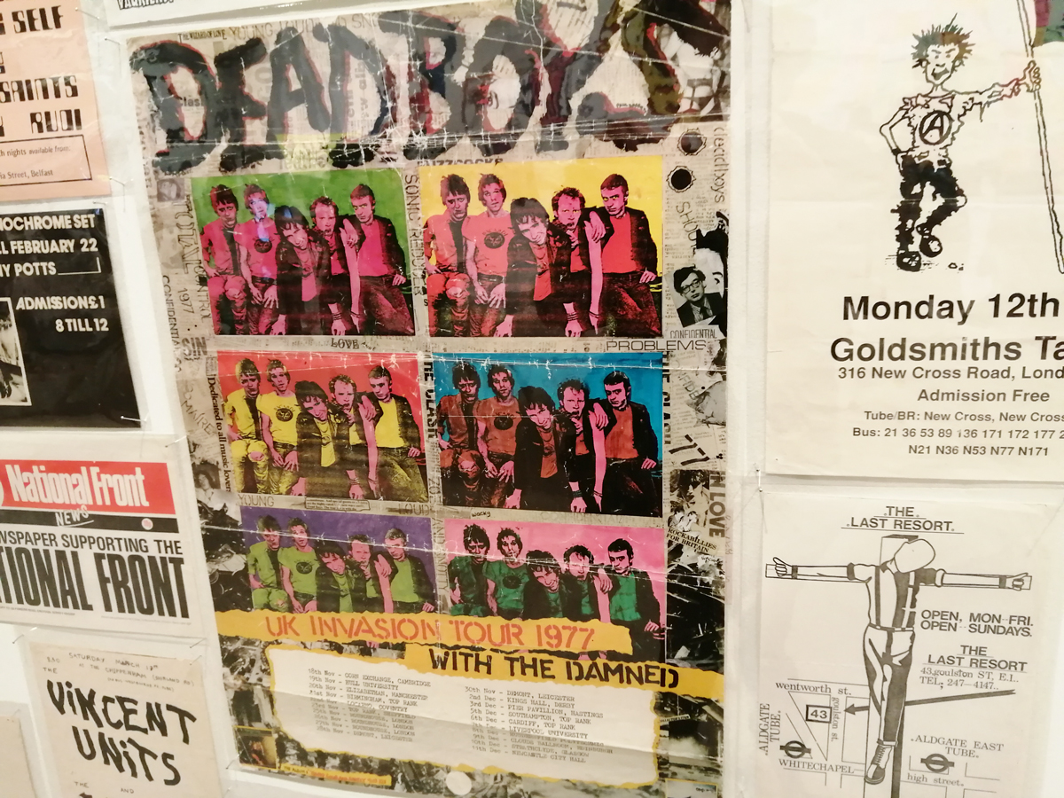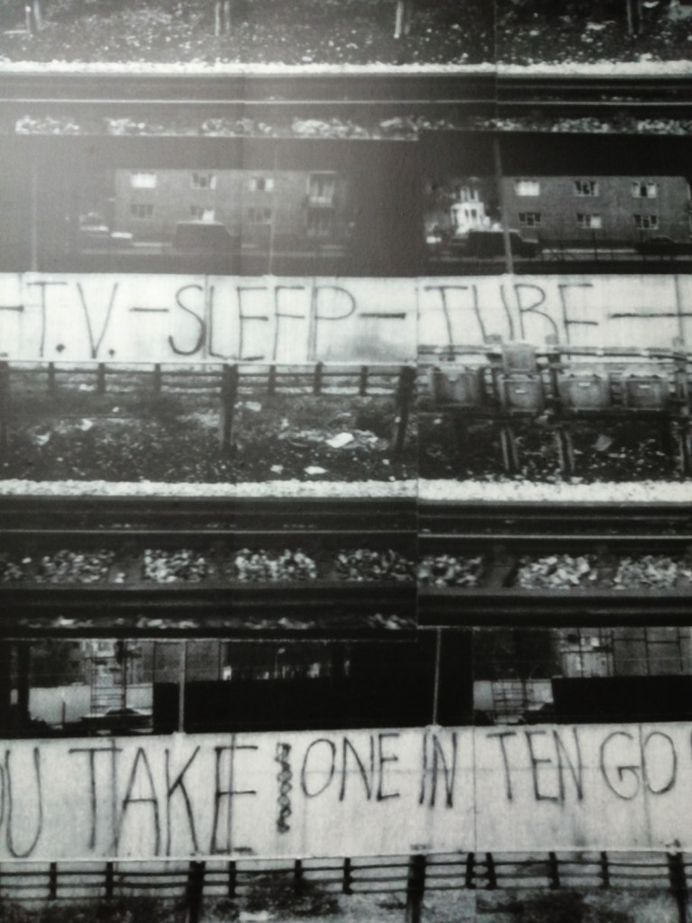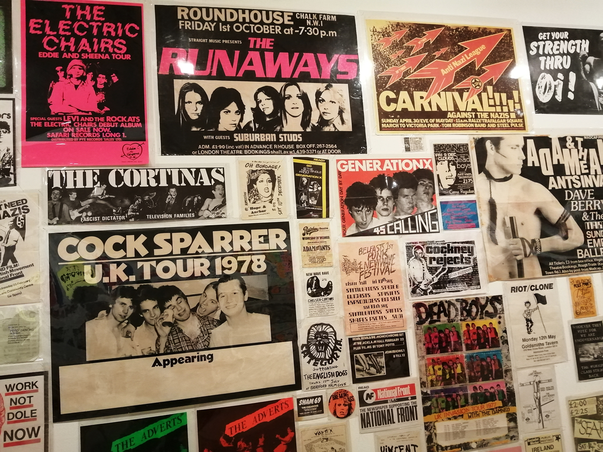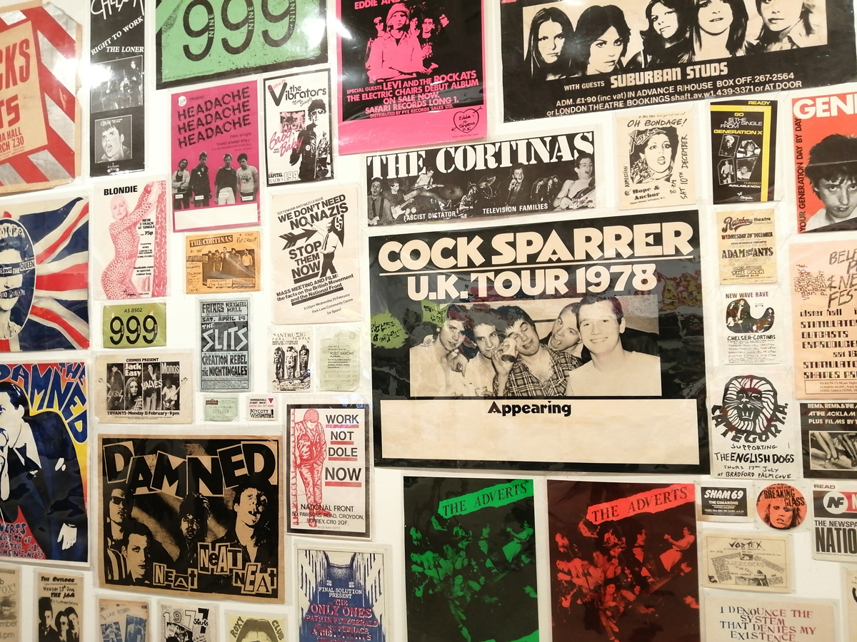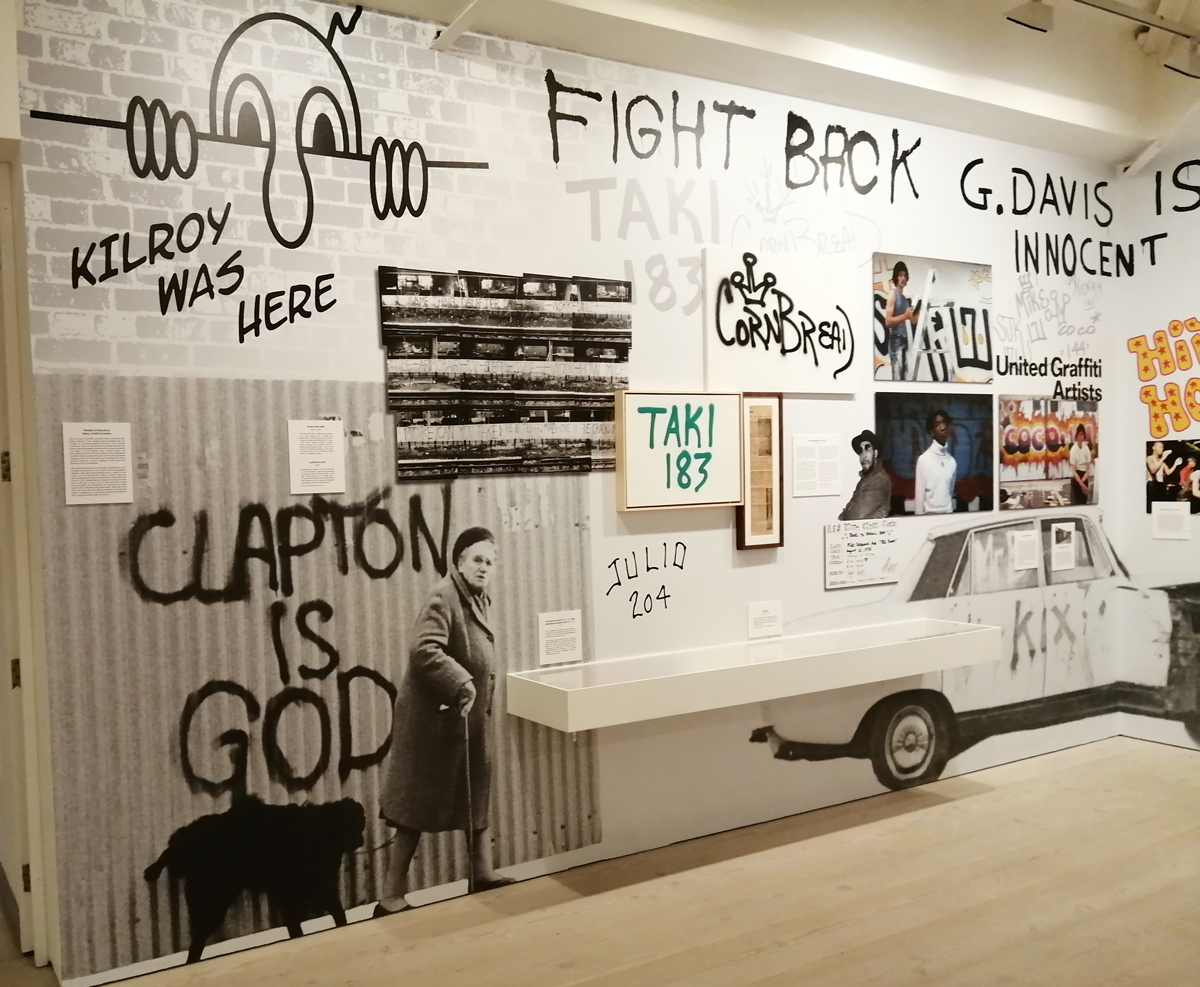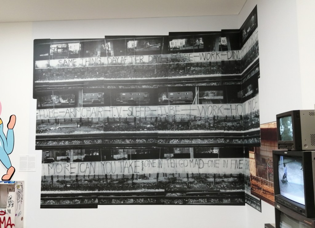 So yes, as good as some of those posters are. Toby Mott‘s Wall of Noise kind of misses as much as it hits, all those gig posters up there, but so much not there, big big holes. Sure there is a nod towards Poison Girls or Stonehenge and he just about squeezes in a Club Dog poster right down at the bottom there but where the hell is the hardcore punk, the zines, the skate/thrash crossovers? And as good as some of the bands were, there are some rather strange inclusions up there on Mr Mott’s big wall. Actually the whole exhibition feels a little disjointed, vital connections missed out, selective histories, not quite knitting together and as strong as the list of featured artists and writers is, you always are going to be asking yourself where’s so and so? Why isn’t thingy in here? And the big big glaring hole that is always there with things like this, the big part that’s always missing in terms of the UK and graffiti, where is the football culture of the late 70’s? Where are the tags (as they weren’t really called back then), where’s the spray painting your mark on walls in their territory? At their railway stations? That was always something, and those tags got bigger as the decade closed and they grew slightly more elaborate – who is this Robbo asked United? Arsenal? Who? it was a starting point for so many who then went beyond football and started to write just for writing’s sake or just for the thrill of it. Those Inter City Jibbers on Southern raids, the ICF or them Headhunters spraying on Northern walls. it was surely the football crews who wanted the right Adidas before anyone else? The firms who started taking can of Spray paint with them to away matches? The Clash under the Westway? Nah mate, the Cockney Reds did it away at Chelsea before the bloody Clash! As Rotten once said, The Clash were six months late with everything! But then you might say no one claimed this exhibition was a definite history did they?
