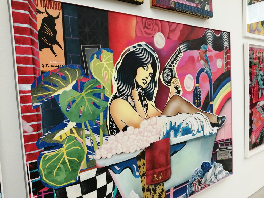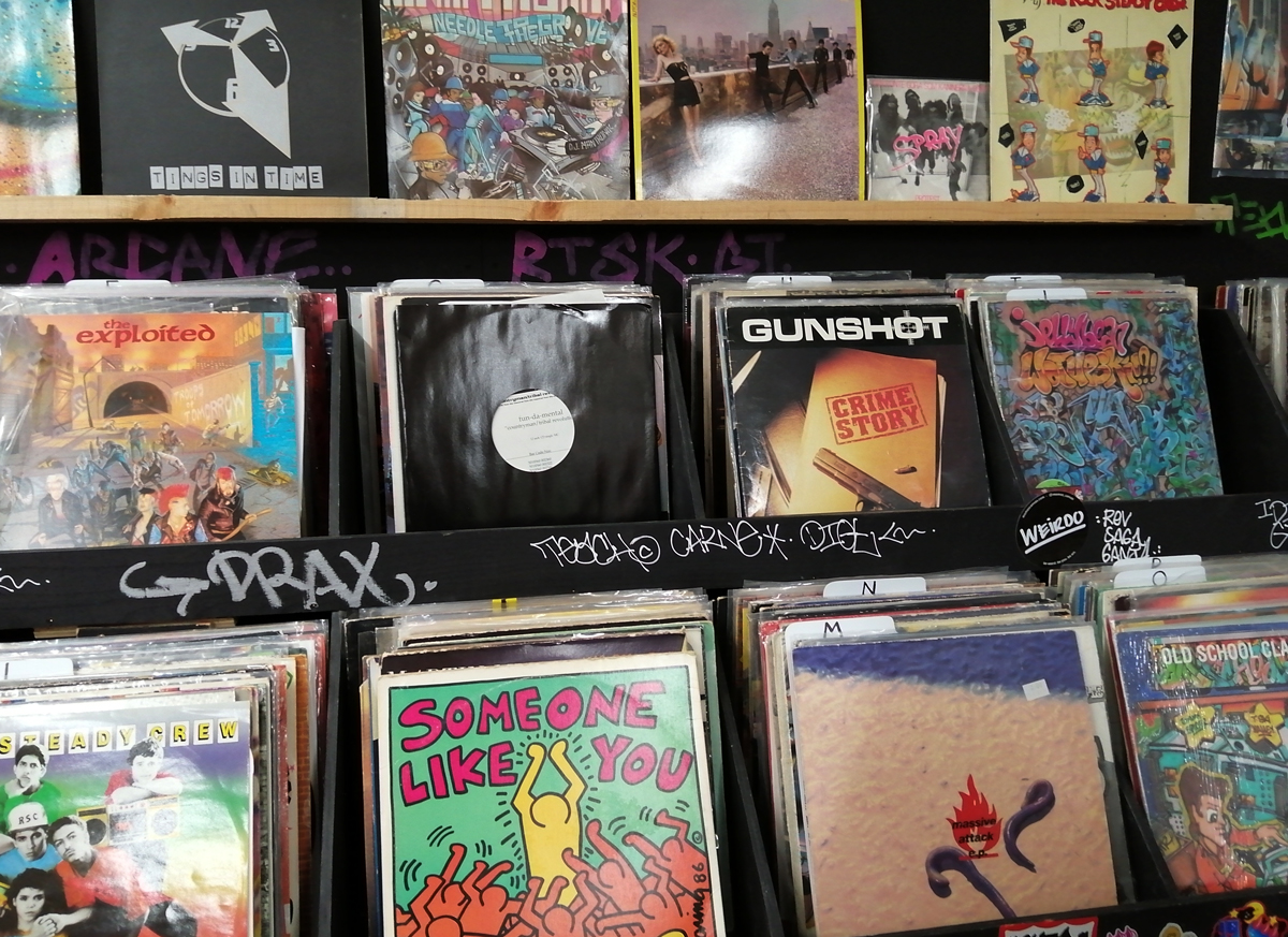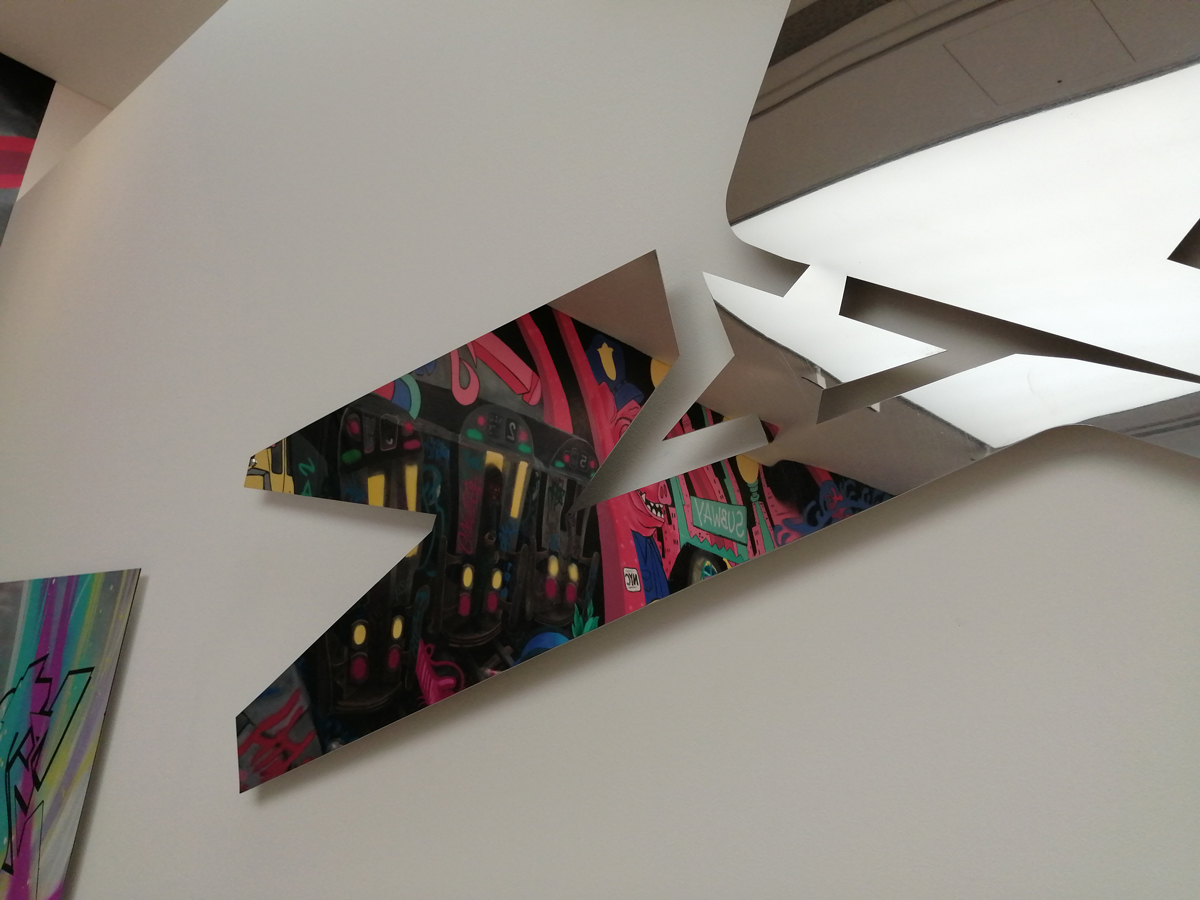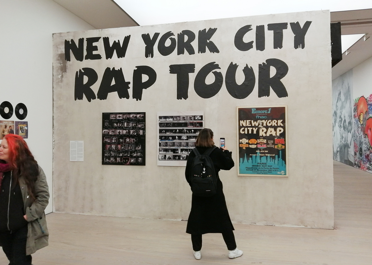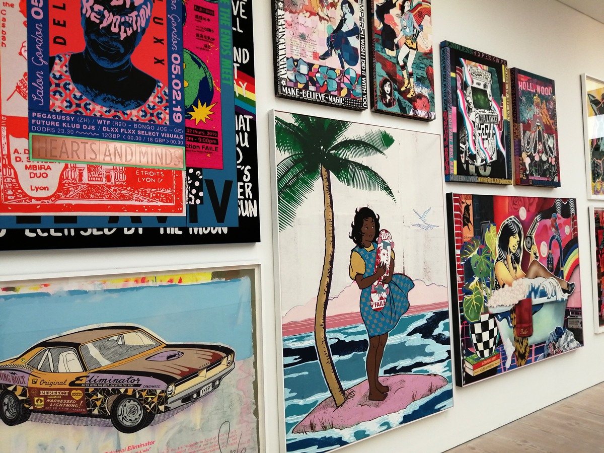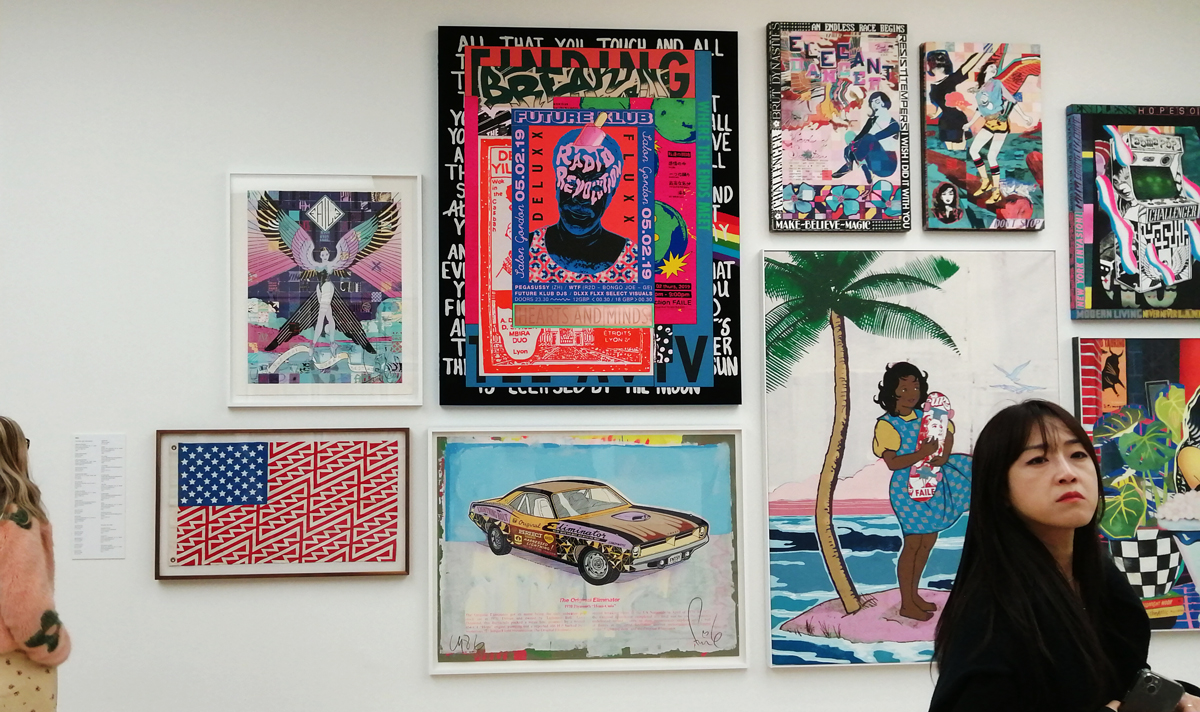 What we have here is a more than healthy mix of installation, history, big pieces of art, music posters, pieces of clothing, recent paintings from names both old and new and more besides. And so much of it, almost feels wrong to go picking out highlights, so many good things to see here, the big Jenny Holtzer wall of words is as powerful as she always is, love the VHILS doors, excellent to see a Futura 2000 in the flesh and we can never see too many Martha Cooper or Henry Chalfant photographs – always loved that Dondi one of him silhouetted between the two trains – yes, like everyone else, I’ve got a well thumbed copy of that book, ordered it as soon as it came out, has any art book ever had more of an influence than Martha Cooper and Henry Chalfant’s vital 1984 book Subway Art? (and yes we did use some of it for backgrounds when the first black and white photocopied cut ‘n paste hand spray painted edition of Organ came out in ’86, indeed the book is still to hand right here in touching distance right next to me in the studio right now). Those Faile pieces are wonderfully good, and no, not tired of Shephard Fairey‘s refined colours yet. Damn good to see Malcolm Maclaren‘s Duck Rock featured strongly (and the original ghetto blaster recreated), Duck Rock was an important album back there. From what I remember, before the excitement of Martha and Henry’s book (I was a teenage fresh-out-of-school art foundation course student at the time, picked it my order from the book shop at lunch time, took it back to collage in the afternoon and we spent the rest of the day arguing about it – rather violently as I recall – some of the old school art lecturers did not like it! Fair to say it had a big affect on my life), before that book there were exciting glimpses of graffiti and street art things via videos of people like Blondie or Grandmaster Flash on the telly and then there was the brilliant sound of Mclaren’s Duck Rock album and all that scratching making me itch – there was that and then there was the main source for graff imagery that was the underground punk/skate scene, the zine and tape trading culture, the glossy skate magazines that came over, the underground thrash, speed metal and hardcore punk publications that was fusing things together (the Beastie Boys and their hip hop is well represented in the show but hey, they were an underground shouty hardcore punk band stages with Agnostic Front, Murphy’s Law and the likes well before that brought in the hip hop flavours, go find the dubiously named Poly Wog EP) – all that underground punk, not the NME version of punk, the real word of mouth stuff was coming over from America and mixing with the underground zine and tape fuelled UK hardcore punk/crust/squat scene that in turn was a rather big underground deal over here at the time. All about those skate mags, punk tapes and photocopied zines and tape trading lists and distros and cans of Halford’s car spray if they’d let you buy it (why do you want all these colours? What make of car did you say you were painting? No we’re not selling it to you!)