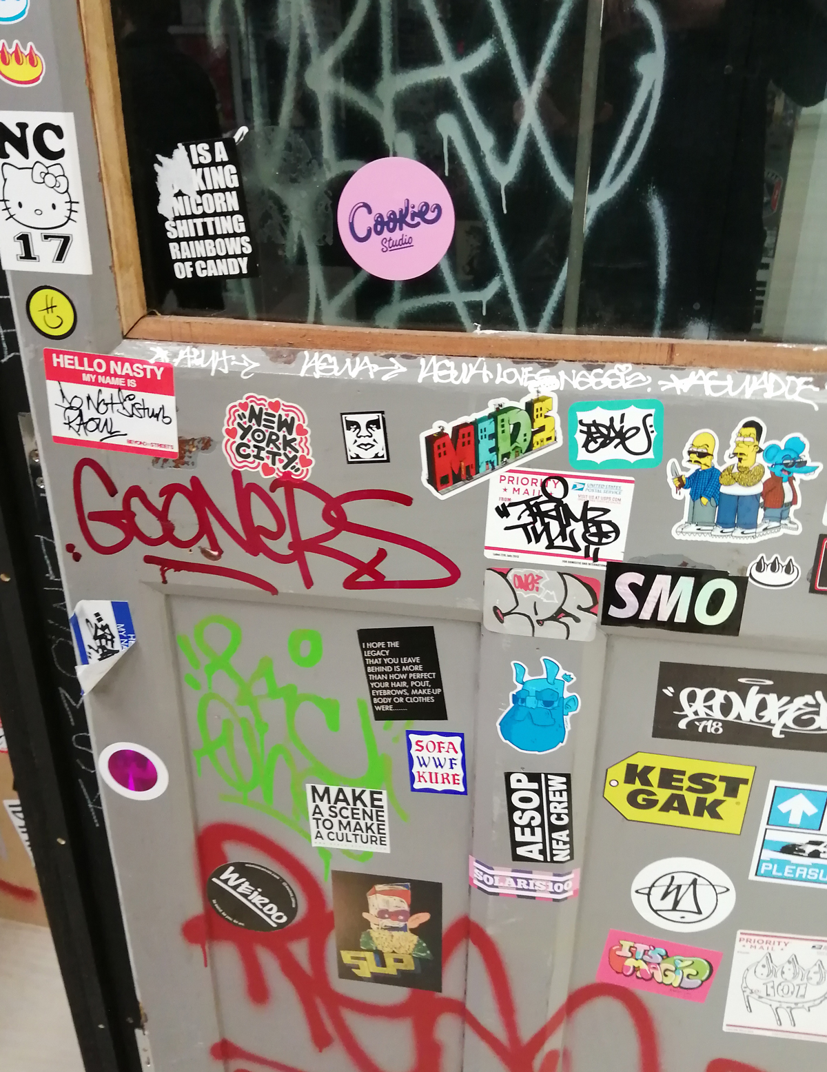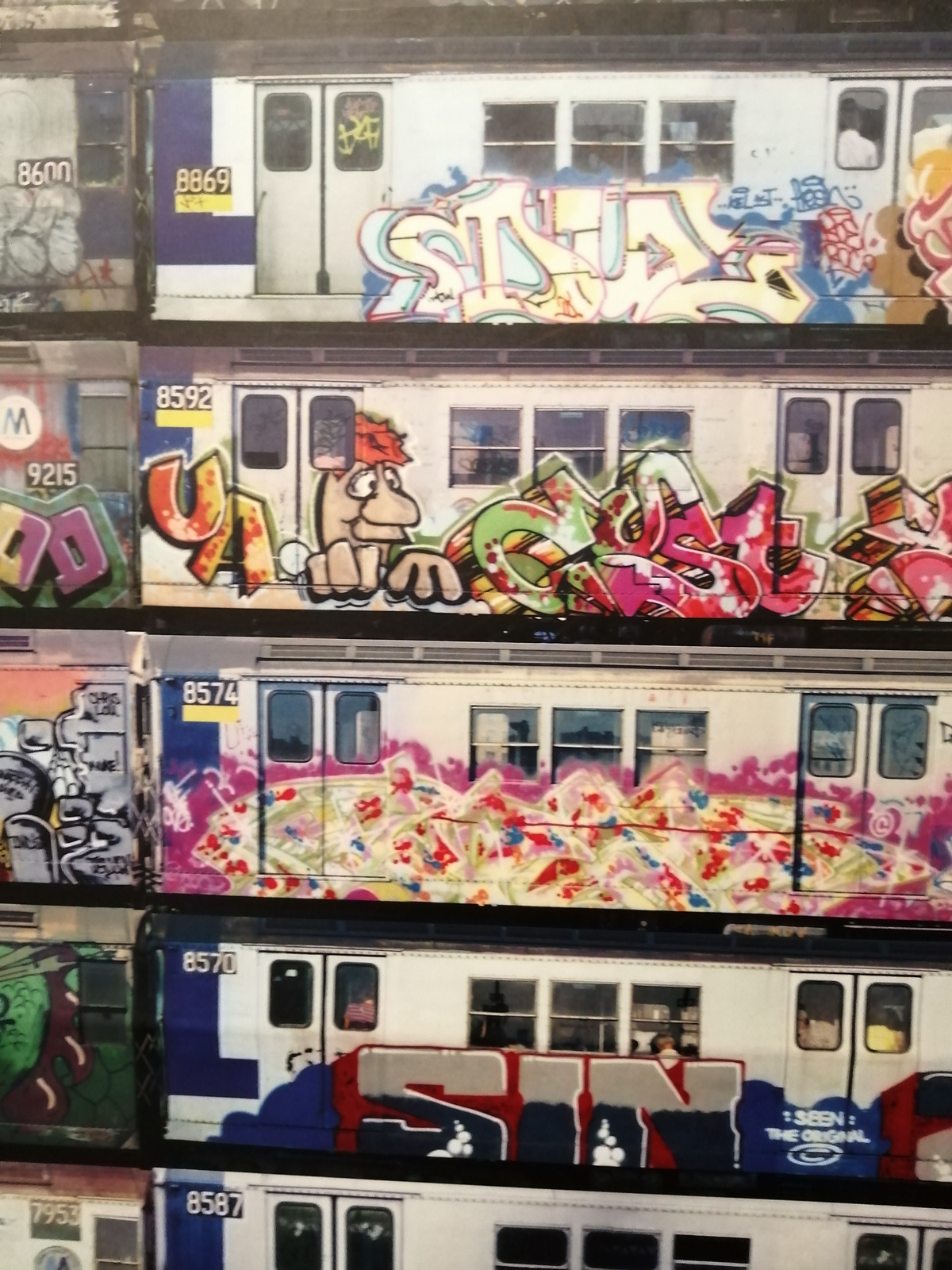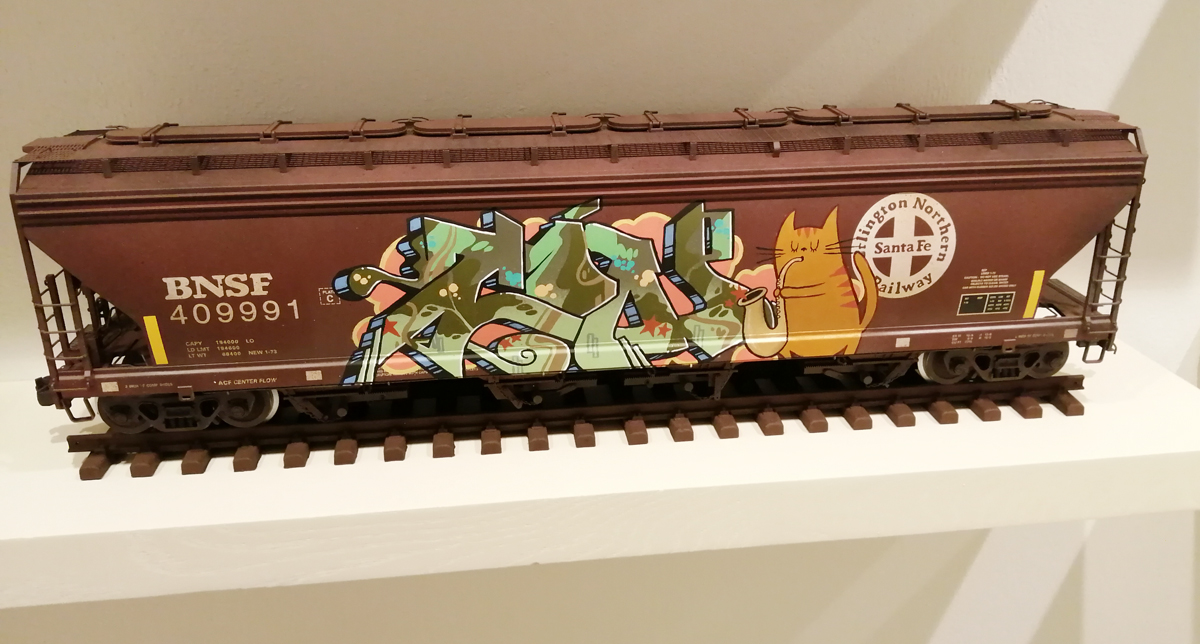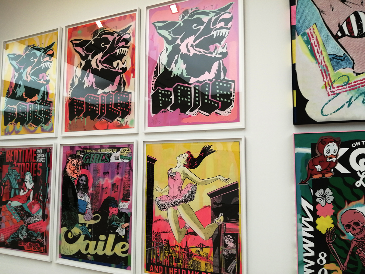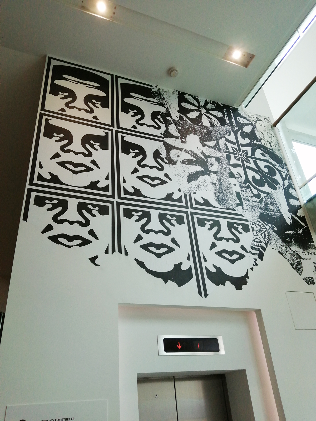 What we have here is a more than healthy mix of installation, history, big pieces of art, music posters, pieces of clothing, recent paintings from names both old and new and more besides. And so much of it, almost feels wrong to go picking out highlights, so many good things to see here, the big Jenny Holtzer wall of words is as powerful as she always is, love the VHILS doors, excellent to see a Futura 2000 in the flesh and we can never see too many Martha Cooper or Henry Chalfant photographs – always loved that Dondi one of him silhouetted between the two trains – yes, like everyone else, I’ve got a well thumbed copy of that book, ordered it as soon as it came out, has any art book ever had more of an influence than Martha Cooper and Henry Chalfant’s vital 1984 book Subway Art? (and yes we did use some of it for backgrounds when the first black and white photocopied cut ‘n paste hand spray painted edition of Organ came out in ’86, indeed the book is still to hand right here in touching distance right next to me in the studio right now). Those Faile pieces are wonderfully good, and no, not tired of Shephard Fairey‘s refined colours yet. Damn good to see Malcolm Maclaren‘s Duck Rock featured strongly (and the original ghetto blaster recreated), Duck Rock was an important album back there. From what I remember, before the excitement of Martha and Henry’s book (I was a teenage fresh-out-of-school art foundation course student at the time, picked it my order from the book shop at lunch time, took it back to collage in the afternoon and we spent the rest of the day arguing about it – rather violently as I recall – some of the old school art lecturers did not like it! Fair to say it had a big affect on my life), before that book there were exciting glimpses of graffiti and street art things via videos of people like Blondie or Grandmaster Flash on the telly and then there was the brilliant sound of Mclaren’s Duck Rock album and all that scratching making me itch – there was that and then there was the main source for graff imagery that was the underground punk/skate scene, the zine and tape trading culture, the glossy skate magazines that came over, the underground thrash, speed metal and hardcore punk publications that was fusing things together (the Beastie Boys and their hip hop is well represented in the show but hey, they were an underground shouty hardcore punk band stages with Agnostic Front, Murphy’s Law and the likes well before that brought in the hip hop flavours, go find the dubiously named Poly Wog EP) – all that underground punk, not the NME version of punk, the real word of mouth stuff was coming over from America and mixing with the underground zine and tape fuelled UK hardcore punk/crust/squat scene that in turn was a rather big underground deal over here at the time. All about those skate mags, punk tapes and photocopied zines and tape trading lists and distros and cans of Halford’s car spray if they’d let you buy it (why do you want all these colours? What make of car did you say you were painting? No we’re not selling it to you!)