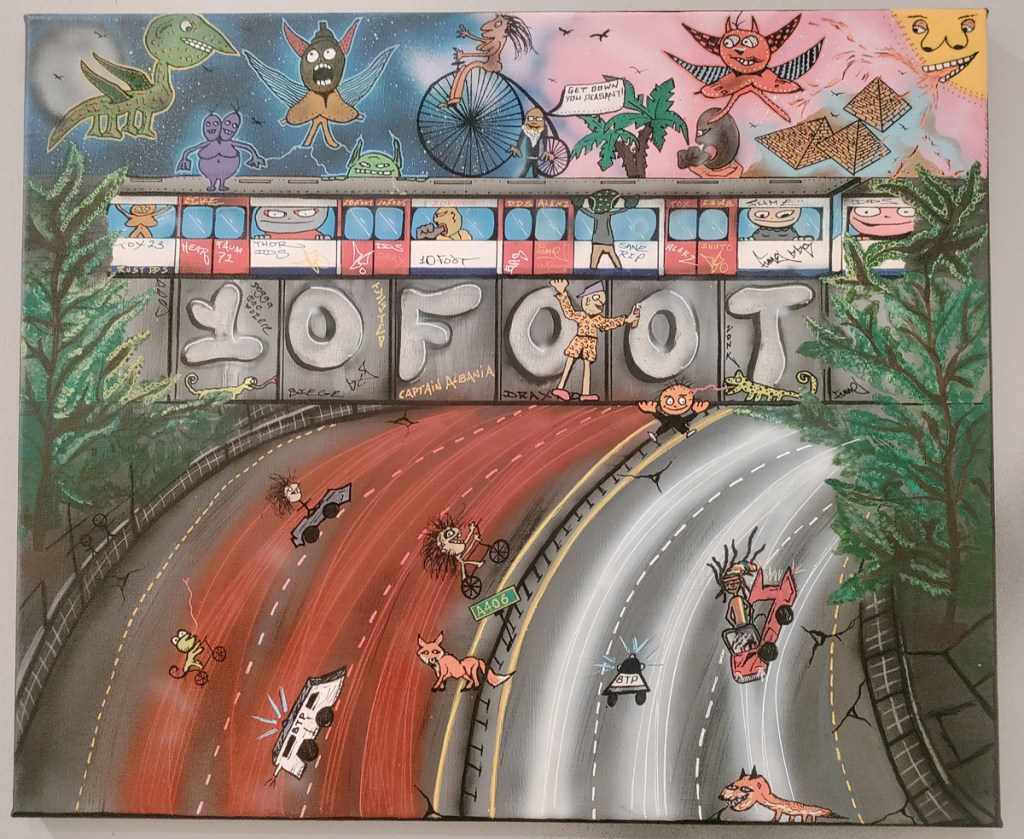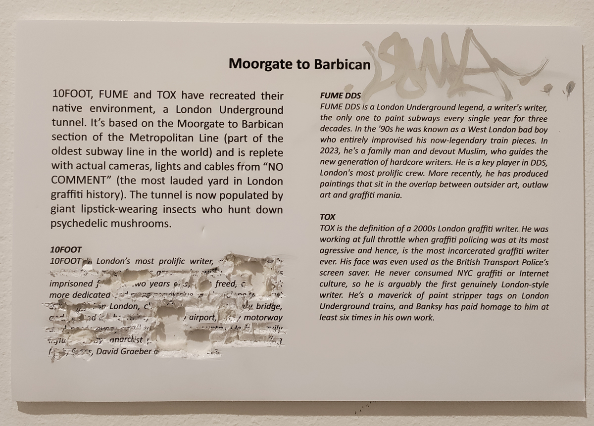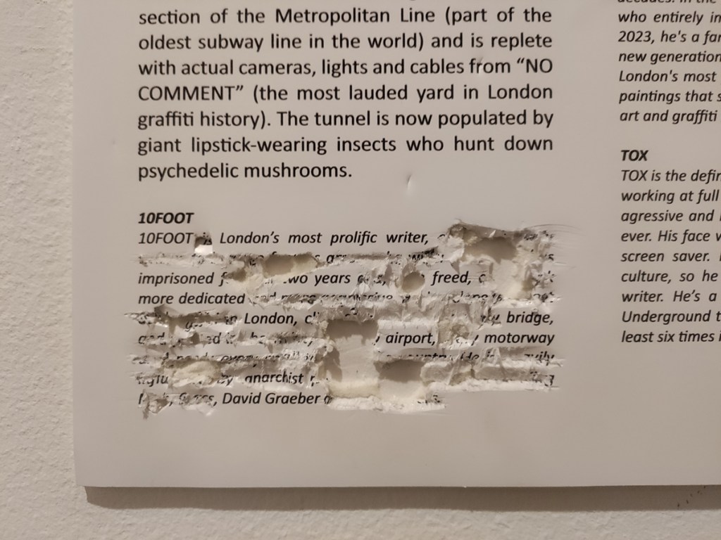 Back to the future or at least back to this week, The 10 Foot installation is of course “interesting”, how could it not be? “What?!” I hear you cry? 10 Foot and mates in an establishment gallery like this? Surely that’s wrong? Yes! So wrong it might just be very very right?! Something akin to Jonny flogging butter on your TV screen maybe? Tox 23 in Saatchi Gallery, what is going on? Tongues in cheek? Love it! Good bit of 10 Foot writing as well, actual writing, almost an essay, up there on the gallery wall, important stuff, good stuff, good good good…