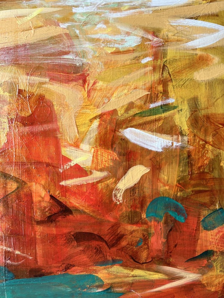 In this way, the landscapes become sensorial maps that carry us not just through space but also time. Each work is embedded with complex and specific emotional experiences and memories, and yet, the rich textures, vivid colours and bold, geometric shapes invite us to also find connections to the land through our contexts”.