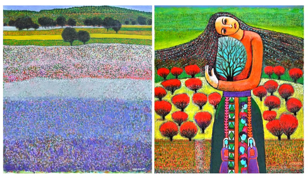 In several of the paintings, the figure of a woman (or women) appears within the landscape as an allegory of Palestine – the mother, the source of nourishment and shelter for her people. In Nudes and Landscape (2021), rows of undulating bodies imply hills or mountainous ranges while in an untitled work from 2022, a gigantic woman in an embroidered skirt rises up from the centre of the earth, her brown hair, filled with blossom, spreads out across the top of the landscape while at the centre of her chest a silhouette of a tree floats within a glowing turquoise orb. In this work, as elsewhere, Anani subtly infuses the landscape with the colours of the Palestinian flag – red, green, white and black – as a symbol of strength and resistance. Elsewhere, vividly coloured fields rendered in scattered brushstrokes take on a post-Impressionistic quality that evokes a sense of both movement and serenity – like a warm wind blowing through the crops.