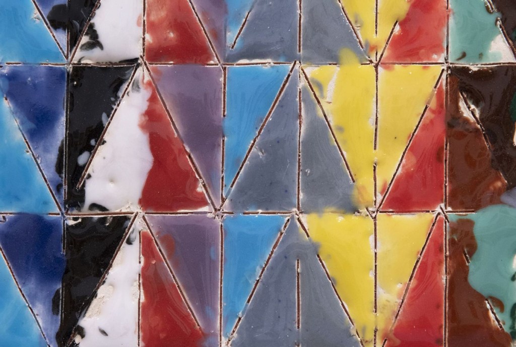 The exuberant colour palette of these works, which read like abstract paintings, derives from memories of early exposure to Pennsylvania German art. The ceramics have become a means for the artist to reflect on the inception of her artistic sensibility and its investigation into the materiality of colour. Their titles refer to familiar geometric Amish quilt patterns, created by women – waves, diamonds, the stripes of Joseph’s multi-coloured dream coat, flying geese, stars, log cabins and checker boards. Apfelbaum writes: ‘I usually work fast, but ceramics has slowed me down, the drawing comes first, then the painting after. Glazing is like painting and I really love doing it.’
