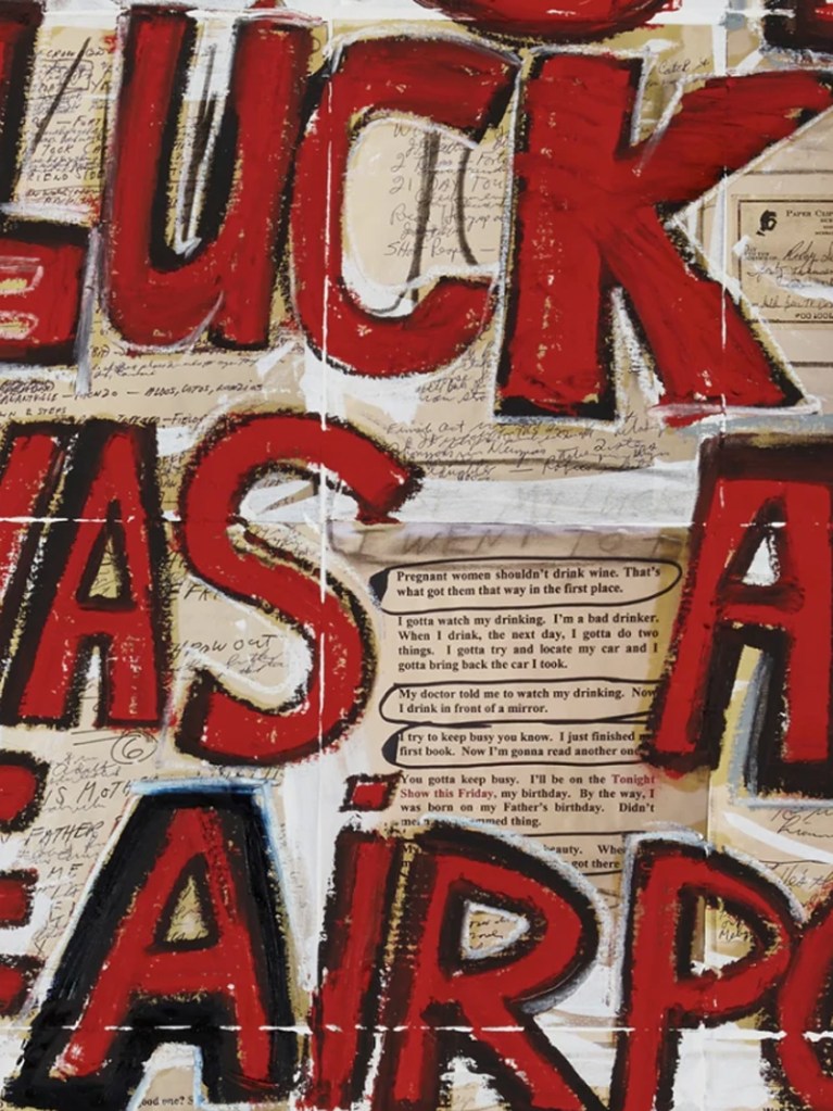 Made during the pandemic, between 2019-2021, these works restage Dangerfield’s jokes in boldly-applied oil stick lettering across the cacophonous back catalogue of the comic’s stage notes from his later years: ‘a black and blue ballpoint pen psychotropic scrawl of automatic writing’. In recalibrating the notes as readymade collages, Prince draws into relief Dangerfield’s short-hand observations on contemporary life, both exposing and parodying received cultural associations and norms.