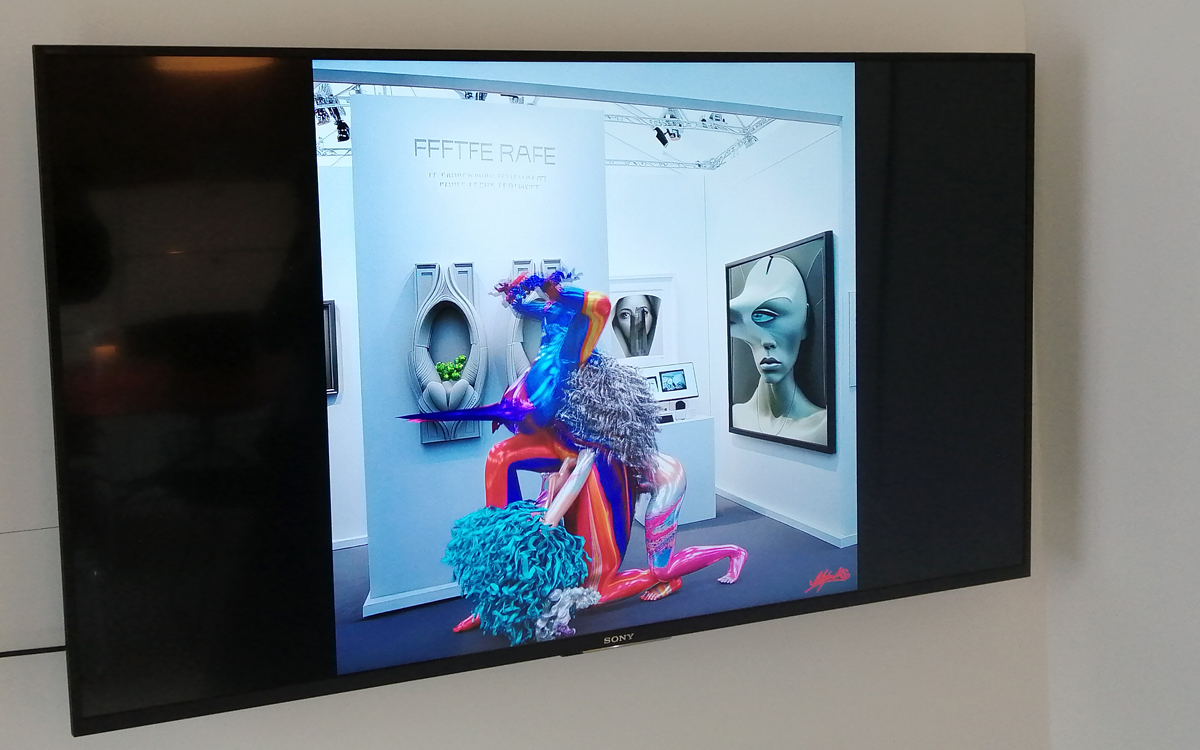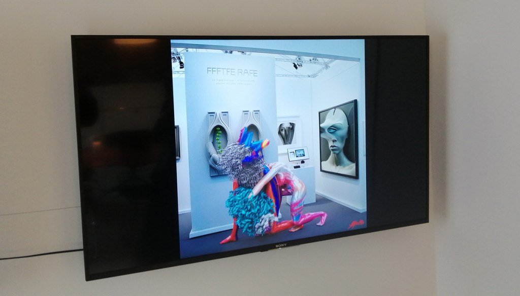 Oh look, I don’t know, it says here (in the gallery statement on the show) that “from New York to Basel, Miami Beach to London, Moghaddam disrupts the economic and social operations of global art events with her augmented posthuman creations. Taken together, Moghaddam’s #Arthacks speak to the artist’s adept integration of glitch aesthetics, meme culture, and AR technologies to centre urgent political movements within the often depoliticised atmosphere of contemporary art fairs” – but then does she really? Disruption? Really? Did I miss all these global art events being disrupted? Pretty sure Frieze London conservatively happened as it always does, pretty sure Miami went on with no disruption, did I miss the reports of disruption to the global art economy? Hey, I liked the art, I stood and watched the cycle of all three pieces several times more that I would have expected myself to do but really? Disruption? As much as I liked the art, as much as I’d happily watch again on a screen here at home time and time again, disruption? Has she really disrupted anything?