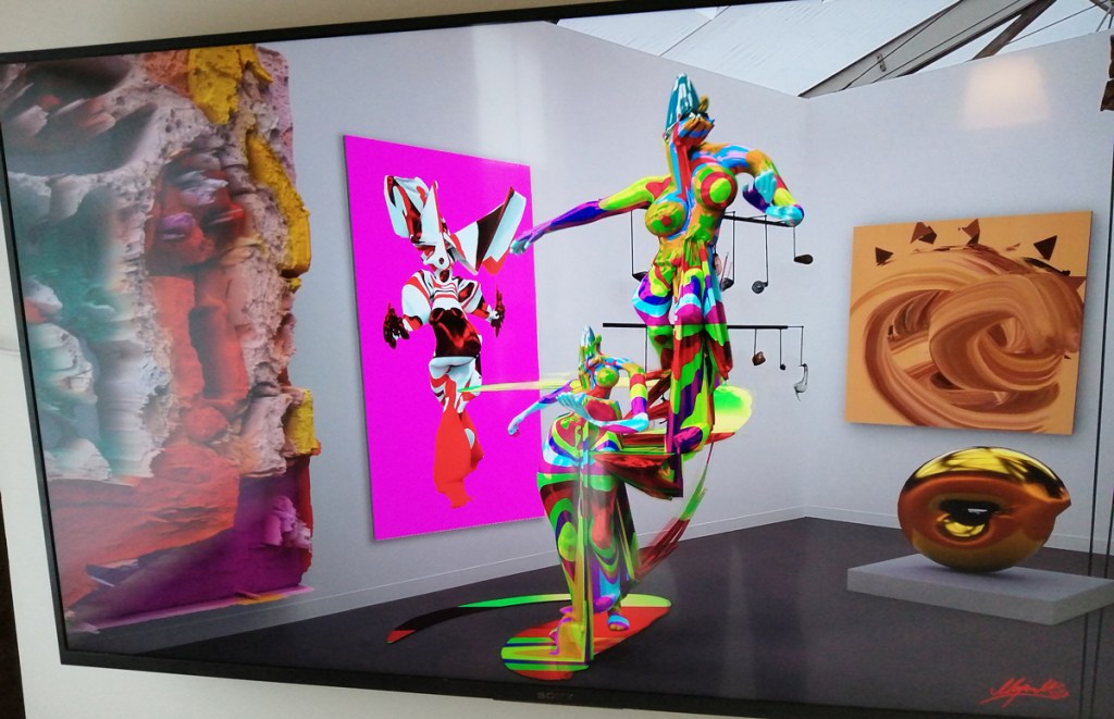 “Presented in Annka Kultys Gallery’s phygital space, Moghaddam’s most recent series of #Arthacks—For Freedom Part I (2022), For Freedom II (2022), and The American Hush (2022)—are located within real and imagined art fairs. The artist borrows from footage of the fairs shared online as well as conjuring speculative art events with the popular text-to-image AI tool, Midjourney. Within these interventions, Moghaddam’s distorted and hallucinogenic 3D CG figures, which the artist refers to as Chronometric Sculptures, take over sales booths and blackjack tables, even utilising the polished concrete floors between gallery outposts as their own personal runway. Often set to remixes of the Persian protest song Baraye by Shervin Hajipour, Moghaddam’s #Arthacks bring the activist potential of art to the realm of mixed-reality”.