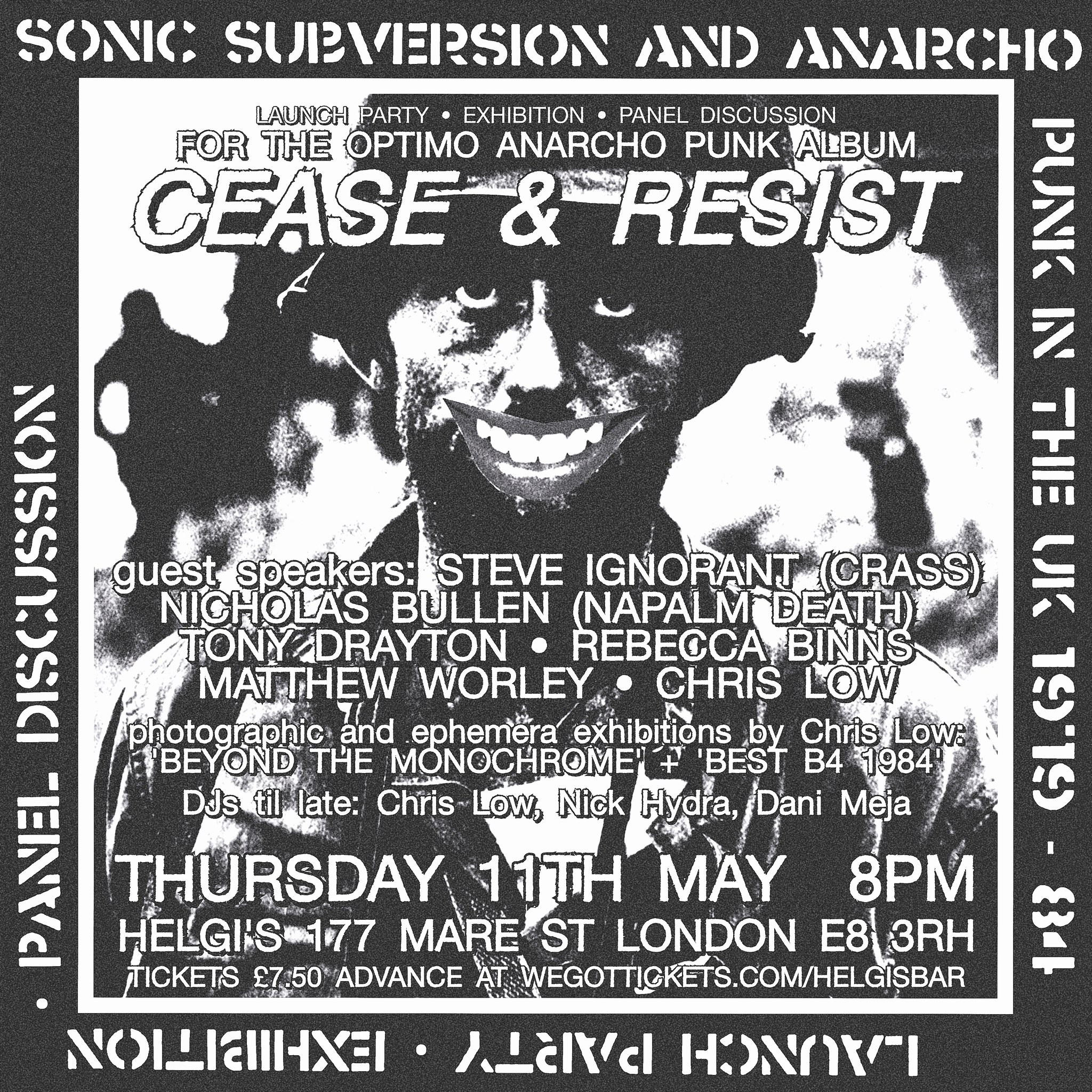 “Announcing the London launch party for the Optimo Music album: Cease & Resist: Sonic Subversion & Anarcho-Punk In The UK 1979-86 Featuring DJs playing a selection of Anarcho Punk records; Q&A Panel featuring a number of significant figures from the scene and two exclusive photography and archival exhibitions!