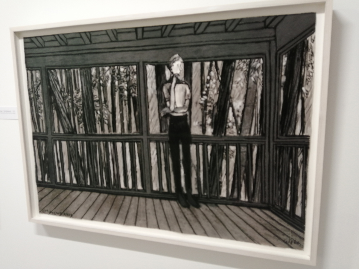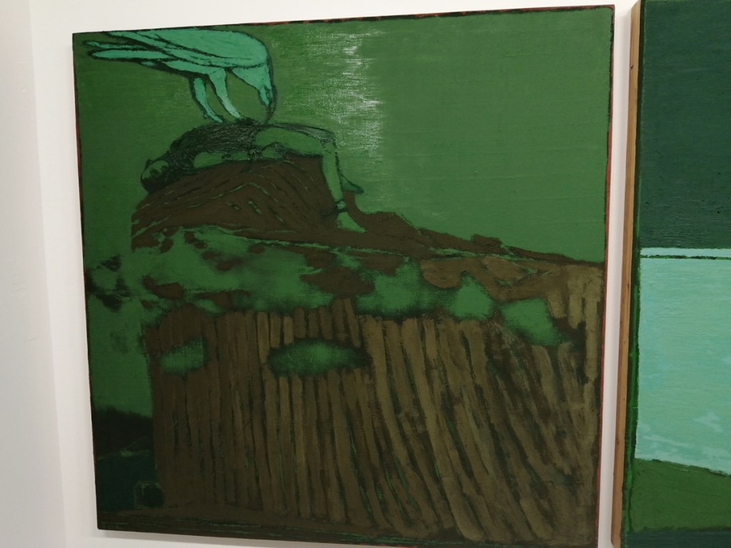 There’s essentially two things going on in here, two things very much in tune with each other, one is the drawings, the black and white very painterly drawings, the other is the rich rewarding greens of the paintings, greens that are almost blues, greens that unite the room and bring together the many conversations in such a, well I want to say in such an exciting way, but no, that isn’t quite right, the room is exciting, almost breath-taking but that isn’t quite right, it feels too calm for that, not excitement, soothing and at the same time demanding maybe? There’s something about (good) painting that demands of the viewer rather than just allows for passive viewing, it is a “wow”, it is exciting, the three paintings (is it a triptych or just three paintings side by side?), the three paintings in a line on the one wall, and then a scan to the left and Richard Kenton Webb’s take on that line where sky meets sea thing that anyone who has lived on coast always needs to get back to and just endlessly look at. Exciting isn’t quite the right word, the work is lost right now, there is a word, I’ll find it in a moment…