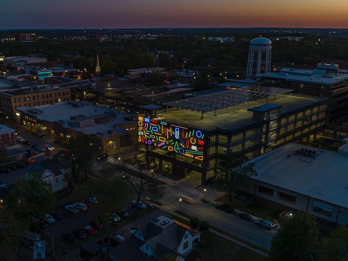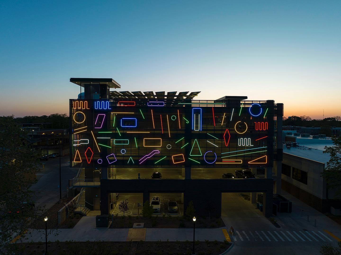 “Unveiling Interactive Neon Mural #16 by Spidertag, our latest permanent public art project in Bentonville, Arkansas courtesy of @ozartnwa This monumental piece- the artist’s largest to date – spans an impressive 4,600 square feet and invites viewers to actively engage with the art through playful interactions of light and motion”.