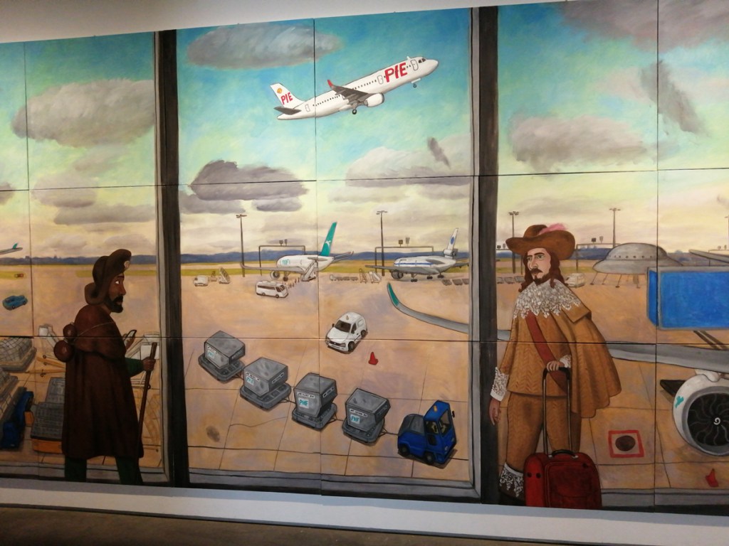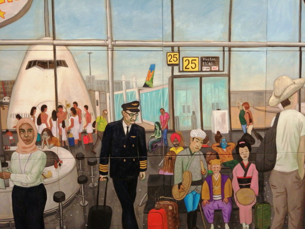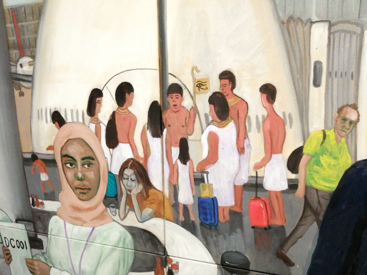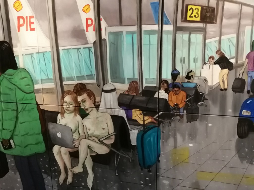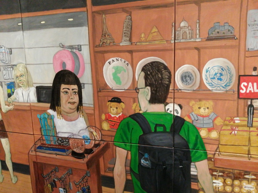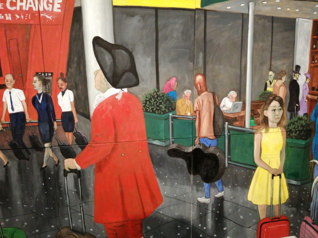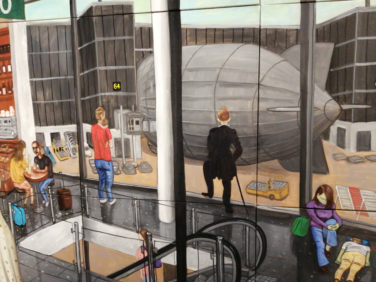 It certainly is intriguing, you are dragged in, maybe tirade was a bit strong, the work doesn’t shout and once you have taken in the overall vastness of it and you’re over the initial reaction, it does demand you focus on relatively small details, the titles of the books and what’s that doing there? Where are they going? What’s that guy from the 18th Century doing flying on a commercial airliner? Parts of it look like the departure lounge from Men In Black. It is fun, it does make you smile but but but, when you really look at it, it all feels just a little cartoonish, a little too cartoonish maybe? A little too throwaway, dare I say silly? The paintings, the whole piece feels like a series of book illustrations (for a not that serious a book) and yes it might be making valid points, comments, but as a visual piece of art, ambitious as it is, it feels (although it must have taken months (years?) rushed, the canvases feel like they weren’t quite concluded. slightly unresolved.