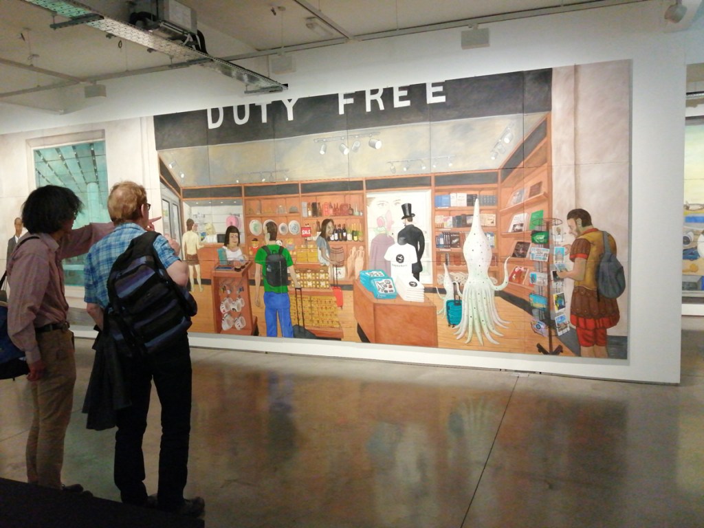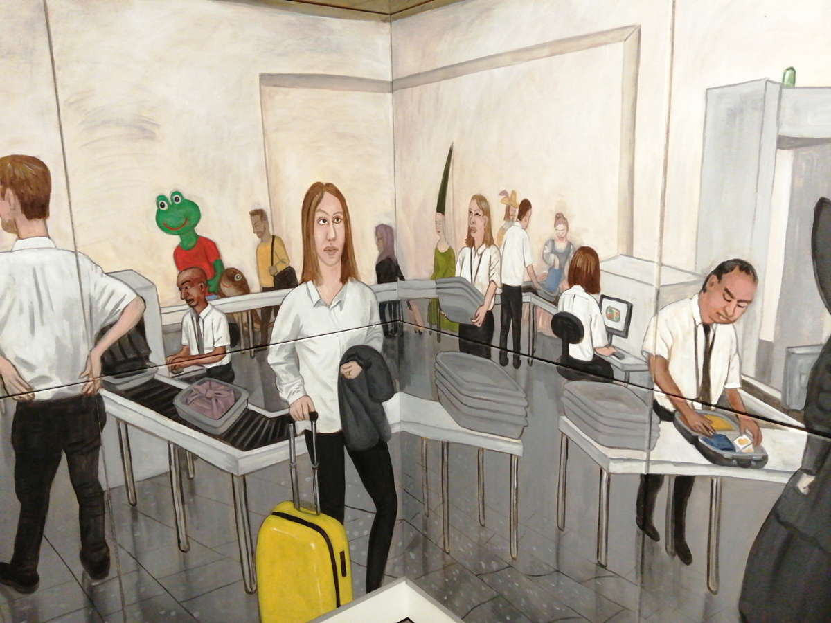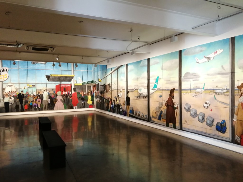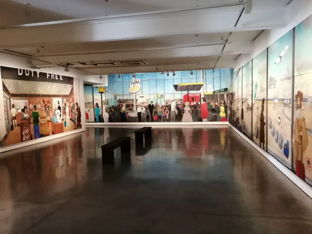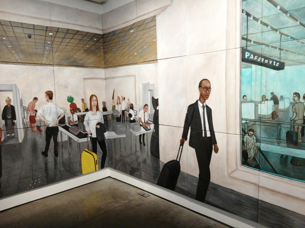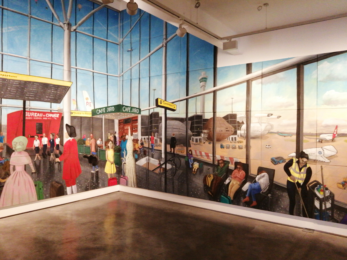 “In Departures, the gallery will be filled with a continuous series of paintings, covering a space of more than 160 square metres. The highly detailed paintings weave a seamless journey through the building, traversing the crowded halls, shops, and waiting areas in between, creating an unfolding stage for individual and often unexpected narratives to occur. Hundreds of fictional characters occupy the busy departure lounge, some of whom may be visitors from past centuries or other galaxies, waiting to board flights bound for mythical destinations. As the title suggests, Departures is a launching-off point from which viewers are invited to explore imaginary journeys of their own”.