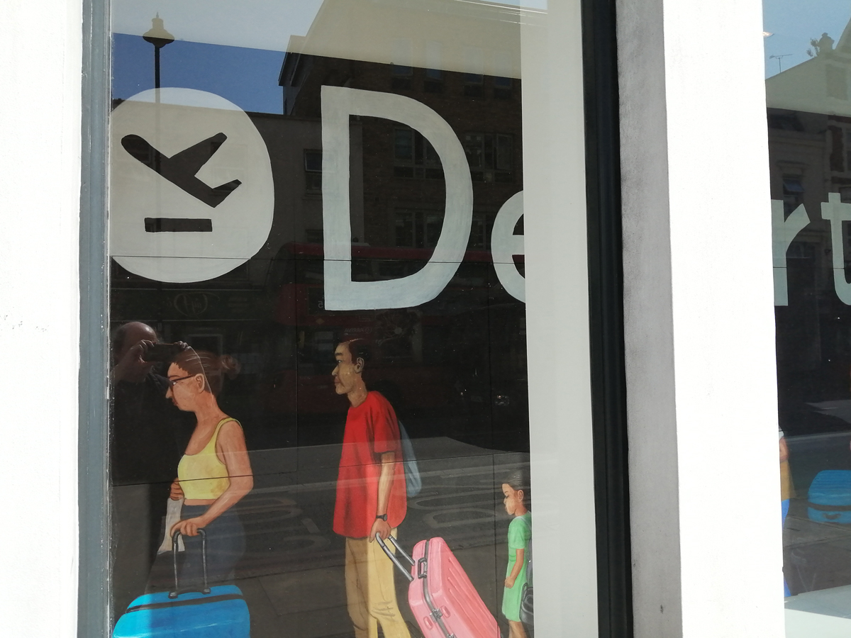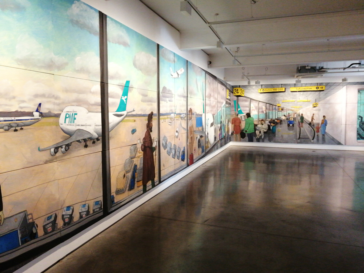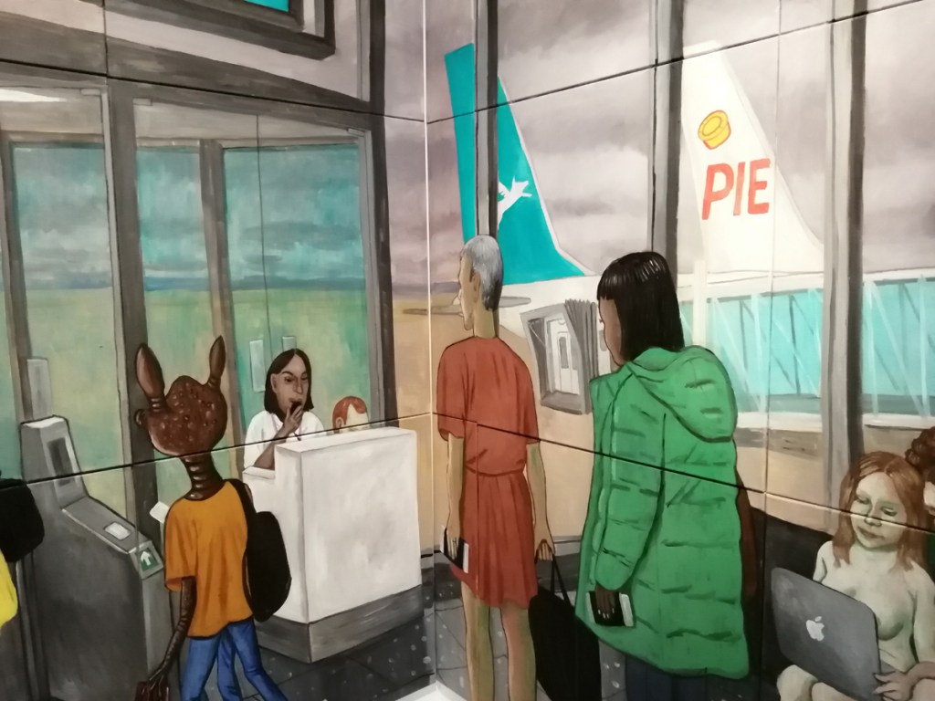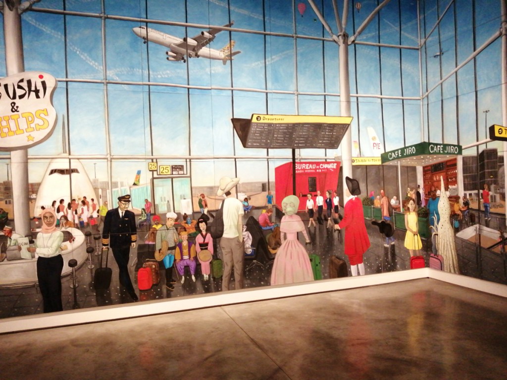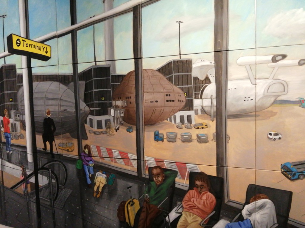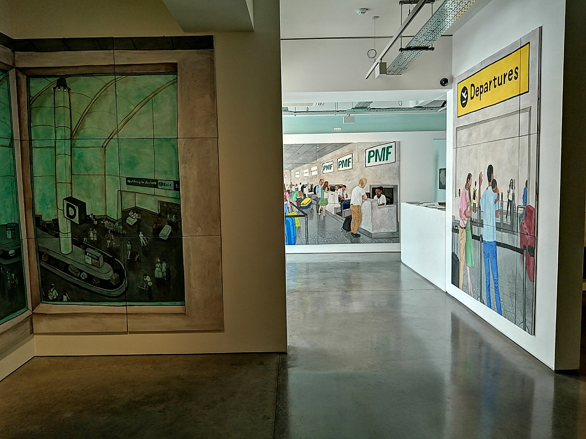 “In Departures, the gallery will be filled with a continuous series of paintings, covering a space of more than 160 square metres. The highly detailed paintings weave a seamless journey through the building, traversing the crowded halls, shops, and waiting areas in between, creating an unfolding stage for individual and often unexpected narratives to occur. Hundreds of fictional characters occupy the busy departure lounge, some of whom may be visitors from past centuries or other galaxies, waiting to board flights bound for mythical destinations. As the title suggests, Departures is a launching-off point from which viewers are invited to explore imaginary journeys of their own”.