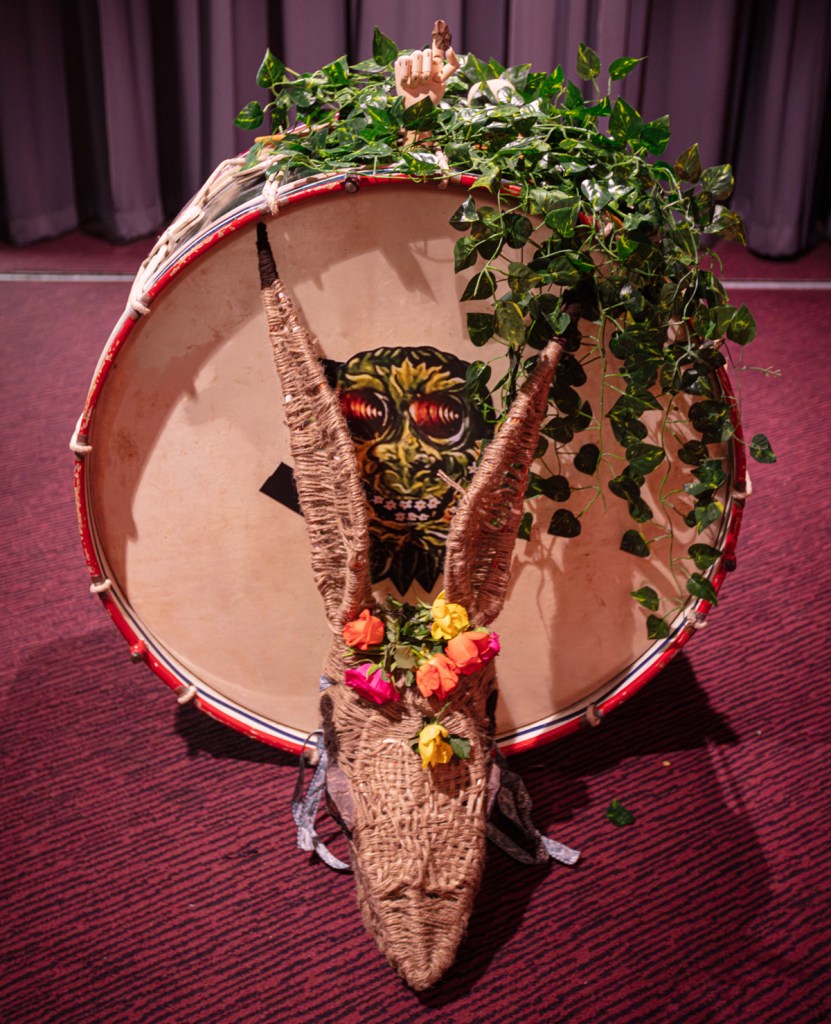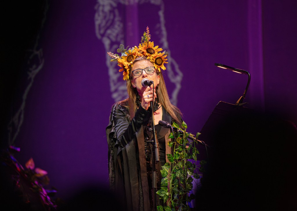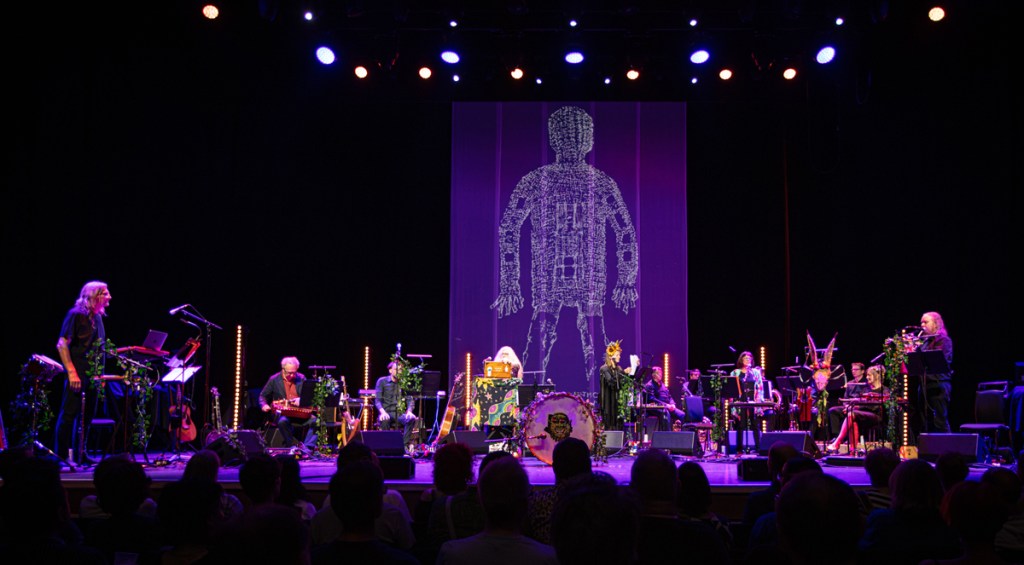 The original rather British film, 1973’s gloriously strange and at times (very) dark The Wicker Man drew from Britain’s pagan past, and indeed its music – the soundtrack is brilliant, fusing a traditional feel, traditional old songs with new pieces, with strongly folk flavoured bawdy pub singalongs, it is now widely recognised as a classic, a word of mouth bootleg trade of both the music and fifth-hand VHS copies of the actual film (that I first recall seeing sometime in the 70’s, without any knowledge or warning, just after Match of The Day on the BBC late on a Saturday night). Paul Giovanni’s excellent soundtrack is widely available now, once again we owe Johnny Trunk a big thanks and we the audience collectively know it well enough to anticipate pretty much all of it. There’s a warmth in the hall, a shared delight, the film might well be rather dark, disturbing, the horrified noise of the animals (rather than the very straight-laced policeman), but there is a delight, a psychedelic English/Scottish folk delight, and yes there is a strong sense of that counter culture element, the whole thing is very 1973. Tonight, fifty years on, it is clear that the performance is an organic labour of love, that the players have a strong affection for the wonderful mixed bag of music, the oddball eccentricity of it all, no part ever at odds with another. The performance is a triumph, the whole thing greeted with loud cheers at the end, the packed audience united in the delight of it all and oh god and Fireleap and Maypole, and in the woods there grew a tree and yes, excellently perfomed.