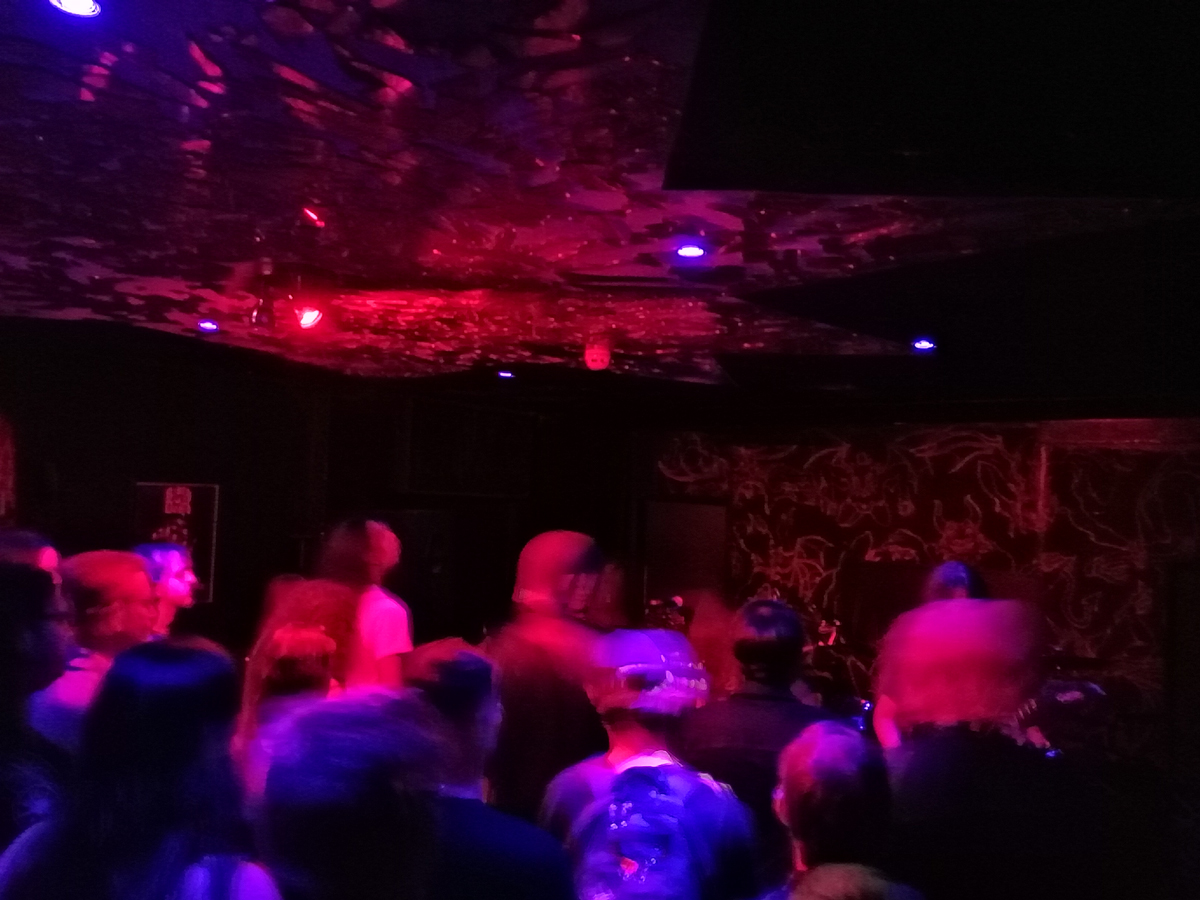 “We’re Craven Idol from North London” growls yer man, way out of the comfort zone of their home ground tonight then! All the way over here in deepest E8, one stop from that portal to hell or maybe that much needed new coffee shop. Things are of course as intense as you’d expect them to be from the off, that stew of old school extreme thrashing speeding black freight-train-in-a-tunnel-get-out-of-the-way metal. You are kind of fighting for a bit of clarity, it is pretty much a high speed wall of intense noise, somewhere in there there are tunes are trying to break through as screaming riffs pile up on top of pounding drums and dark dark baselines. It is gloriously relentless, gut churning rather than violent, it is more about the intense feeling, the power, the challenge laid down, the pure thrill of the relentless waves of it all in here in this tiny black bunker of a venue. It isn’t that they’re playing it stupidly loud, Craven Idol are too good for that, too good to be just about noise and confrontation, but it is kind of hard to work out which of their excellent pieces they’re actually performing at any given time. I assume it is mostly material from the impressively good Forked Tongue album, the long-standing band’s most recent piece of work, an album that’s alive with colourful detail, clever colour, dark aggressive colour, colour that is kind of lost here tonight. Colour lost in here in the beautifully intense maelstrom, in the whirlpools of noise, in the pounding and the riffs and the growling screams and death booms (Frosty grunts?) that are relentlessly coming at is. Yes it is beautiful, really, this is a beautiful noise, almost graceful, there is a genuine beauty in here in the extreme intensity, in the red light and the sound coming back off the black walls of this rather fine venue.