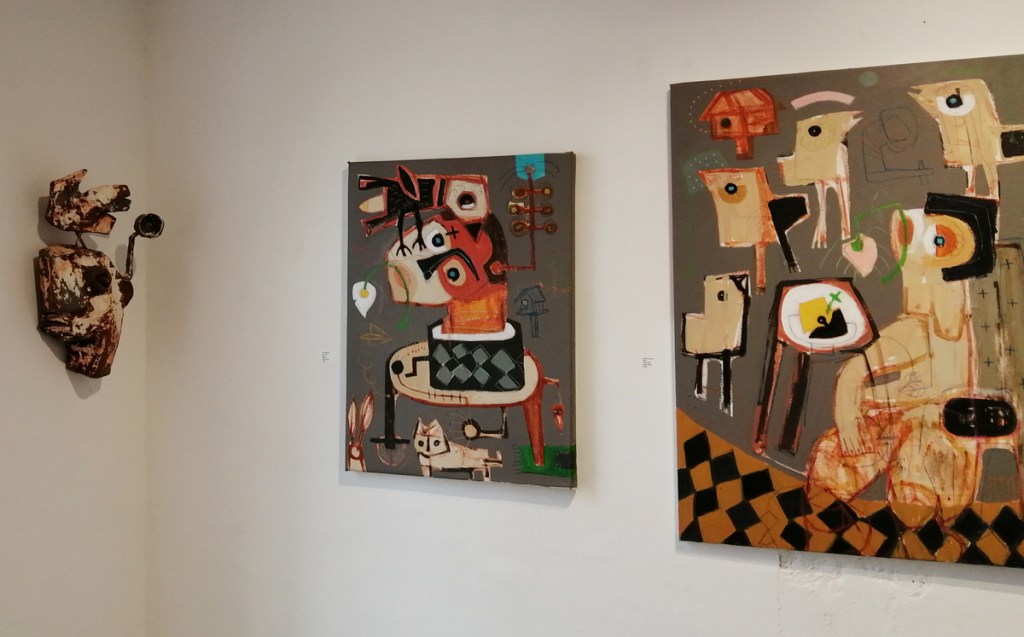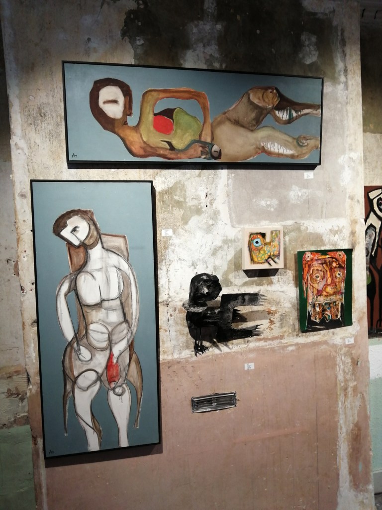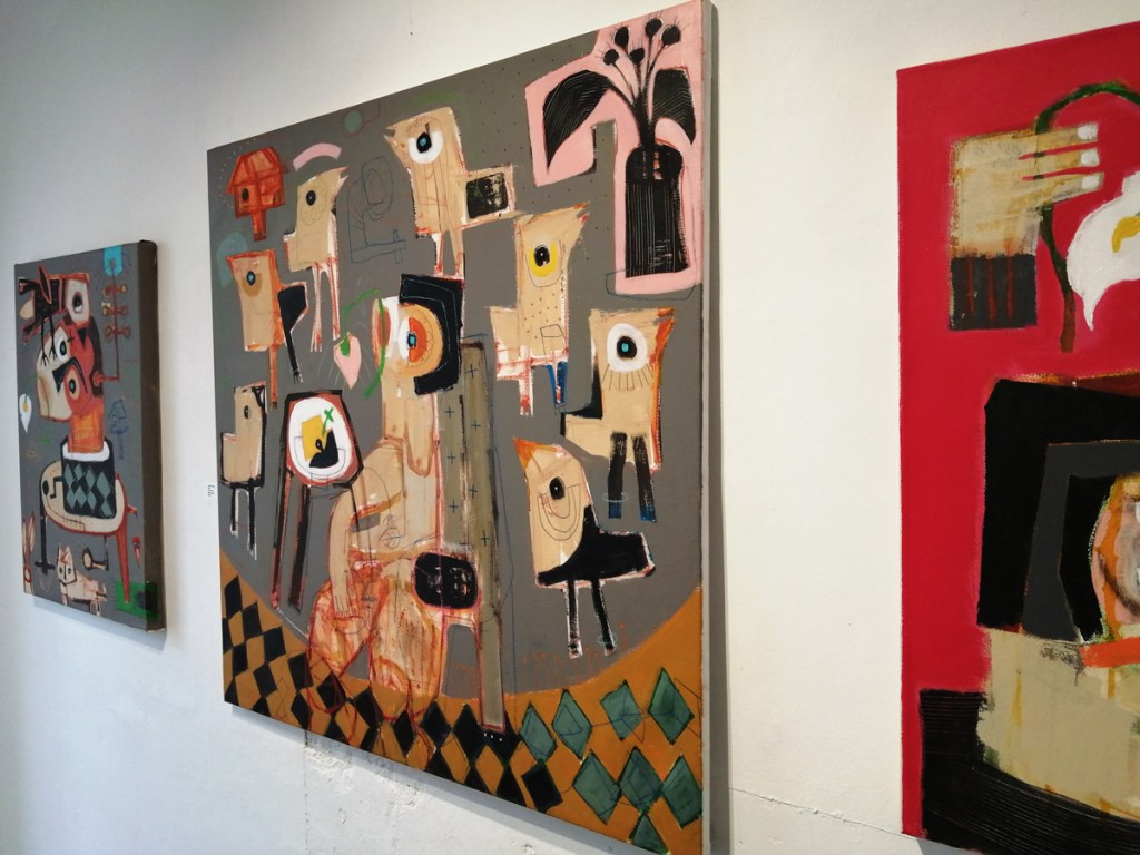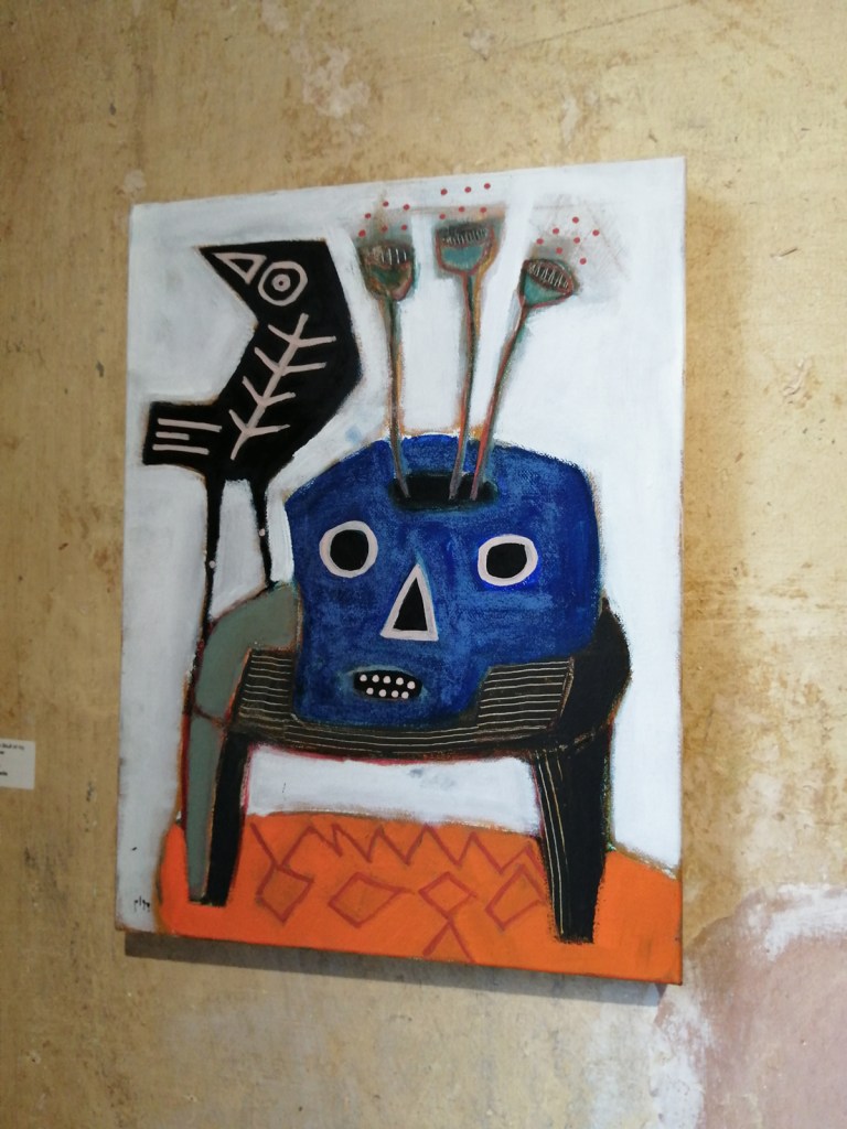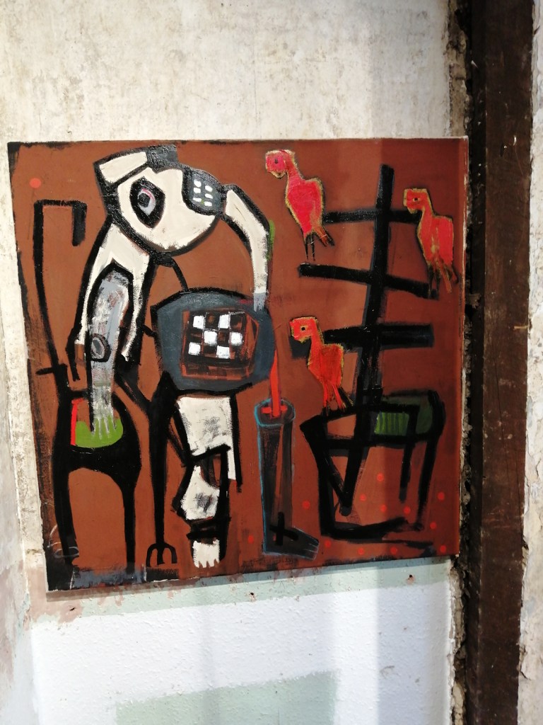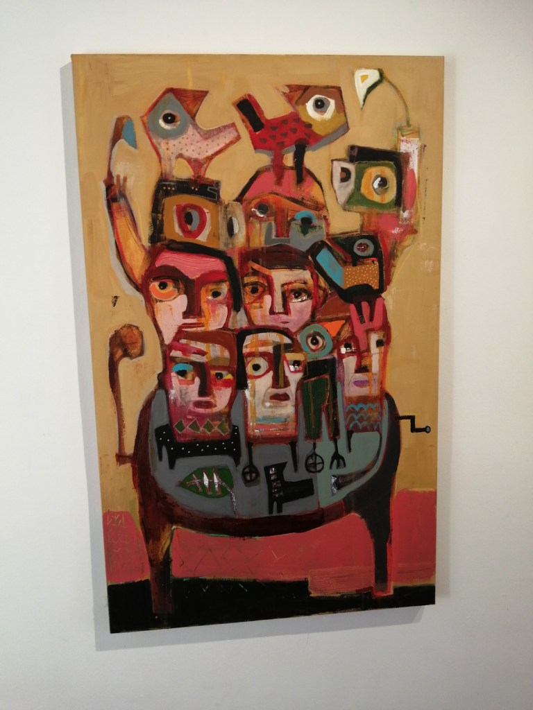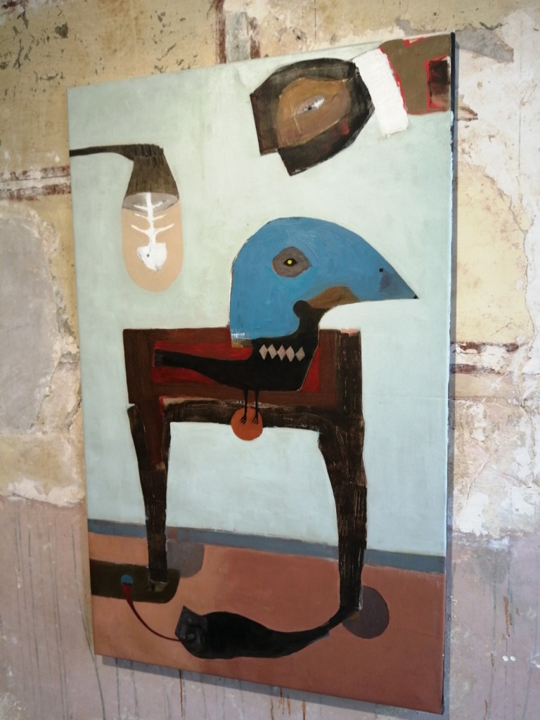 Semaan Khawam himself is introduced as the Birdman by his enthusiastic wine-offering supporters who insist I meet him, I never like meeting artists until I’ve met their work, next time though, next time ‘ll have far more that a handshake and this is great man, I’ve a million questions, then again, I really should ask the paintings themselves. I didn’t quite get the answers from this first encounter with the paintings and the strange bird sculptures (love the strange bird sculptures). Didn’t put my finger on any of it, these are clearly rather special pieces though – intriguing, as demanding as those finches and their mates the pigeons outside the studio here
