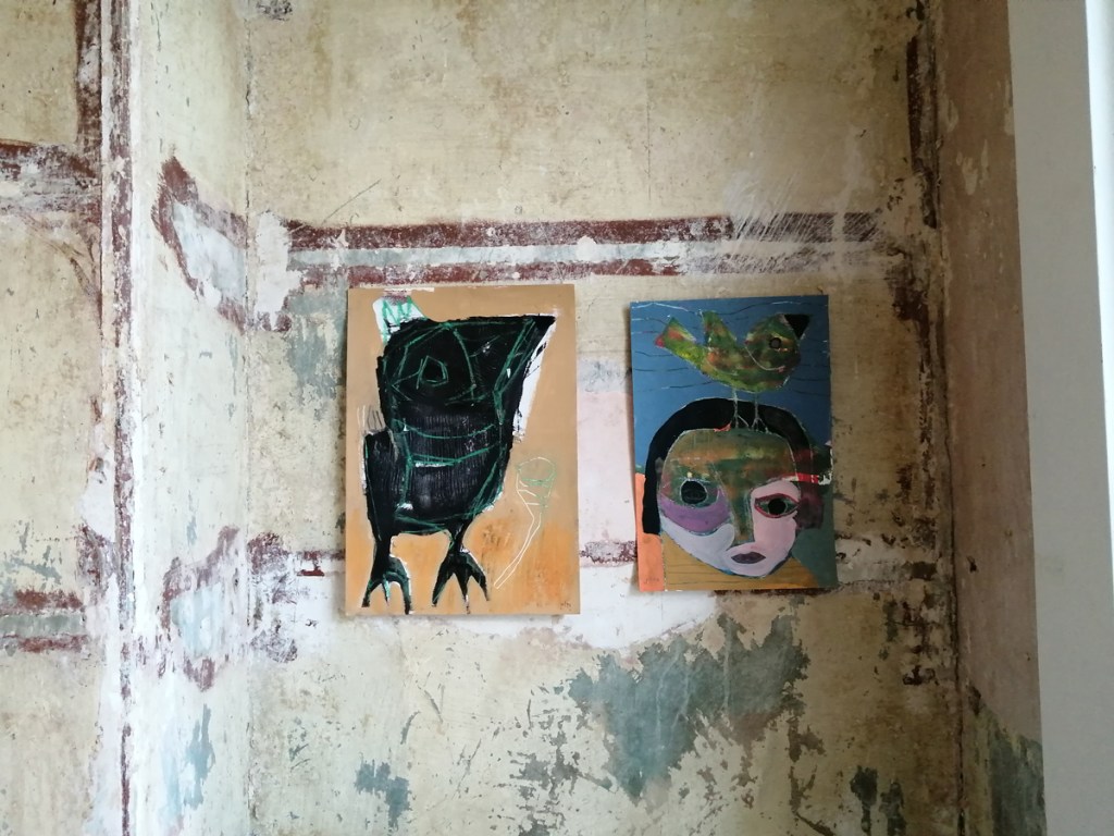 “Imagery and figuration of birds is prevalent in his work, in reference to his alter ego, and hence his nickname, as birds tend to possess freedoms in movement that human beings do not. The lovely little bastards have and will always have that over us….”. Lovely little bastards, I like that, some of the language these little finches use outside the studio here as they wait in line for a go on the feeder is disgraceful. Are these dark paintings? I still haven’t got anywhere near putting a finger on it, still throwing it all around my head, I like that I haven’t put a finger on it, I really like this show.