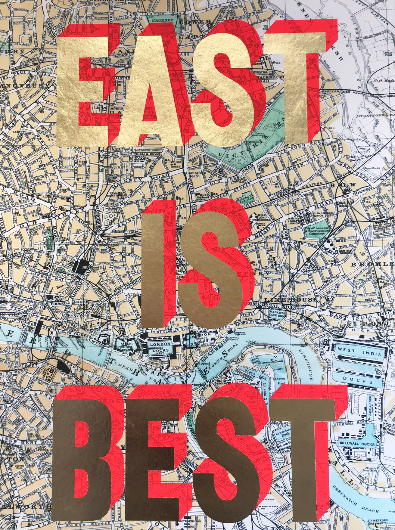 5: Dave Buonaguidi – Here & Now at No.1 Mare Street – on until 16th August with a late evening opening on Thursday 10th August – The Real Hackney Dave, aka Dave Buonaguidi celebrates his love of vintage maps as well as his love for East London at born again space that is No.1 Mare Street. Dave’s show has been open since last week – “We would love you to join us for a drink this Thursday 10th August from 6pm – 8pm to view Here & Now – A celebration of local artist Dave Buonaguidi and his love for maps and the east end. We are lucky enough to have the original maps some of which are over 120 years old. We also have super limited, very special, artists prints – Here and Now Pink Neon, F**king Love this Place, East is Best, Norf Sarf and East End State of Mind”. The gallery add that everything will also be available in their website. in addition “The Pearlie Kings & Queens are joining us on Saturday the 12th from 1-3pm so pop by and say hello to them and have a photo”.