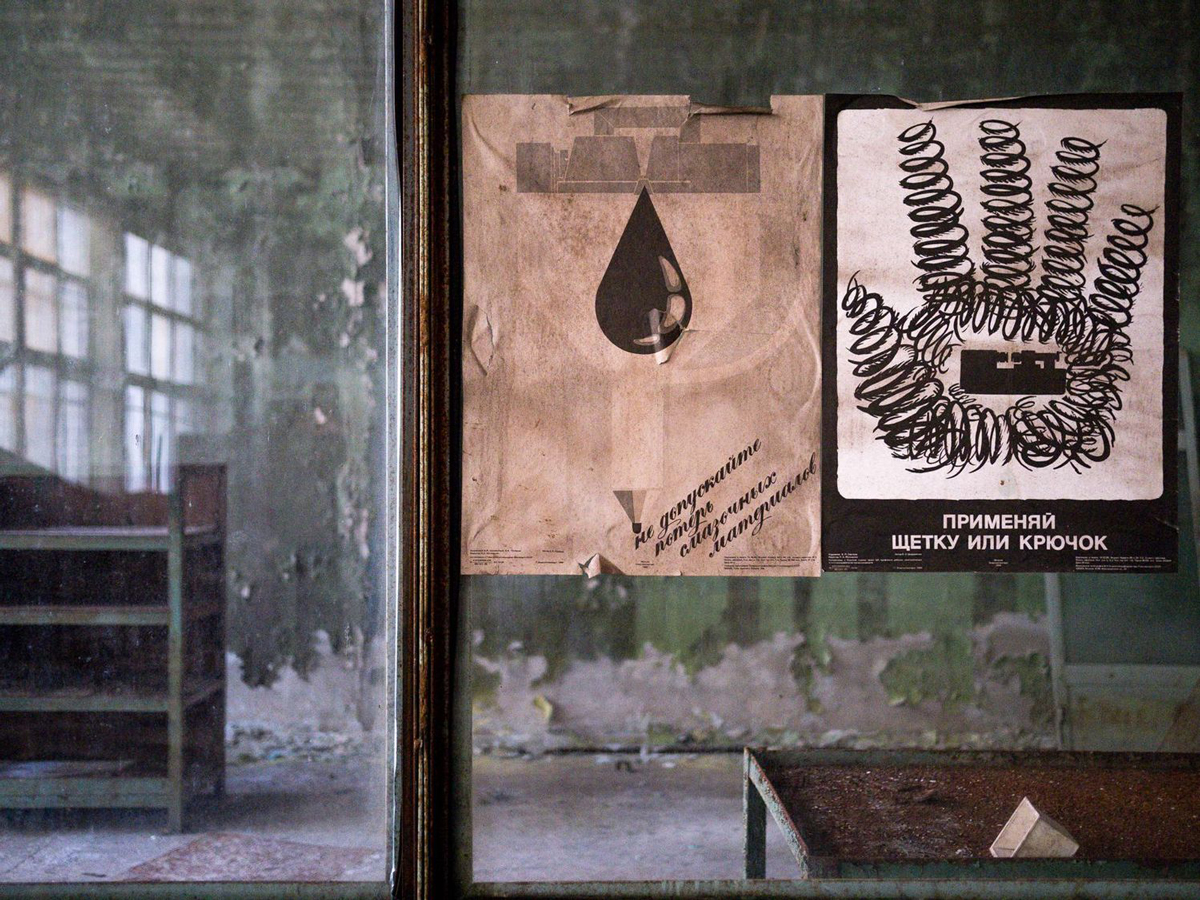 The Jupiter Factory complex lies on the outskirts of Pripyat, the city evacuated in 1986 as a result of the Chernobyl disaster. A series of large multi-storied buildings make up the area which, like most of the Chernobyl exclusion zone, has been abandoned and left to the elements. Within these buildings, the remains of industry have succumbed to time. Yet remnants of the health and safety posters, designed to instruct, advise, and warn about safe working practices, remain.