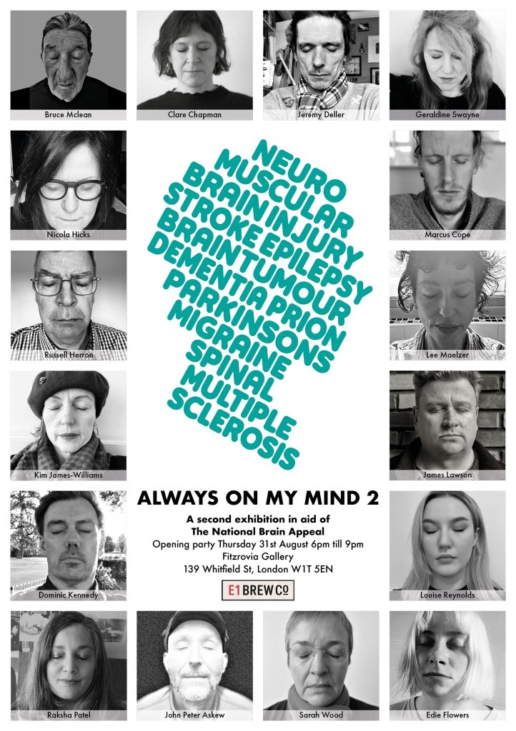 ‘Always on My Mind Part 2’, a thoughtful art exhibition to raise money for The National Brain Appeal. Sixteen esteemed artists are taking part in a show to raise money for The National Brain Appeal. Works by John Peter Askew, Marcus Cope, Clare Chapman, Jeremy Deller, Edie Flowers, Russell Herron, Nicola Hicks, Kim James Williams, Dominic Kennedy, James Lawson, Lee Maelzer, Bruce Mclean, Raksha Patel, Louise Reynolds, Geraldine Swayne, and Sarah Wood will be on display at Fitzrovia Gallery, from 1-3 September 2023. There is an opening night, a so called Private view that we assume is open to all? on Thursday August 31st