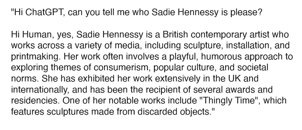 The countdown clock on the Art Car Boot Fair website says we’re only 18 days from this year’s live event on Saturday September 16th at London’s kings Cross. Ahead of the much anticipated event, one of the highlights of any London art year, we’re inviting participating artists to take on our Thirteen Questions and the latest Artist to respond is another Fair regular Sadie Hennessy, I could write an introduction and talk of Sadie’s games of tennis or her Boyfriend Auditions or those tempting fat balls but ChatGPT seems to have done the job for us. …