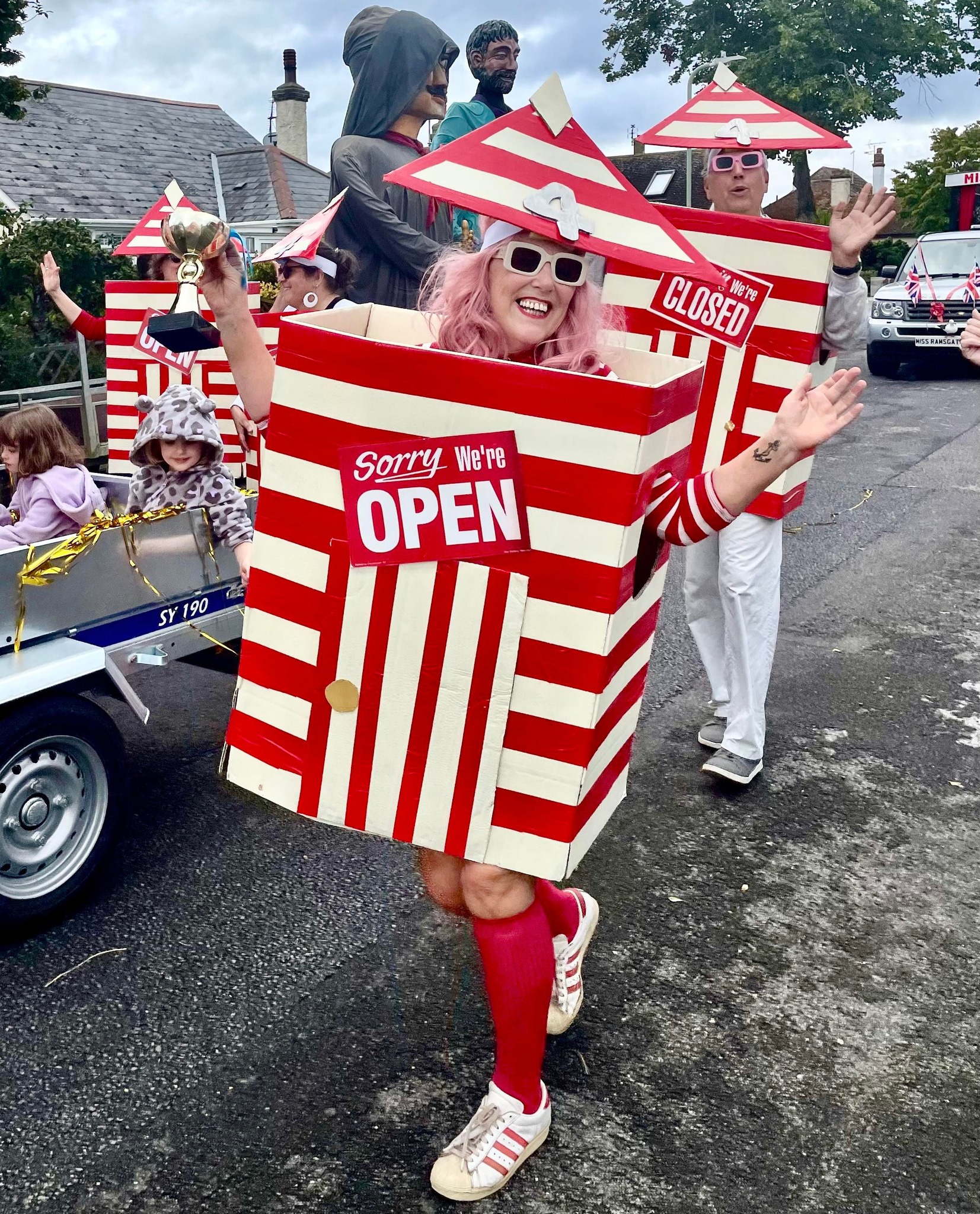 I am lucky as I operate from a base line of general happiness and I consider myself very fortunate about that. As I thought about the question I remembered this moment (pictured below). I was commissioned to make an installation called ‘Jolene & the Jealous Guys’ which was to take place in a rural bus stop in Somerset (For the Od Arts Festival). The idea was to turn the bus stop into a karaoke booth. I had two of my closest pals as sidekicks. Due to the deeply rural nature of the location there weren’t many people around, as there was only about one bus a week, so we spent a lot of time larking about. This was a selfie we took on a timer, which we found hilarious. I just remember how beautiful the village was (it was May and all the blossom was out) and what a laugh we were having, and that made me very happy indeed. (The railing was quite uncomfortable)