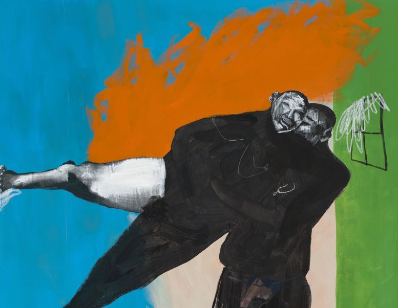 In Fistfight, Al-Atallah is fascinated by spaces of controlled violence; they are intrigued by spaces like wrestling rings where dynamic displays of force and brutality are permitted and encouraged. Al-Atallah recognises that, in these spaces, the dynamism and vigour of the body takes centre stage: gone are all inhibitions, one’s mind rests solely on the idea of overcoming one’s opponent through a demonstration of sheer power and strength. Using images of vintage wrestling as a basis for many of the compositions, the works within Fistfght often record the miniscule but singular and decisive moment before the climax of a battle. Moments like the sudden but minute shift in balance that sends the other fighter tumbling to the ground are captured and frozen in time; lending the works a sense of gravity that compares to the sculptural depictions of the wrestling match between Hercules and Antaeus.