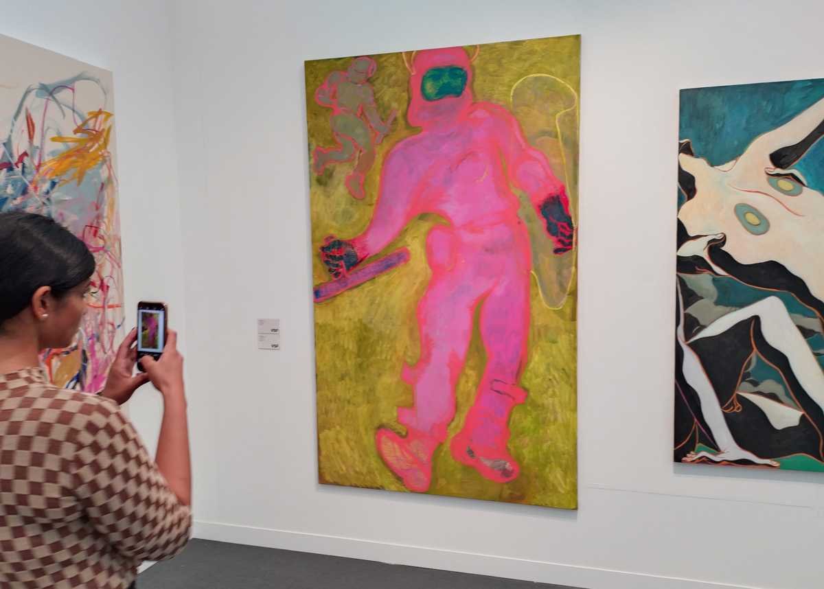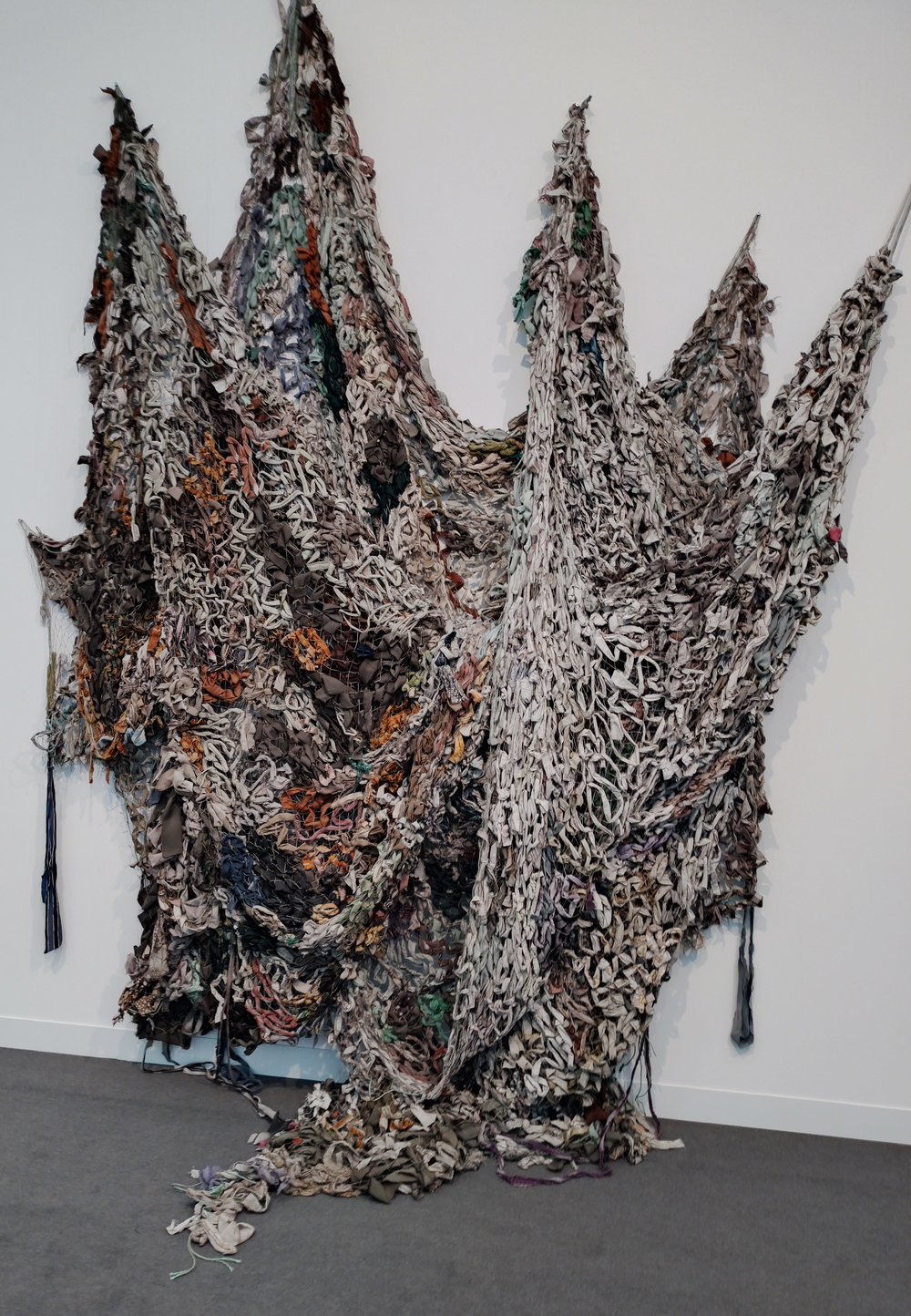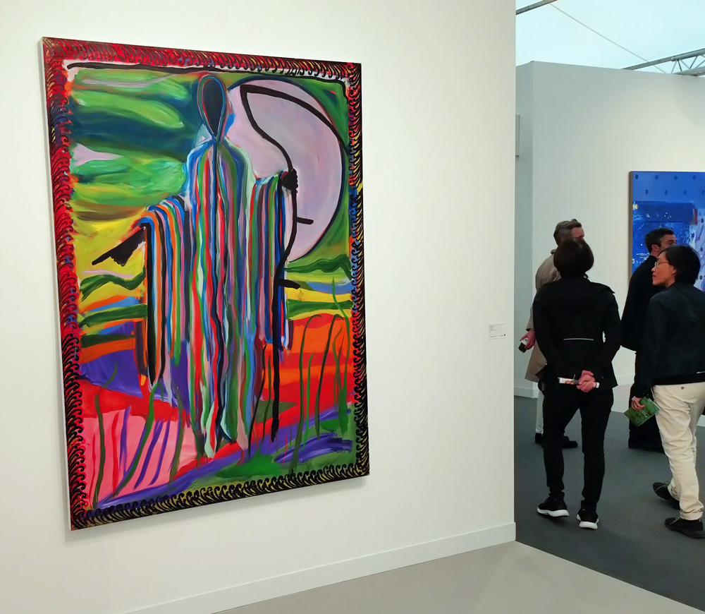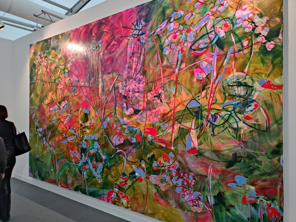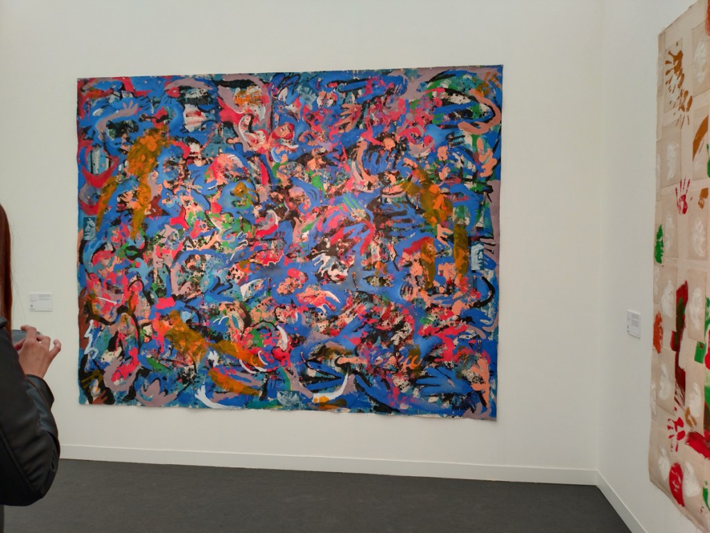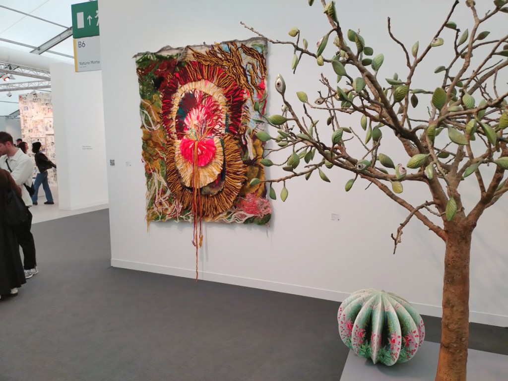 There are Vanessa Raw‘s pieces, a Margate-based painter presented by Carl Freedman Gallery, Vanessa’s paintings stand out, and yes, of course there’s good art in here. Timothy Taylor gallery’s presentation of Eddie Martinez‘s Studio Wall Redux holds interest, Sagarika Sundaram‘s mix of wool, silk and bamboo is a delight of a wall hanging, New Delhi’s Nature Morte Gallery always bring something different to Frieze, they are almost always one of the delights of the fair, don’t know who was responsible for their tree of eyes piece, Suhasini Kejriwal maybe?