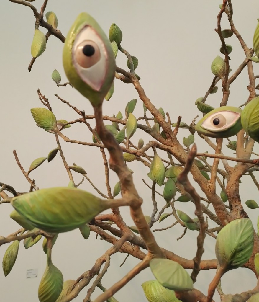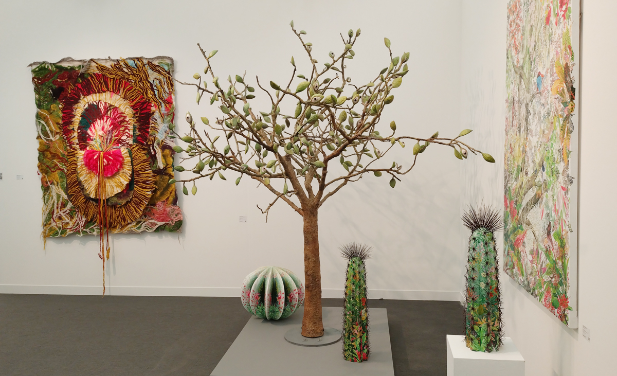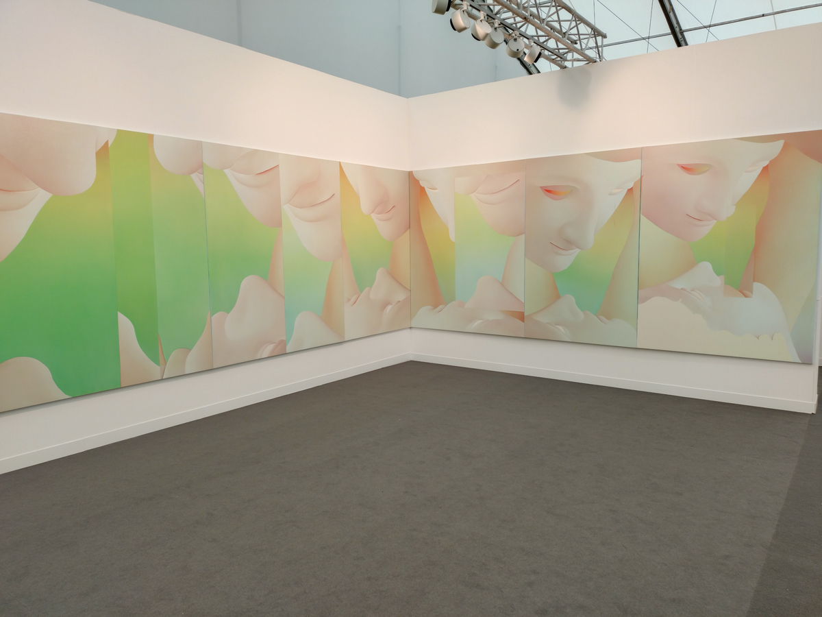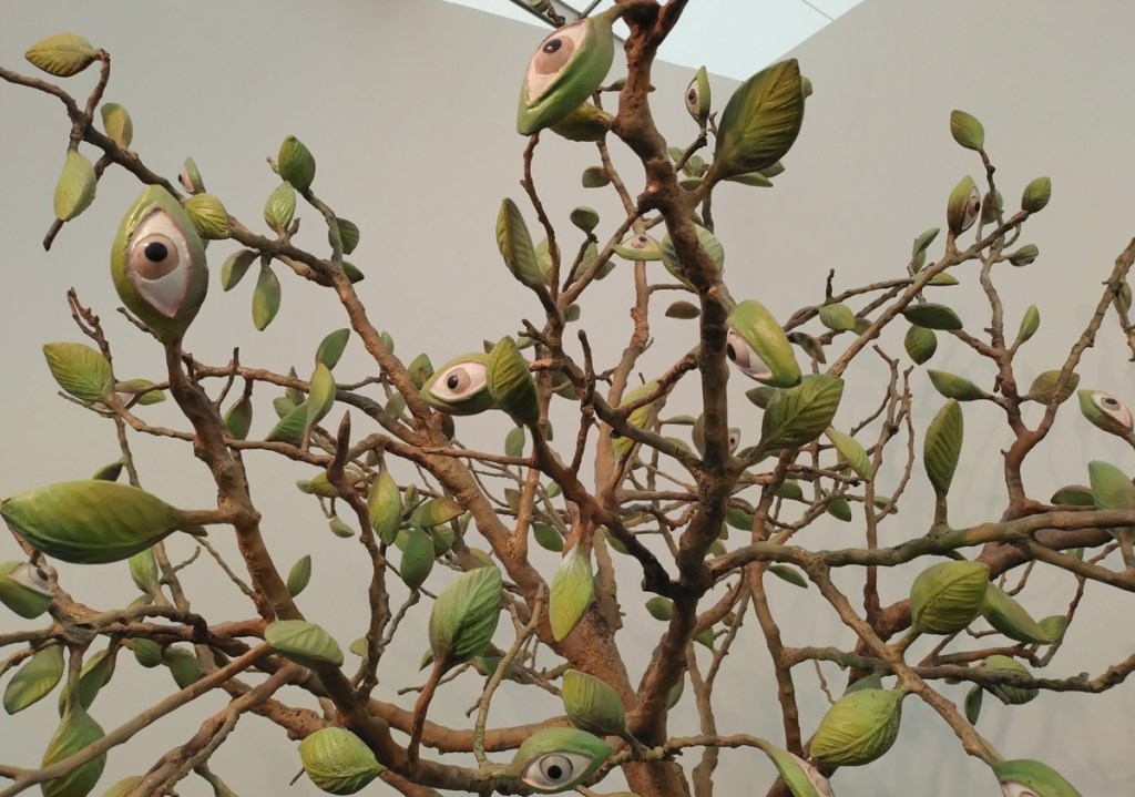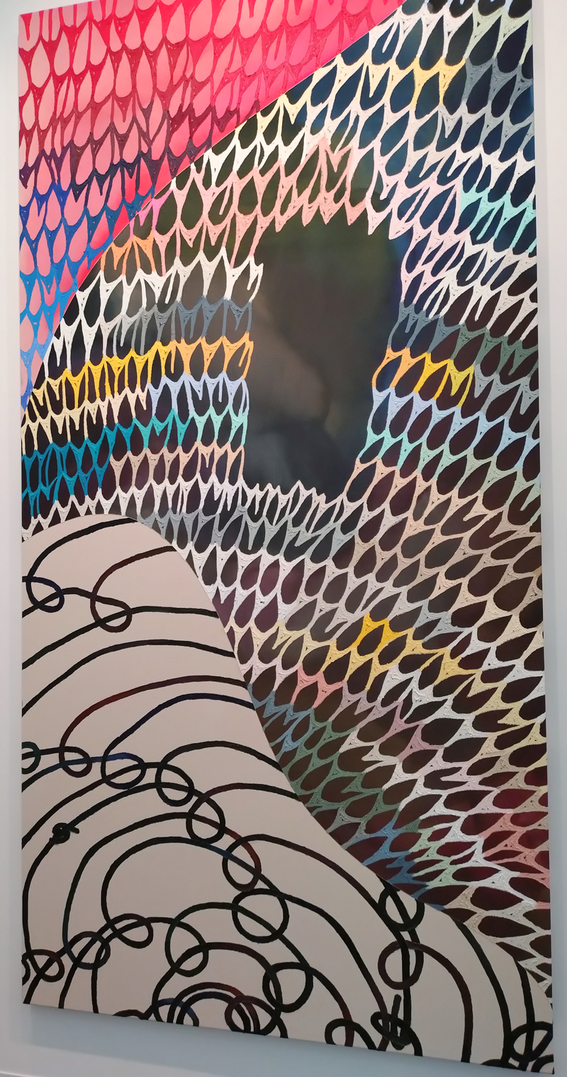 There are Vanessa Raw‘s pieces, a Margate-based painter presented by Carl Freedman Gallery, Vanessa’s paintings stand out, and yes, of course there’s good art in here. Timothy Taylor gallery’s presentation of Eddie Martinez‘s Studio Wall Redux holds interest, Sagarika Sundaram‘s mix of wool, silk and bamboo is a delight of a wall hanging, New Delhi’s Nature Morte Gallery always bring something different to Frieze, they are almost always one of the delights of the fair, don’t know who was responsible for their tree of eyes piece, Suhasini Kejriwal maybe?