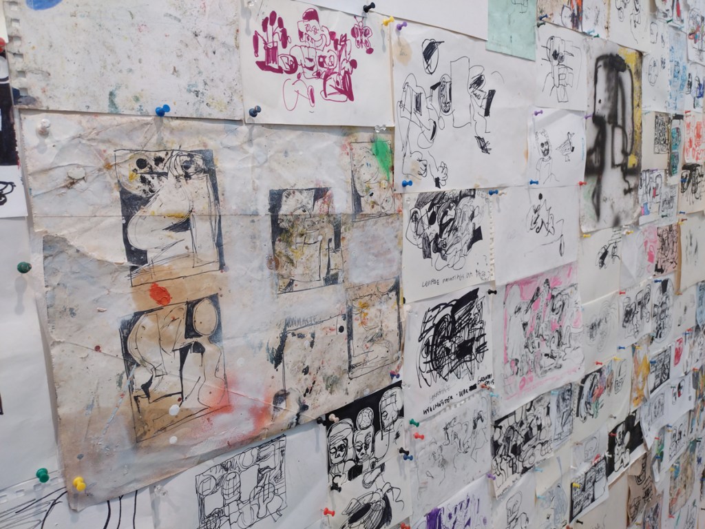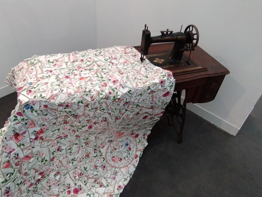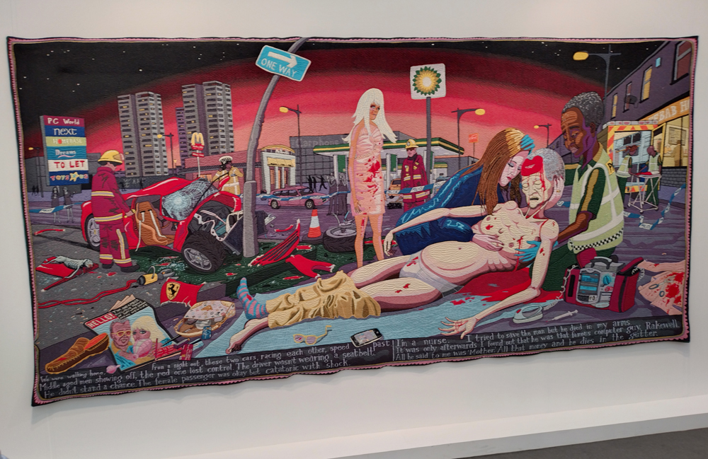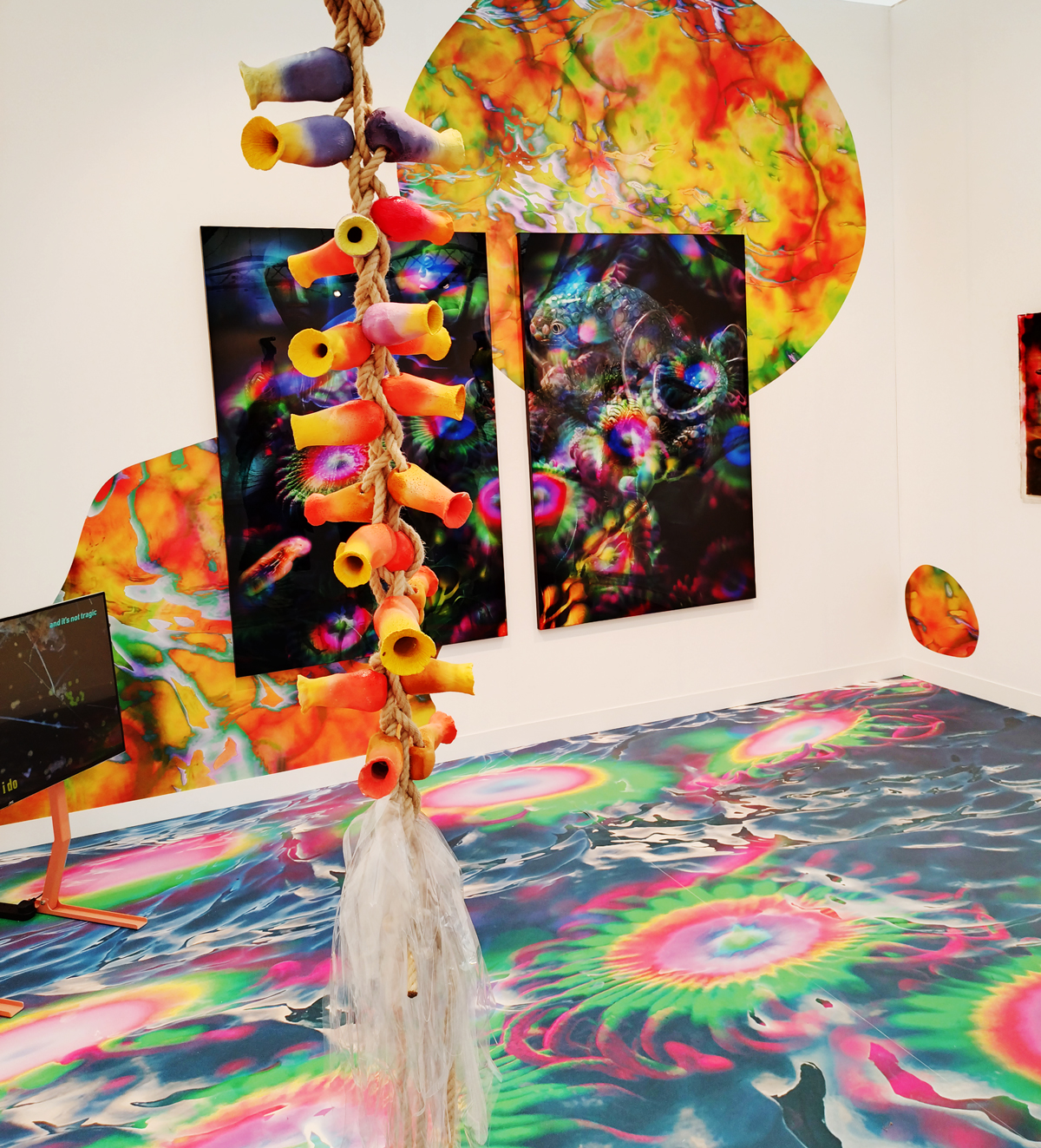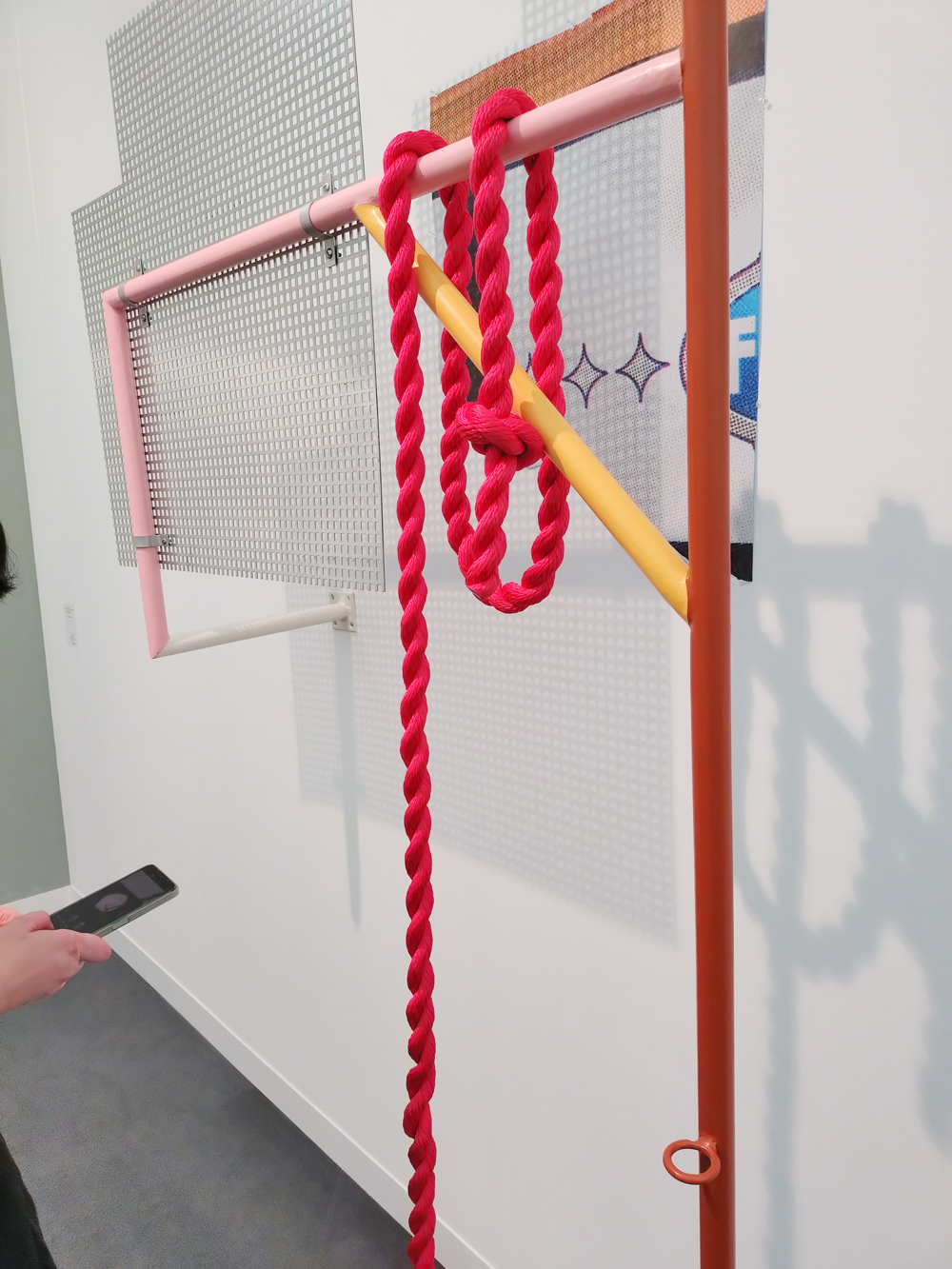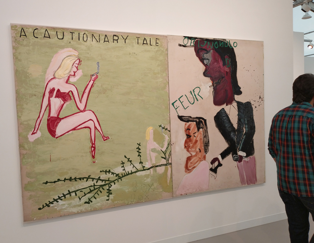 There are Vanessa Raw‘s pieces, a Margate-based painter presented by Carl Freedman Gallery, Vanessa’s paintings stand out, and yes, of course there’s good art in here. Timothy Taylor gallery’s presentation of Eddie Martinez‘s Studio Wall Redux holds interest, Sagarika Sundaram‘s mix of wool, silk and bamboo is a delight of a wall hanging, New Delhi’s Nature Morte Gallery always bring something different to Frieze, they are almost always one of the delights of the fair, don’t know who was responsible for their tree of eyes piece, Suhasini Kejriwal maybe?
