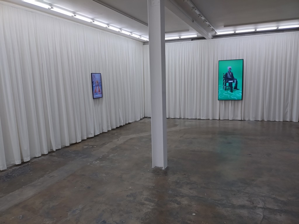 Enveloped in recognisable chroma green, the colour used in filmmaking that enables an actor to be lifted out of context and inserted elsewhere during post-production, the second space in the exhibition comes to represent a space of potentiality. A group of five faceless portrait busts gaze outwards, nobly displaying the wigs used during filming. At once everywhere and nowhere, the viewer becomes implicated within the artist’s acknowledgment of an individual’s relationship and reflection of their shifting context”.