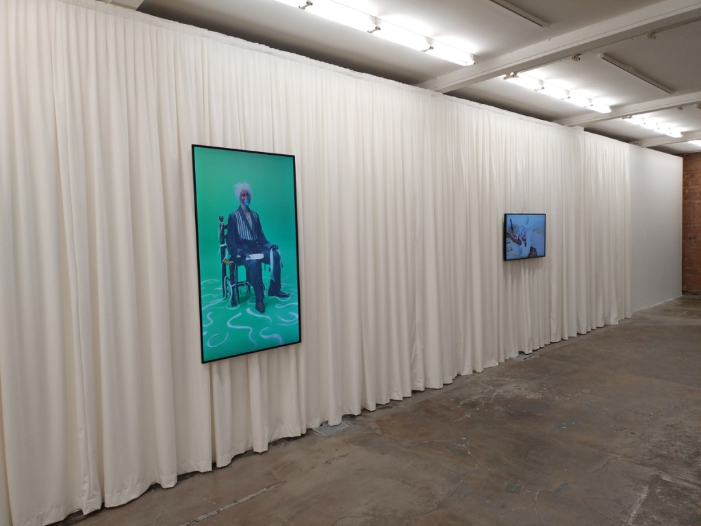 Theatricising the walls of the gallery, softly folded and flowing white velvet curtains run across all three walls of Portraits from floor to ceiling. Displayed in front of this, each of these new silent films loops continuously. The gesture of lifting screens onto the walls situates them within a lineage of painting, thereby historicising new narratives and identities via a continually expanding and developing cast of characters. The films themselves each reference a famous artwork from history, including Man Ray, Kiki with African Mask (1926); Caravaggio, Narcissus (1597–1599), Frida Kahlo, Self-Portrait with Cropped Hair (1940); Leonardo da Vinci, Mona Lisa (1503) and Lu Zhi, Chuang Tzu Dreaming Of A Butterfly (Ming Dynasty). Inserting their characters into an art historical lineage allows Sin to self-historicise their own practice while interrogating the positionality of the storyteller as a creator of histories. By blurring the boundaries of fantasy and reality in this way, the artist seeks to challenge the hegemonic narratives of history and asserts that image-making offers both the representation and creation of reality.