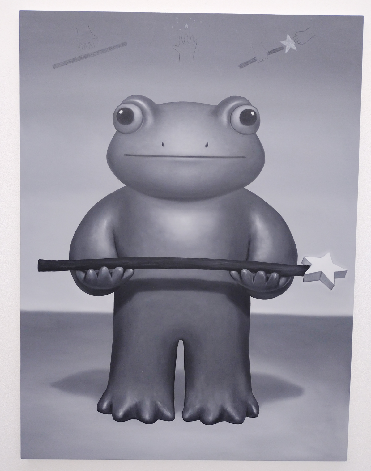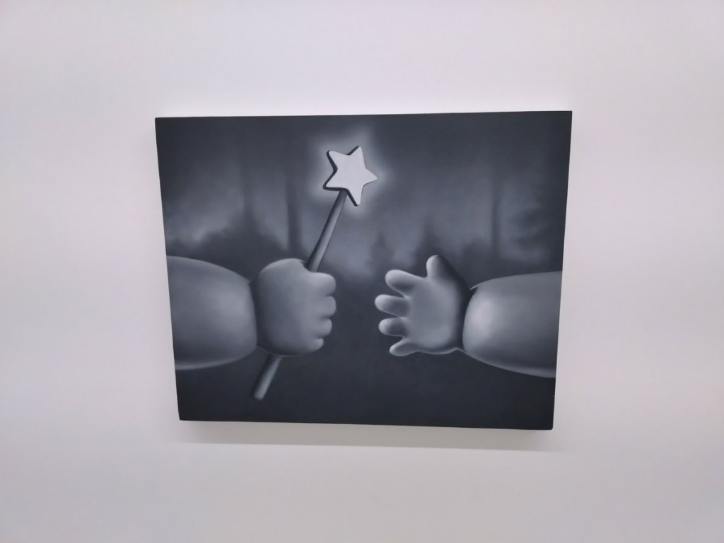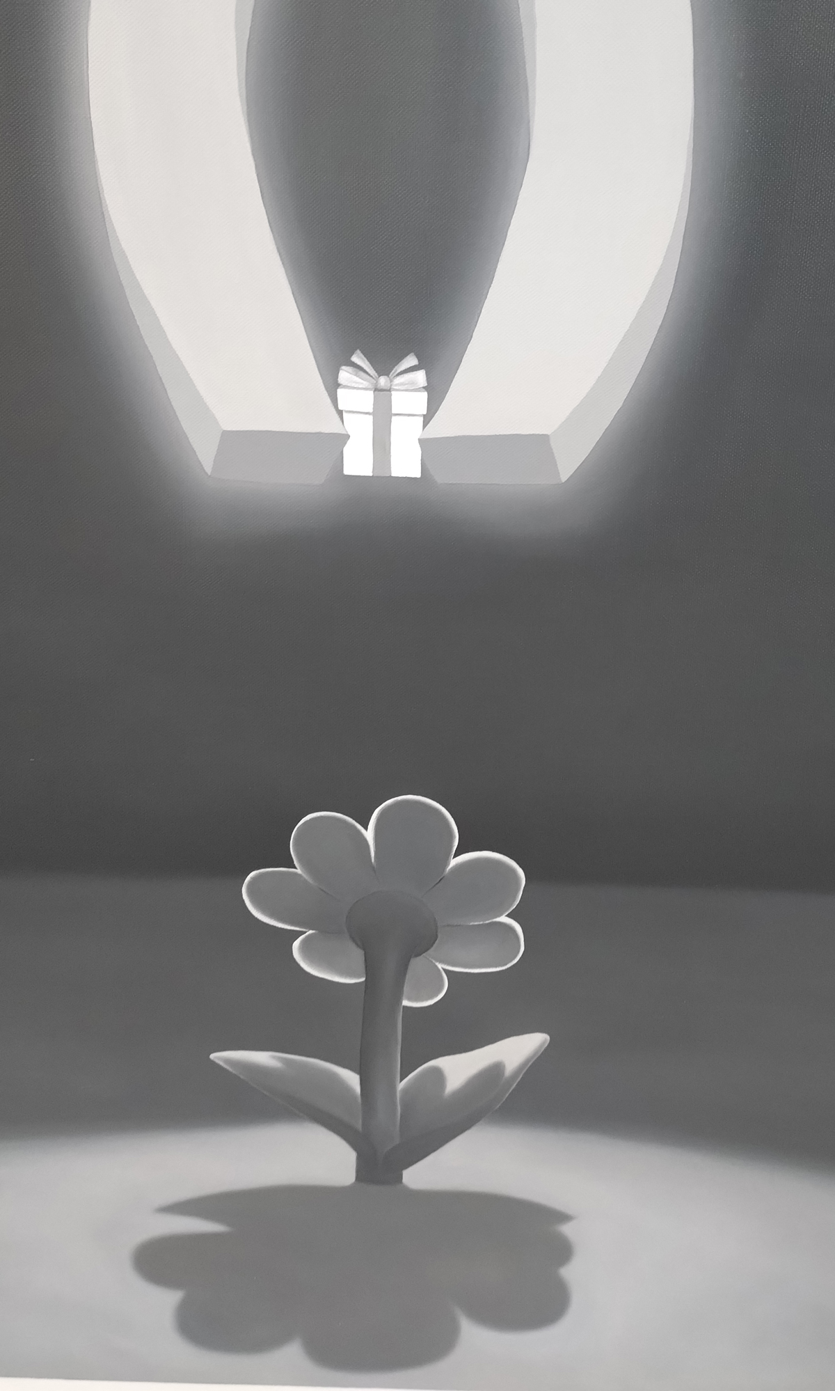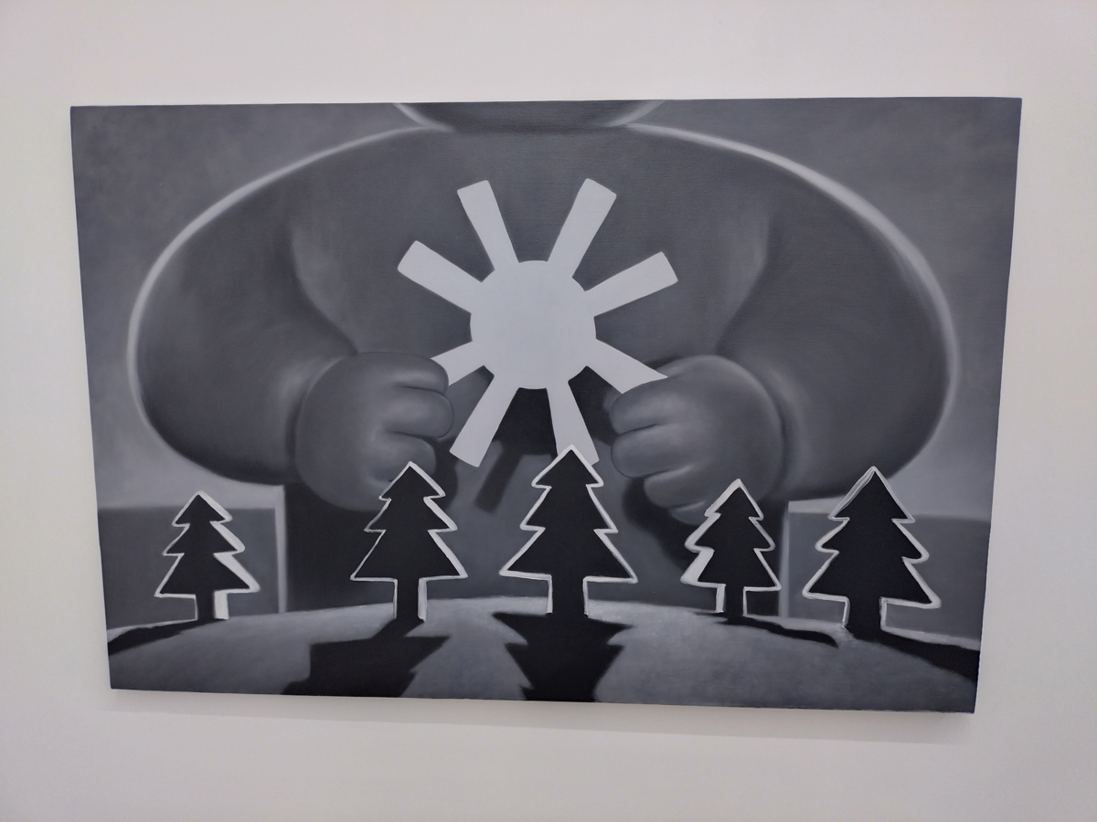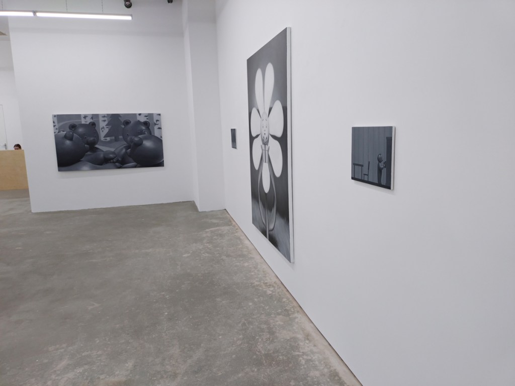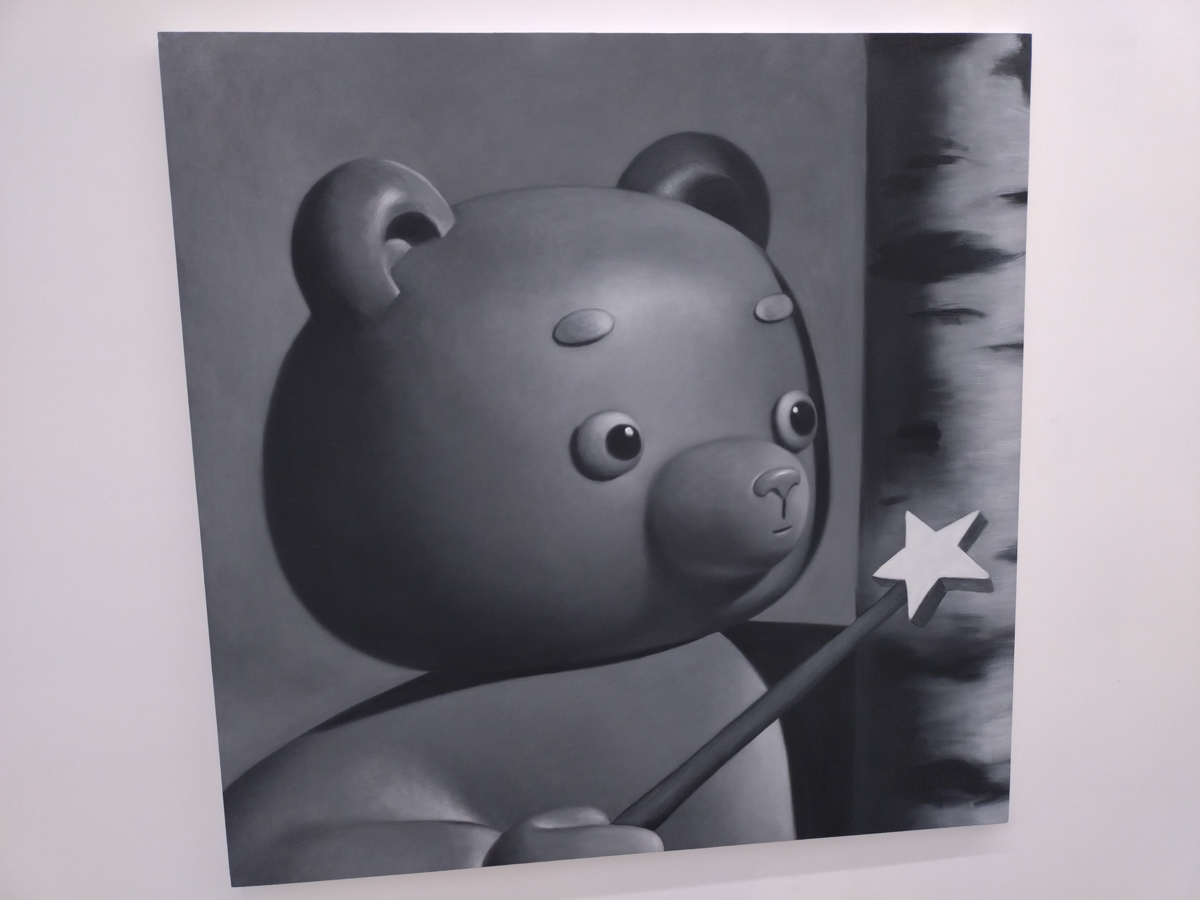Yes, It is all very slick, comic bookish, greyscale, kind of cold but at the same time kind of almost very nearly warm (in this not the warmest of rather brutalist gallery spaces) – “The works of Aleksey and Anton Tvorogov portray fragments of a fairy tale, using various mediums such as oil and acrylic paintings and sculptures. They use the languages of animation, comics, video games, book illustrations and puppet shows” – and yes, as the gallery statement points out, I guess you could say the first visual languages that people learn and use to shape their world view. I don’t know, is it just slick? Is it anything more? The Gift For The Flower? A flower? Is it a silent commentary? Positively plotless? Is being plotless a thing for them? Autonomous fragments rather than linear storytelling? A flower? A dirty great daisy? Are we invited to just wander freely or show we, the viewers, dive deeper? To go off and things? I don’t know? I kind of like these paintings, they are kind of slick, probably too slick and I do wonder why they’re here? Why I’m here? Here and now? I kind of like it, glad I made the effort, I didn’t really engage with any of it, no real emotion on my part, I don’t feel the need to shout that you need to go, that any of this really matters, it was all kind on “nice” in a kind of cold plotless way, is that what they wanted? (sw)