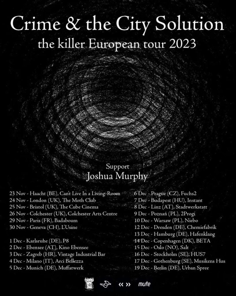 Crime and The City Solution at Moth Club, Hackney, London, 24th November 2023 – Well what can be said about that one? It was damn good, let’s nail that in place right from the start, despite the usual not so good Moth Club sound and an annoying curfew that had the band off stage with barely an hour played, them clearly wanting to do more and with it not even being ten o’clock on a Friday night! Surely someone should have worked this out and scheduled them to start earlier? If I wasn’t on the freeloader press list I’d be well pissed off, as it is you’re not getting any of my ‘ard earned beer money Moth Club, I’m off to Helgi’s where the DJ is probably playing Angel Witch and Mythra records way into the night. The Moth Club is a tacky dive, it is kind of good tacky, actually we’ve got four decent music venues on Mare Street right now, three of them probably better than the Moth Club where you half expect them to still be serving Double Diamond and there to still be ashtrays overflowing. Four decent music venues on one street is fine by us seeing as the Organ bunker is also found on the self same venue-rich Hackney street, I like venues that are but a short walk away. Cut the crap I hear you cry, what about the band? What about the damn gig!