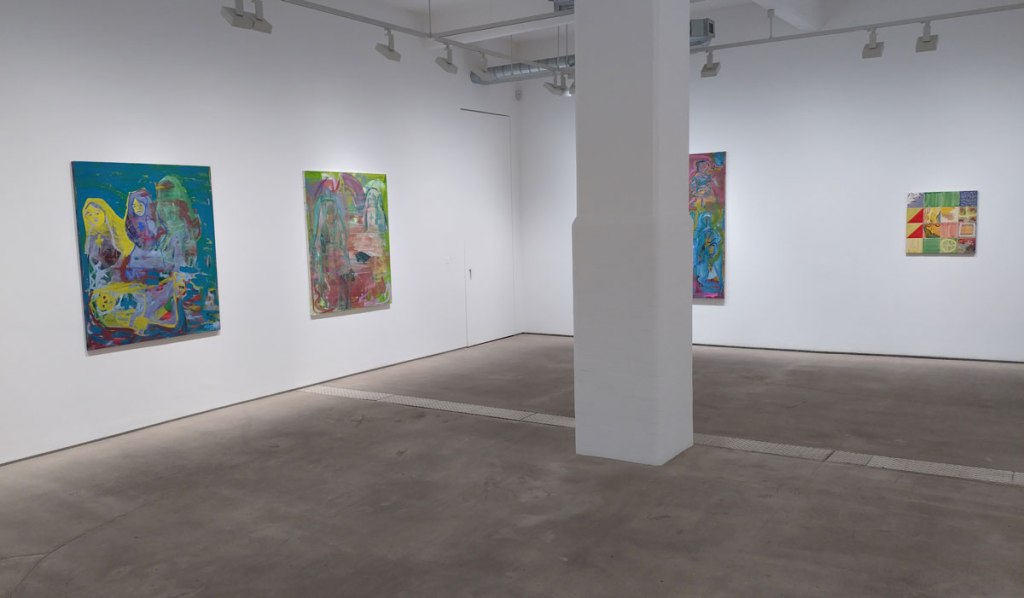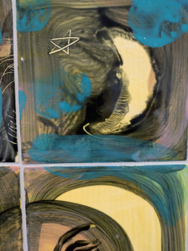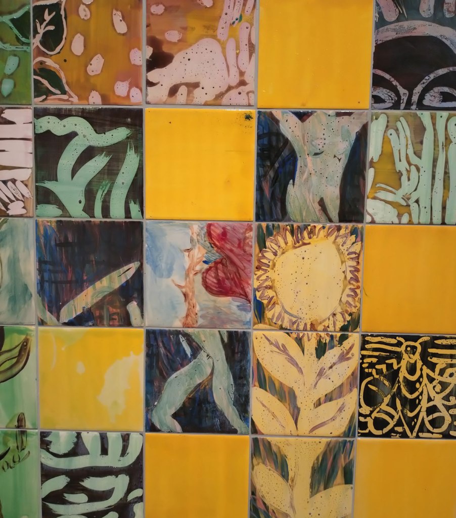 “The title of the exhibition, La Muñeca translates from Spanish to mean both ‘doll’ and ‘wrist’. For Stein this double meaning encapsulates the relationship between process and iconography in the paintings. Drawing on psychoanalysis, her works reveal multitudes, she notes: ‘they are neither illustration nor abstraction nor narrative nor process painting but all of those things and become deeper as the complexity of the relations between these frames of reference is extrapolated whilst I work.’ Stein’s connection to Spain is also of importance: as a child she spent every summer living in the village of Jesus Pobre on the Valencian coast, which she considers another “home.” Tile panelled works have been a strand of Stein’s practice since a research trip to Manises, Spain in 2013, where tile artworks line the streets”.