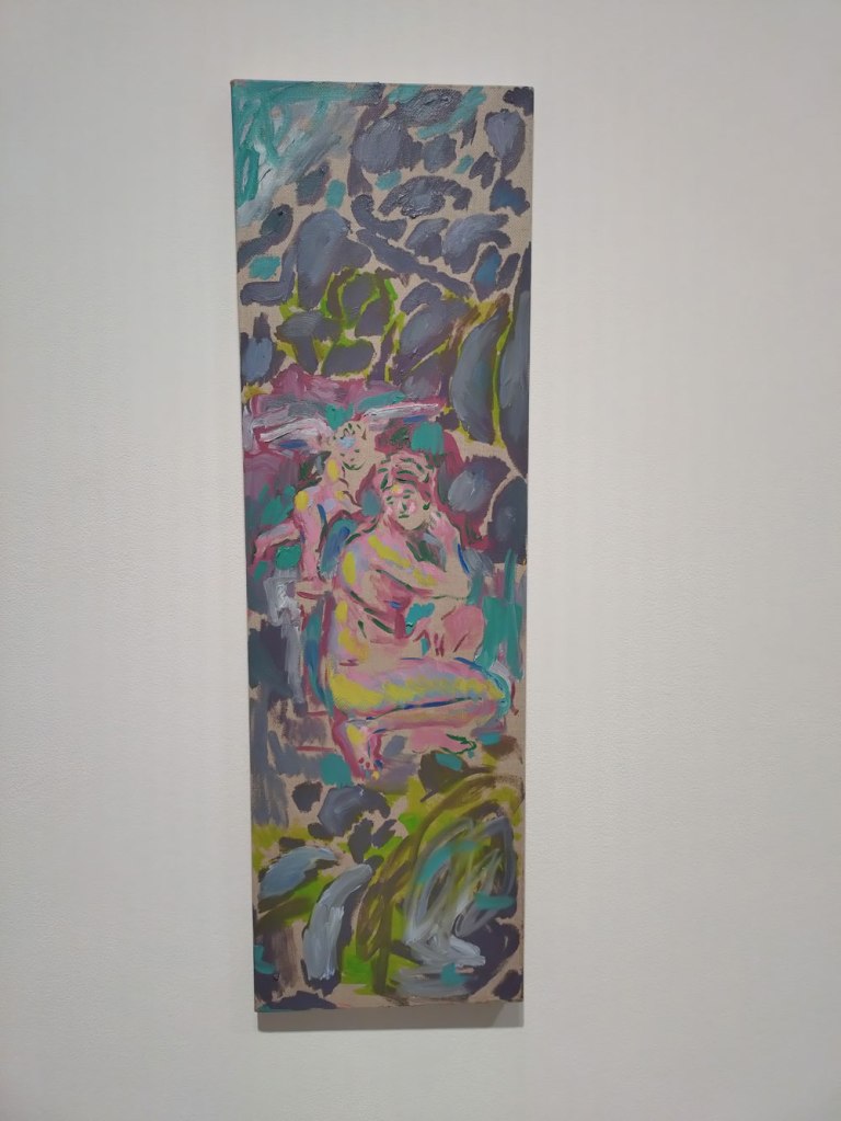 “The exhibition combines a few key motifs including depictions of Lilith – the stand in for all that is complex and vengeful in womanhood as well as a reference to the Head of St Anne by Leonardo da Vinci, relating to boundlessness and motherhood. The ghostly paintings La Muñeca (deathwatch) and La Muñeca (grannies/abuelas) depict a 1950s nurse doll, which Stein associates with her maternal grandmother who was psychic, suffered from depression and worked as a nurse. Flowers are sourced from the artist and book illustrator Walter Crane, speaking to the Golden age of mournful saccharine children’s illustration in Britain which happened at the apex of empire. By using these motifs, the works invoke childhood and foreground what is impossible to slough off politically or unconsciously, ‘cycles of guilt, complicity, pleasure and rage coexist as an exuberant swoon.’ (Stein, 2023). sw