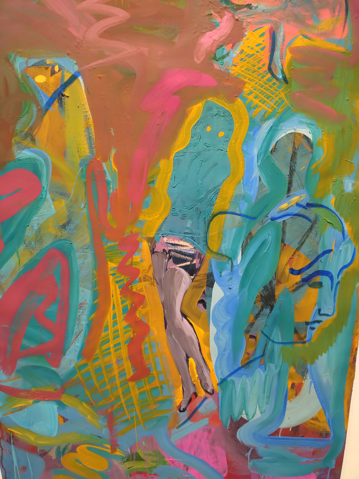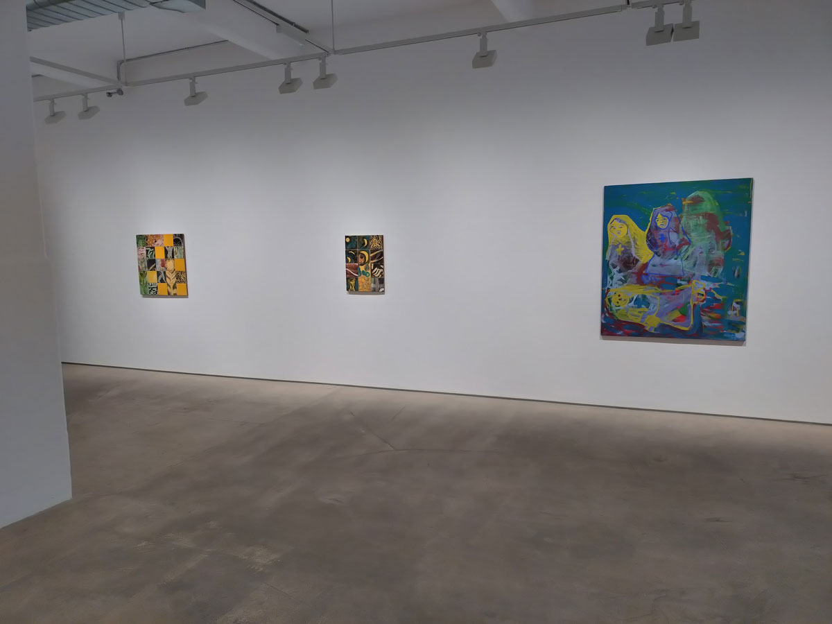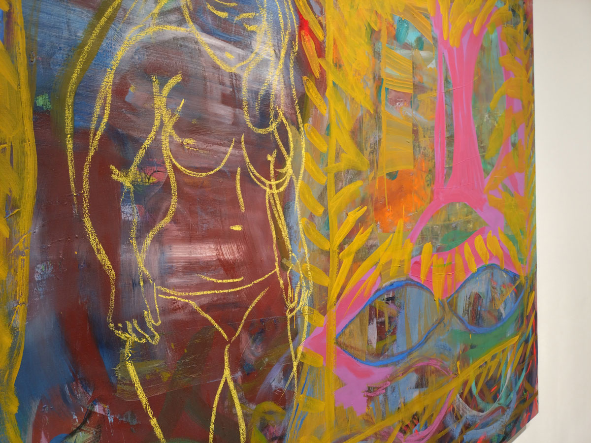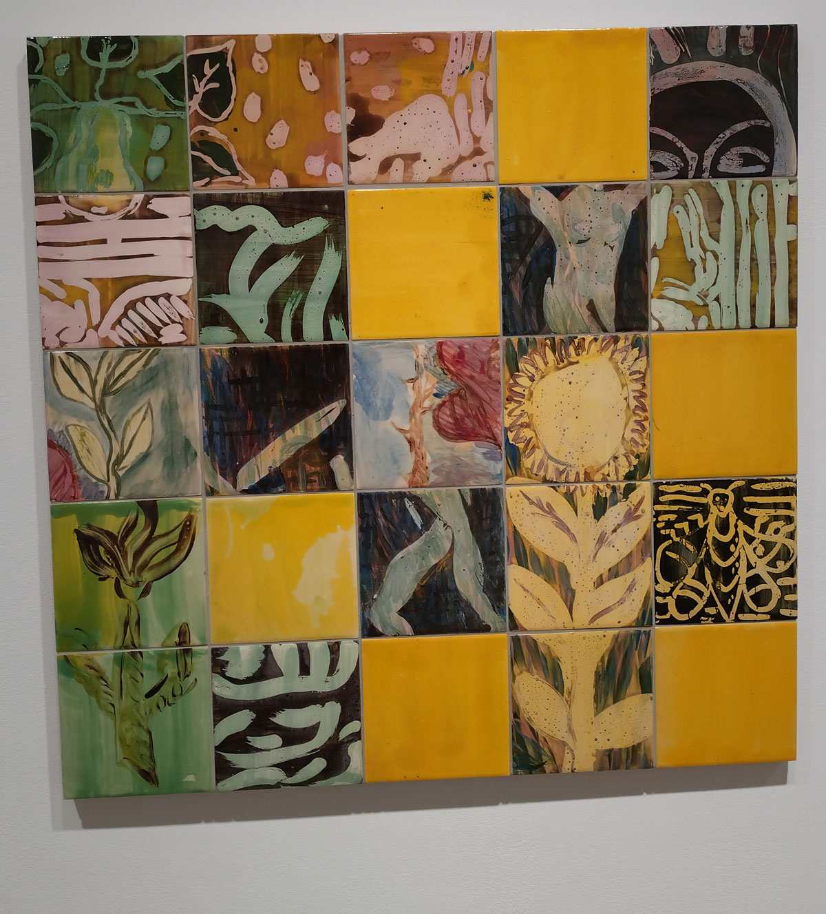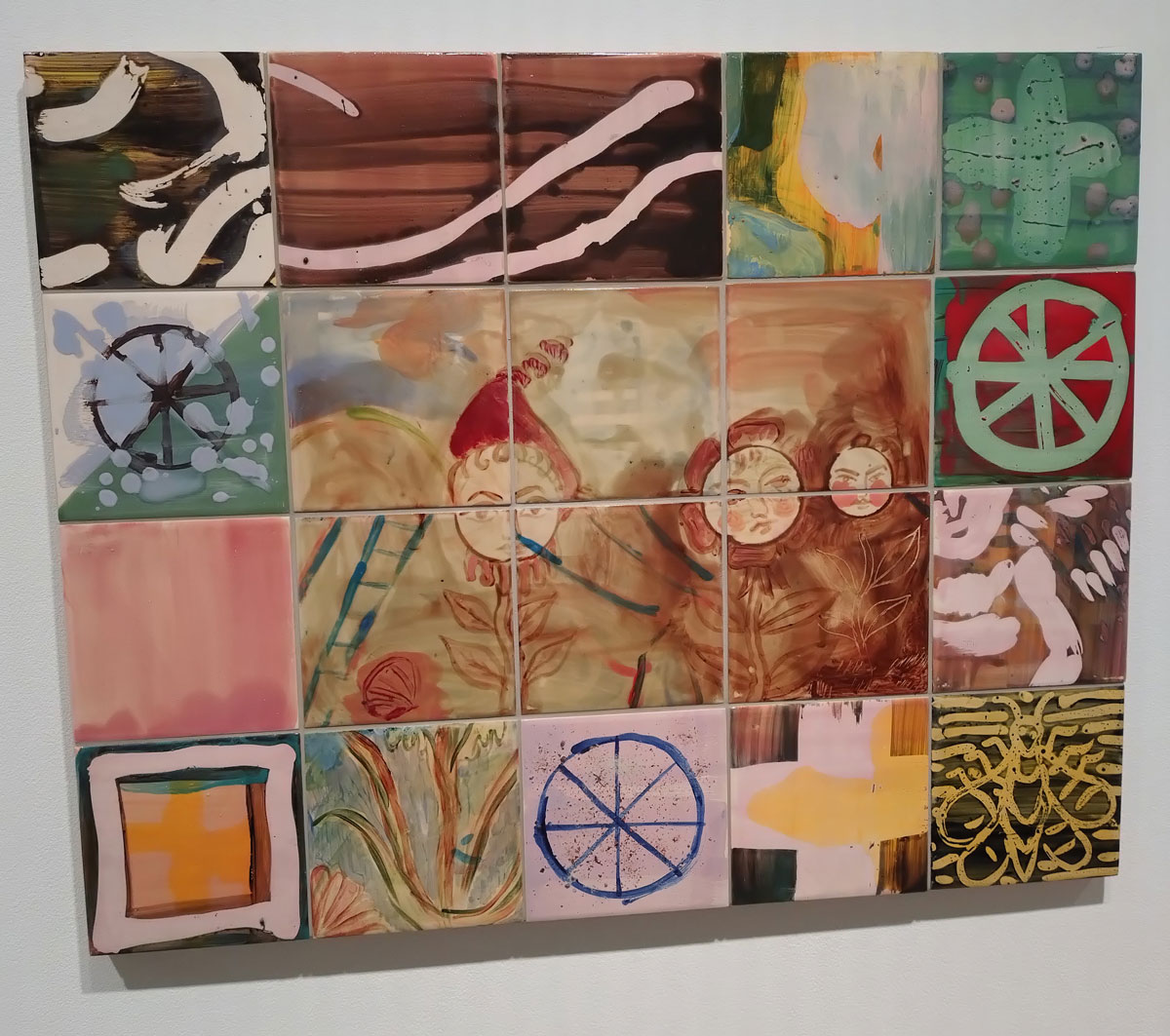 “The title of the exhibition, La Muñeca translates from Spanish to mean both ‘doll’ and ‘wrist’. For Stein this double meaning encapsulates the relationship between process and iconography in the paintings. Drawing on psychoanalysis, her works reveal multitudes, she notes: ‘they are neither illustration nor abstraction nor narrative nor process painting but all of those things and become deeper as the complexity of the relations between these frames of reference is extrapolated whilst I work.’ Stein’s connection to Spain is also of importance: as a child she spent every summer living in the village of Jesus Pobre on the Valencian coast, which she considers another “home.” Tile panelled works have been a strand of Stein’s practice since a research trip to Manises, Spain in 2013, where tile artworks line the streets”.