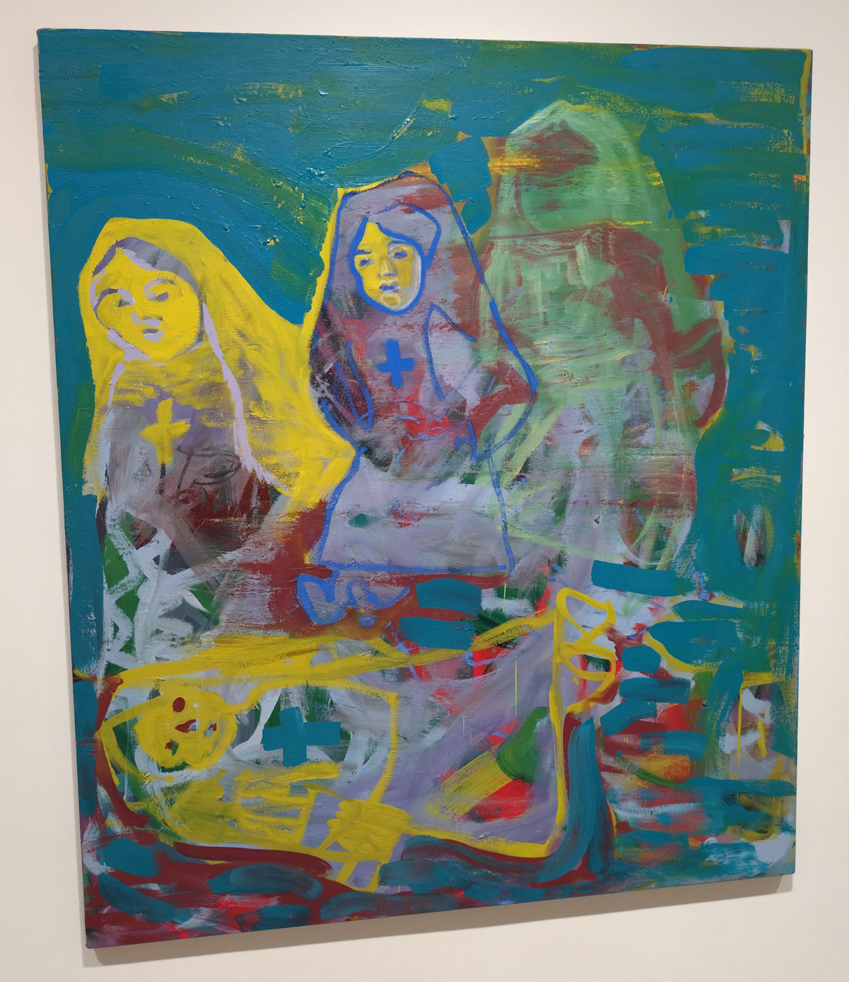 “The exhibition combines a few key motifs including depictions of Lilith – the stand in for all that is complex and vengeful in womanhood as well as a reference to the Head of St Anne by Leonardo da Vinci, relating to boundlessness and motherhood. The ghostly paintings La Muñeca (deathwatch) and La Muñeca (grannies/abuelas) depict a 1950s nurse doll, which Stein associates with her maternal grandmother who was psychic, suffered from depression and worked as a nurse. Flowers are sourced from the artist and book illustrator Walter Crane, speaking to the Golden age of mournful saccharine children’s illustration in Britain which happened at the apex of empire. By using these motifs, the works invoke childhood and foreground what is impossible to slough off politically or unconsciously, ‘cycles of guilt, complicity, pleasure and rage coexist as an exuberant swoon.’ (Stein, 2023). sw