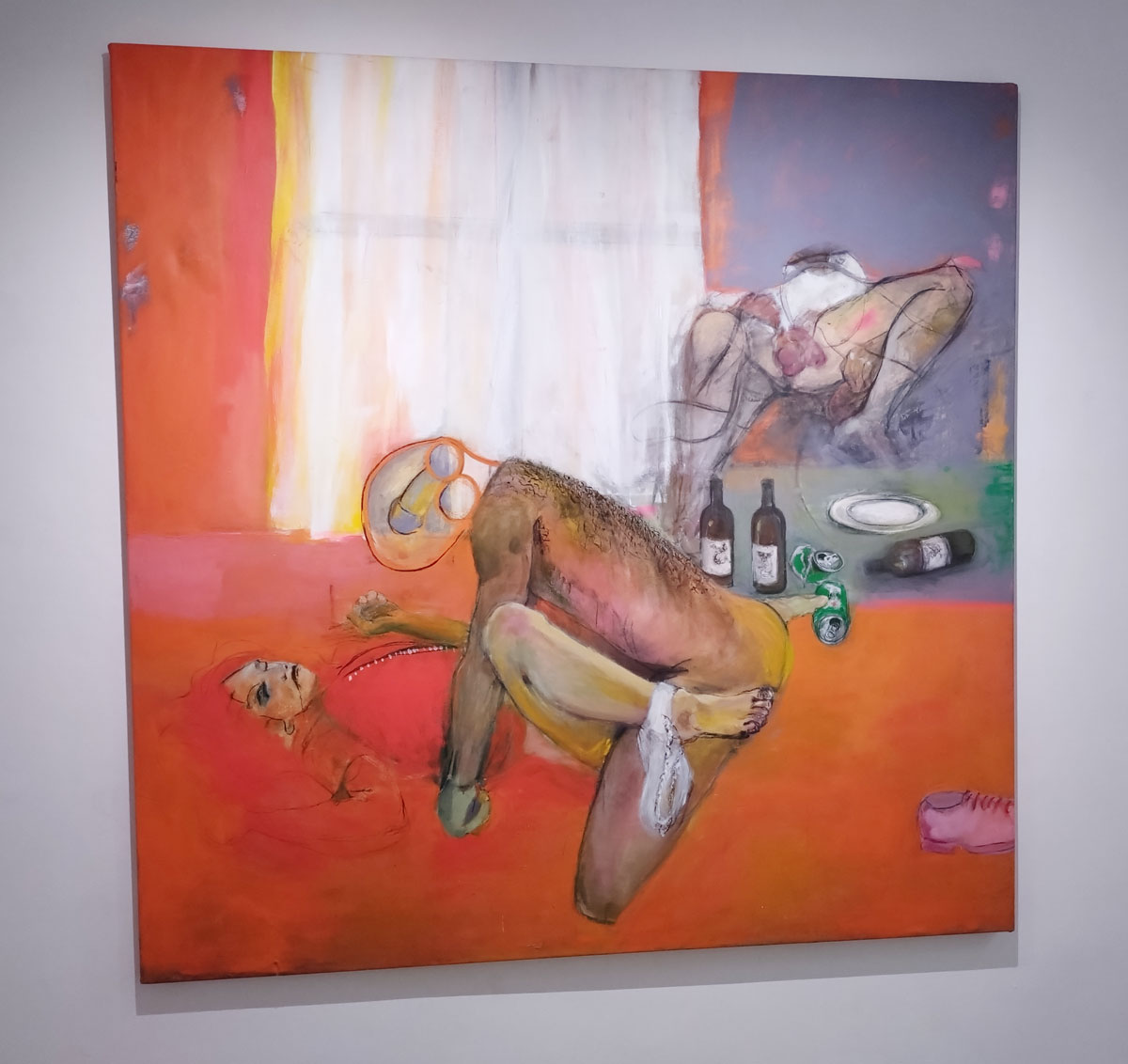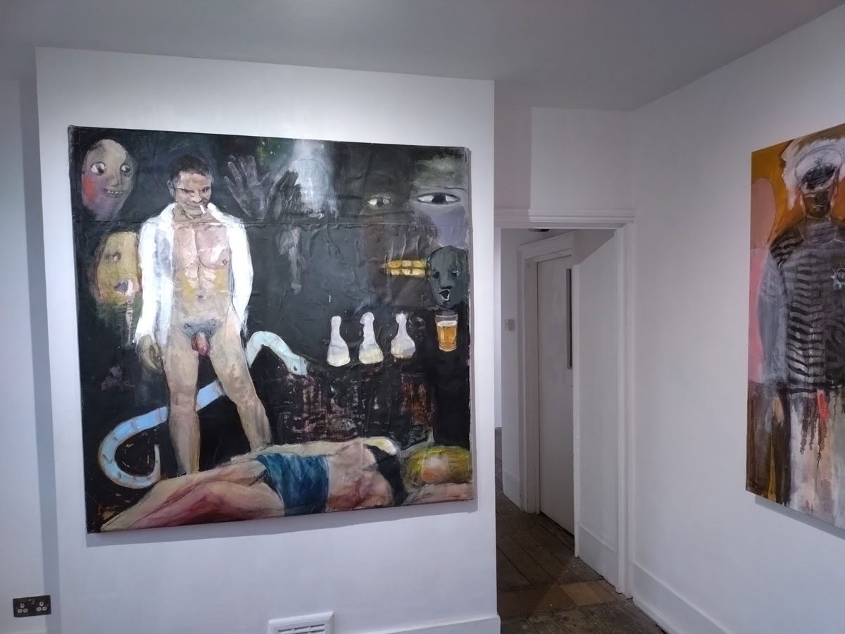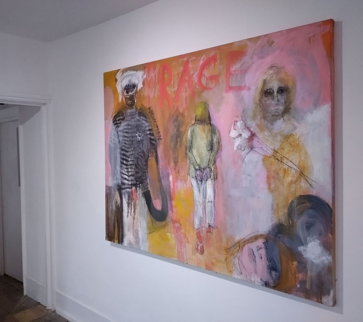 Wanted to catch this one at a quiet time rather than during all the noise of the opening, wanted to walk in without any advance warning or bites of social media imagery, kind of expected something powerful and wow! Gina Birch has been very very busy since that last show here in the same gallery back in October 2022, This is immediate, this is bigger, bolder, her work as a painter has always been strong, always been challenging, always been forthright, it has always been exciting, right back to those wonderful shoe paintings that she showed at the back of a Hackney junk shop a dozen or so years ago and yes her paintings do look like the work of a Raincoat – the way we look at Gina Birch’s paintings can’t help but be informed by what we already know from her music and really there is no real divide here between the strident painter and the respected punk rock musician. But but but, there’s something more here and this 2023 Gallery 46 show feels like far more than her rather good 2022 show. Is she a more confident painter now? Is she happier to commit more to large canvases? Is there more being said? Revealed? Is happier the right term, not happier, not more confident, maybe more knowing, maybe a little more comfortable in her painting boots that she may have previously been and no, these don’t feel like happy paintings, they do feel like positive paintings though, cathartic maybe? They do feel like honest paintings, autobiographical? Nothing is ever too obvious, do like the twists and the turns, do like this show even more that last time, yes! Strange thing to say but I feel good oh her behalf!